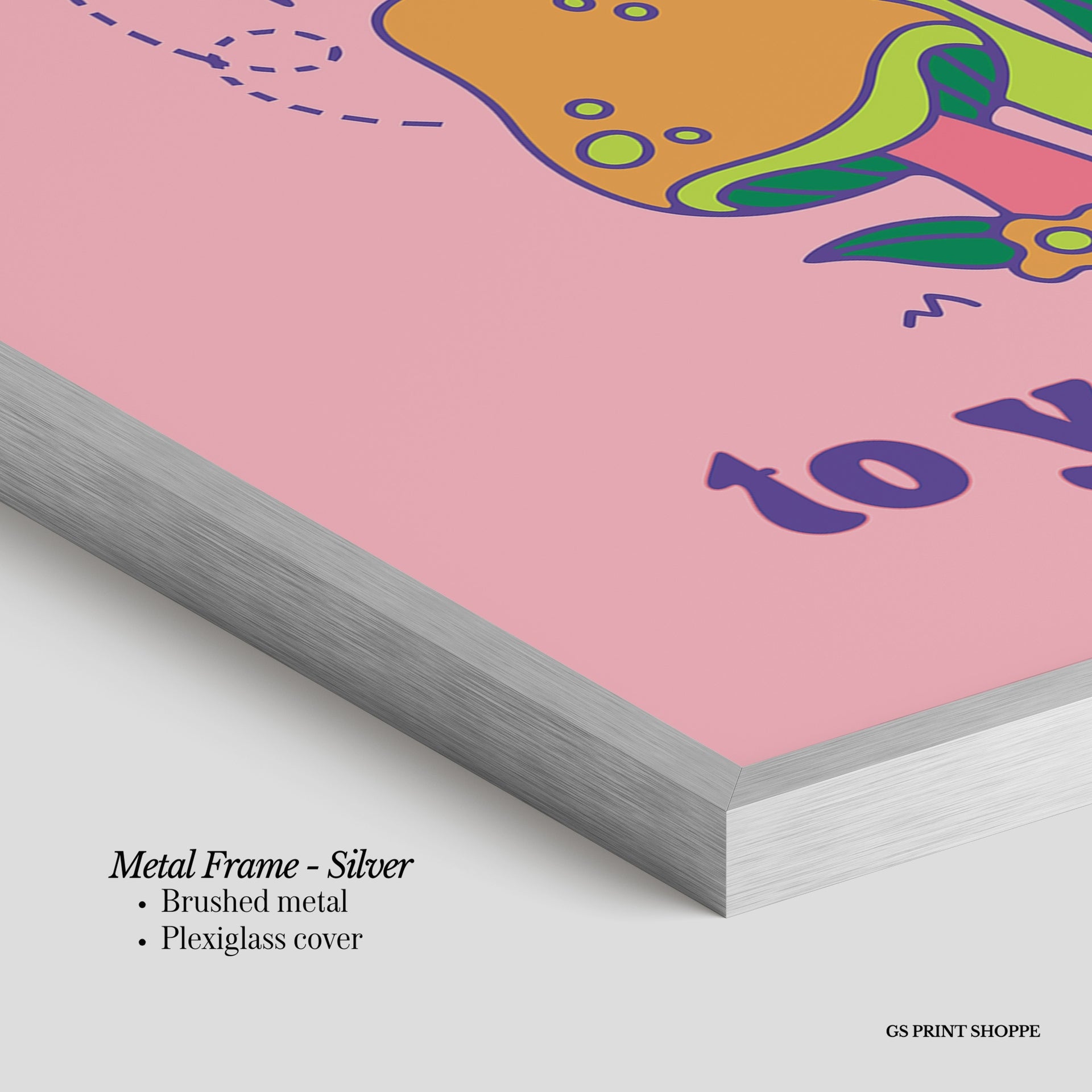 Metal Frame: Sleek and modern, our metal frame is crafted with brushed metal for a polished finish. It comes with durable plexiglass and sturdy metal hangers for horizontal or vertical display.