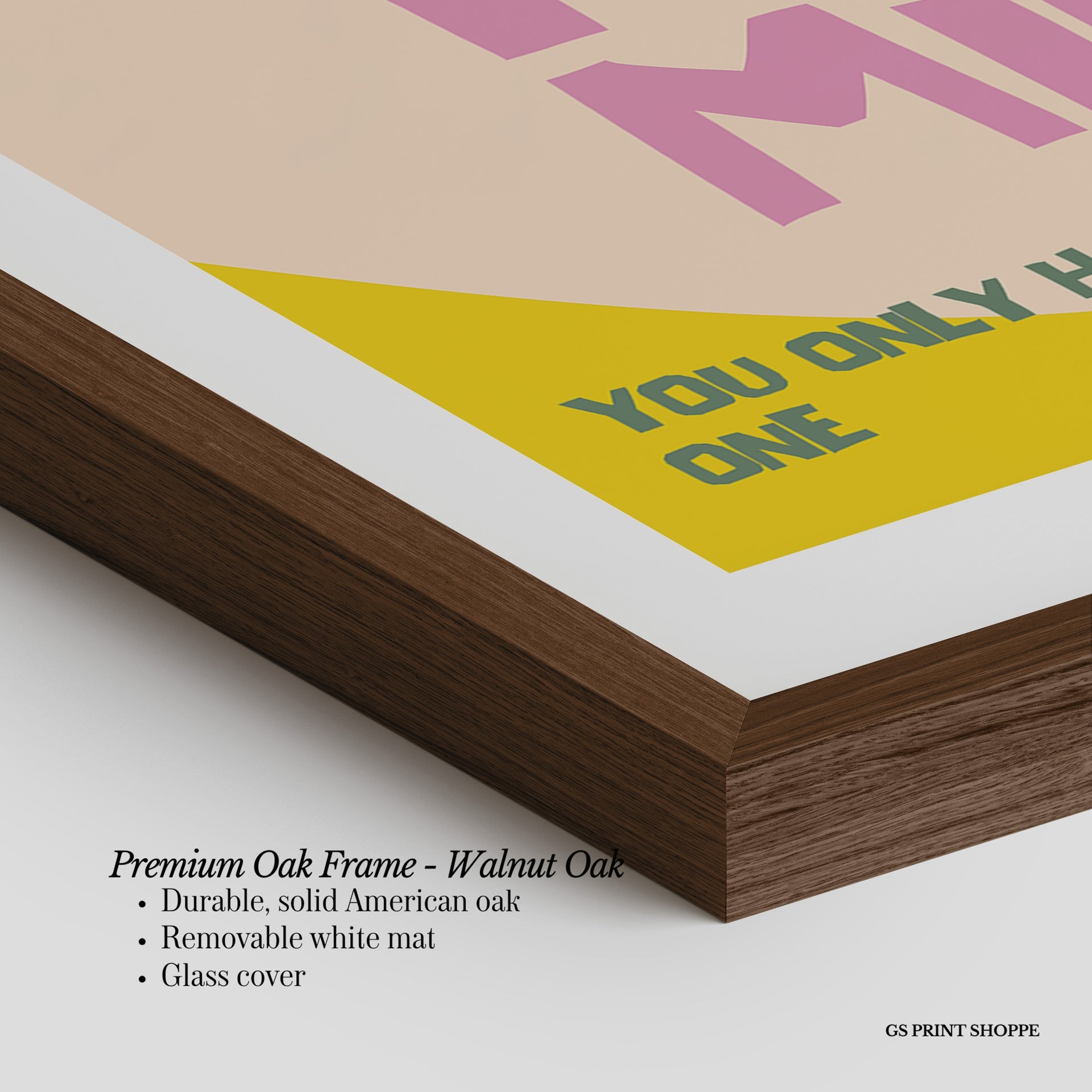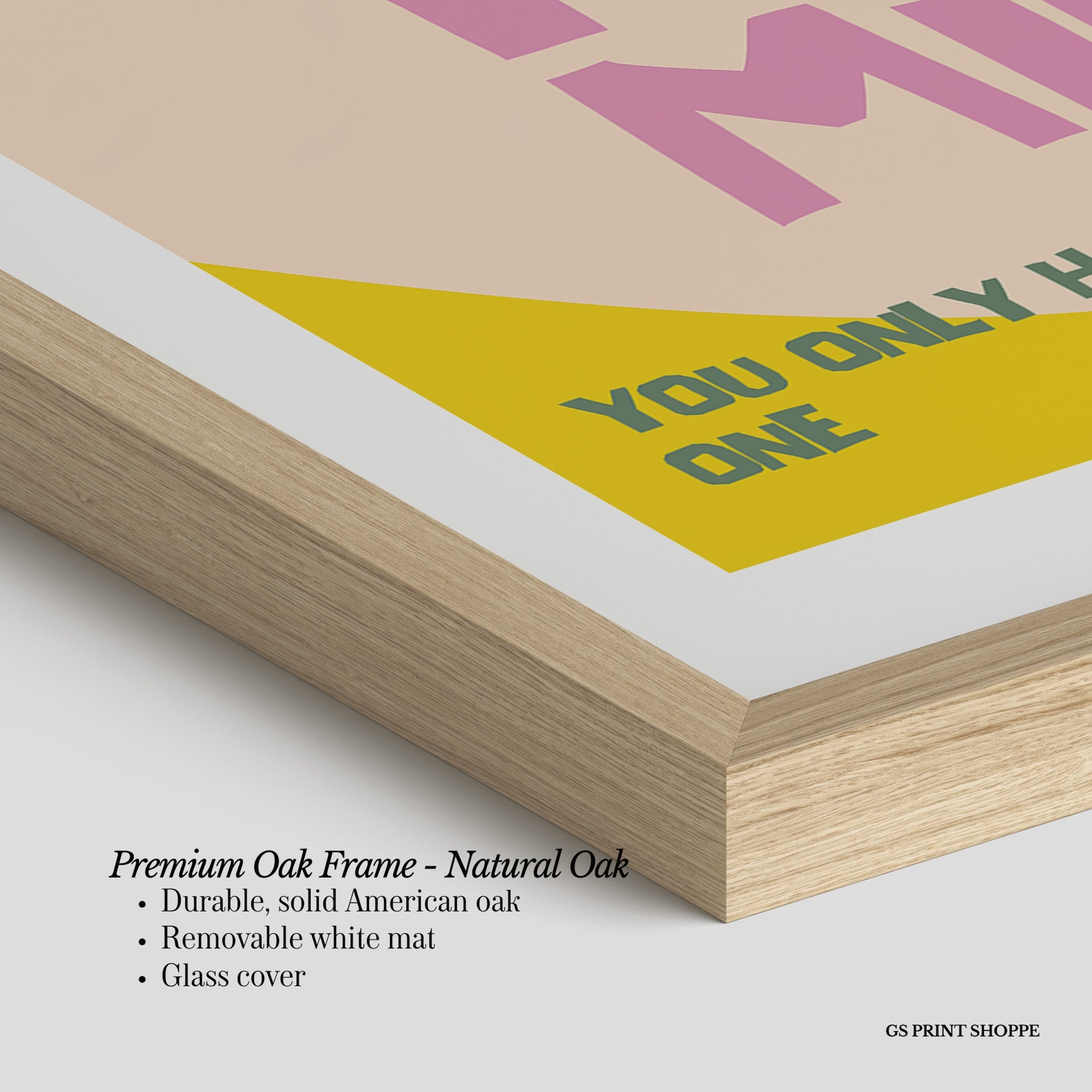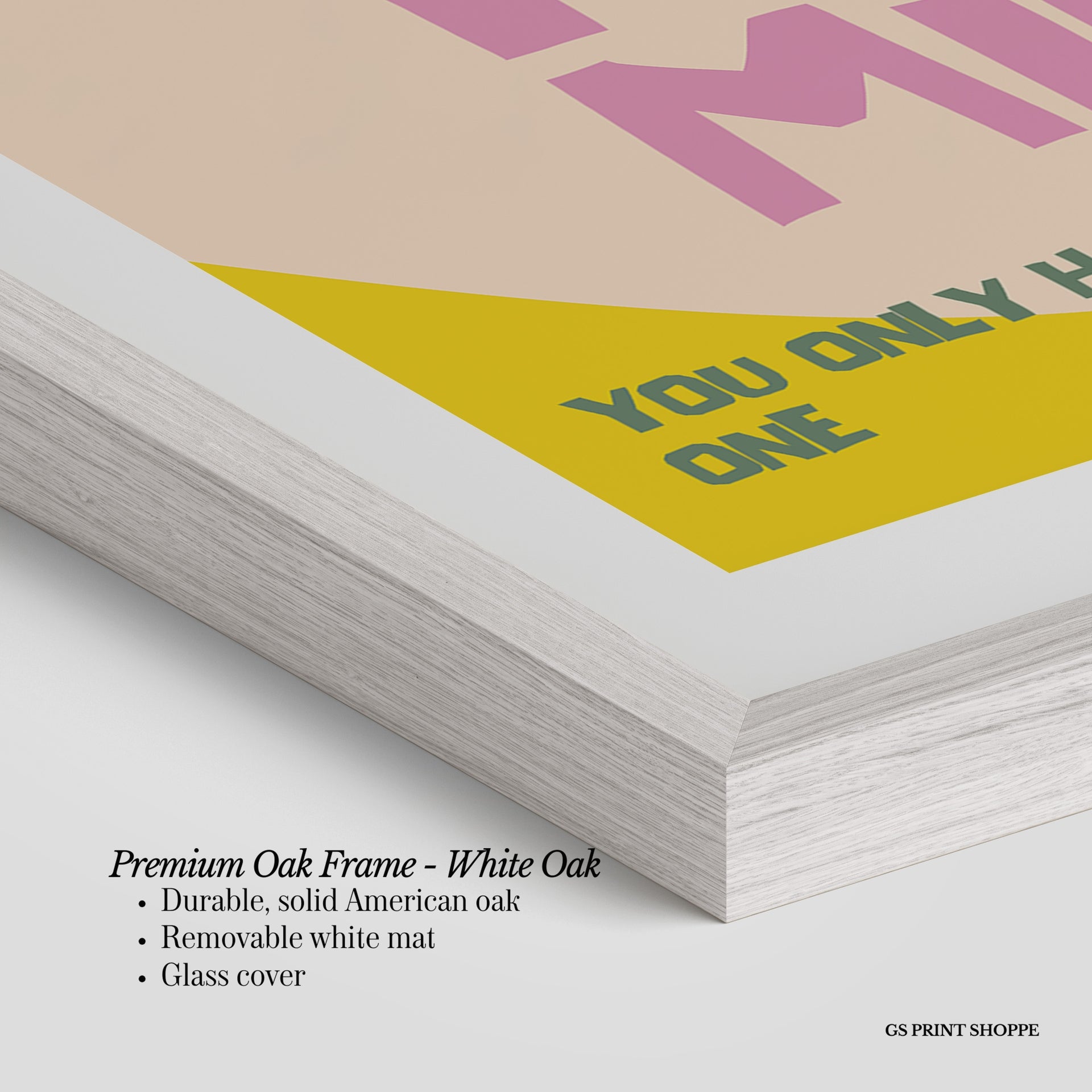 Premium Oak Frame: Our premium oak frame is crafted from solid American oak, offering a warm, natural feel with a high-end finish. We complete this elevated offering with a bright white removable mat and real glass for a versatile and polished look.
