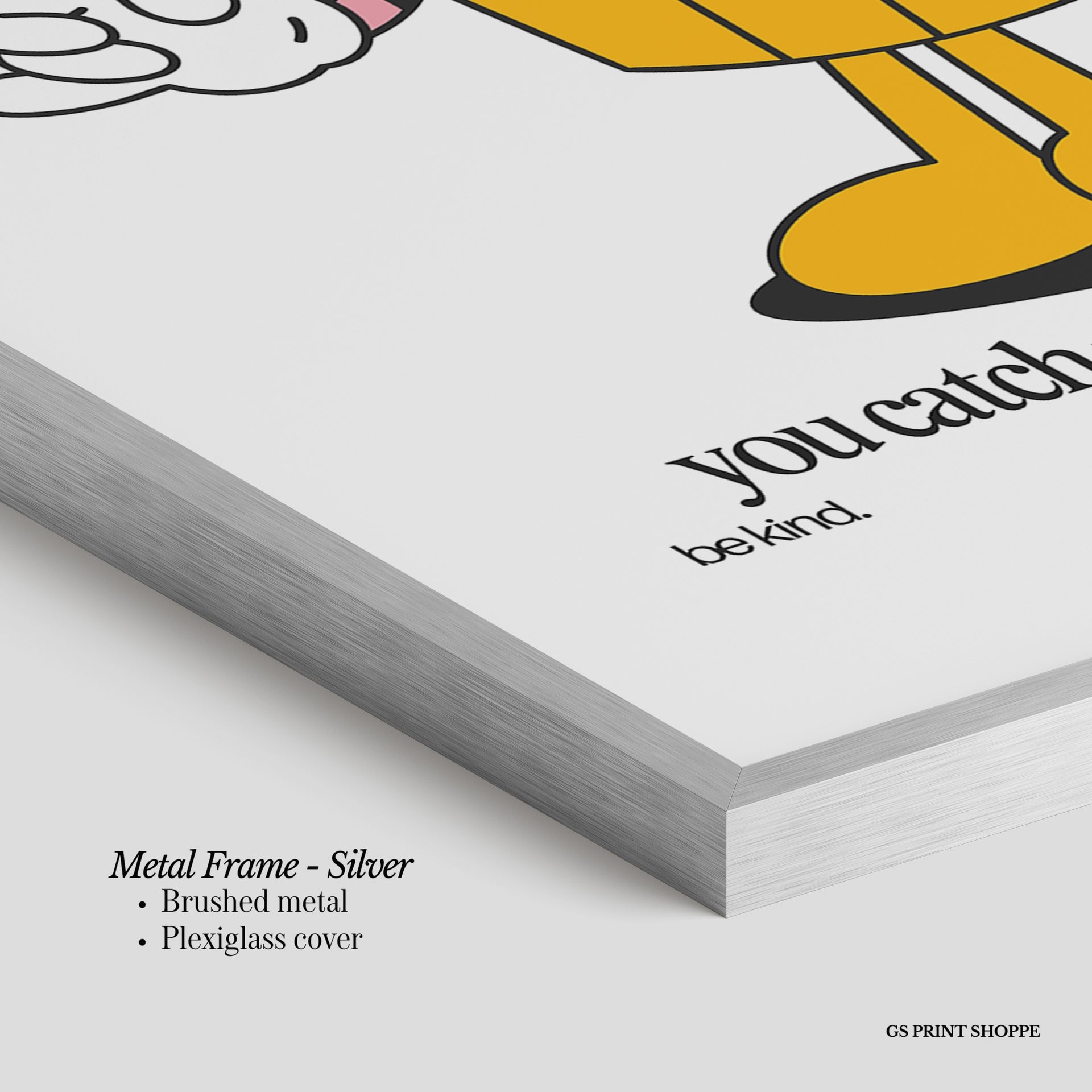 Metal Frame: Sleek and modern, our metal frame is crafted with brushed metal for a polished finish. It comes with durable plexiglass and sturdy metal hangers for horizontal or vertical display.