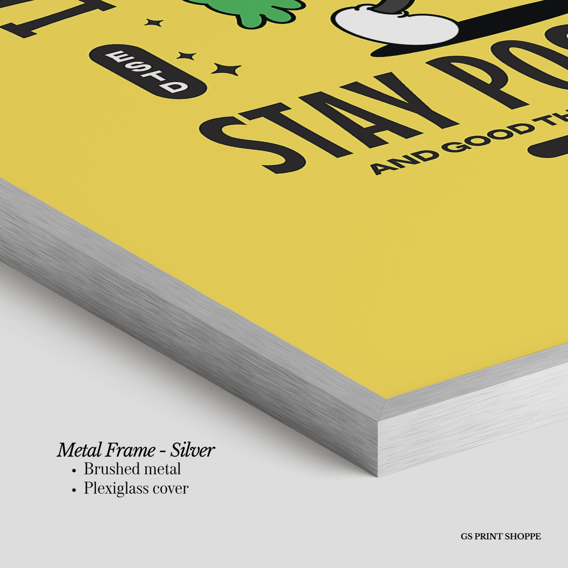 Metal Frame: Sleek and modern, our metal frame is crafted with brushed metal for a polished finish. It comes with durable plexiglass and sturdy metal hangers for horizontal or vertical display.