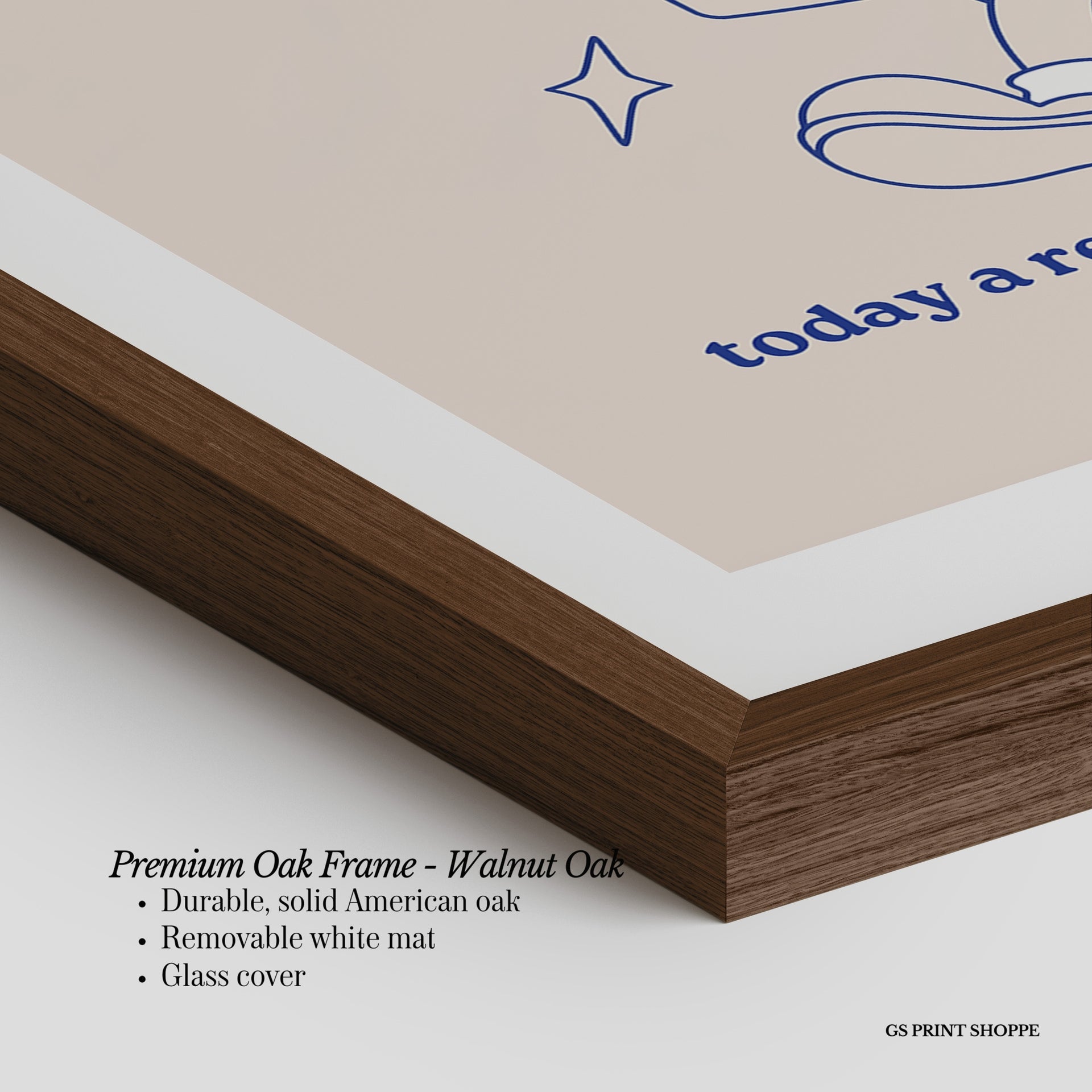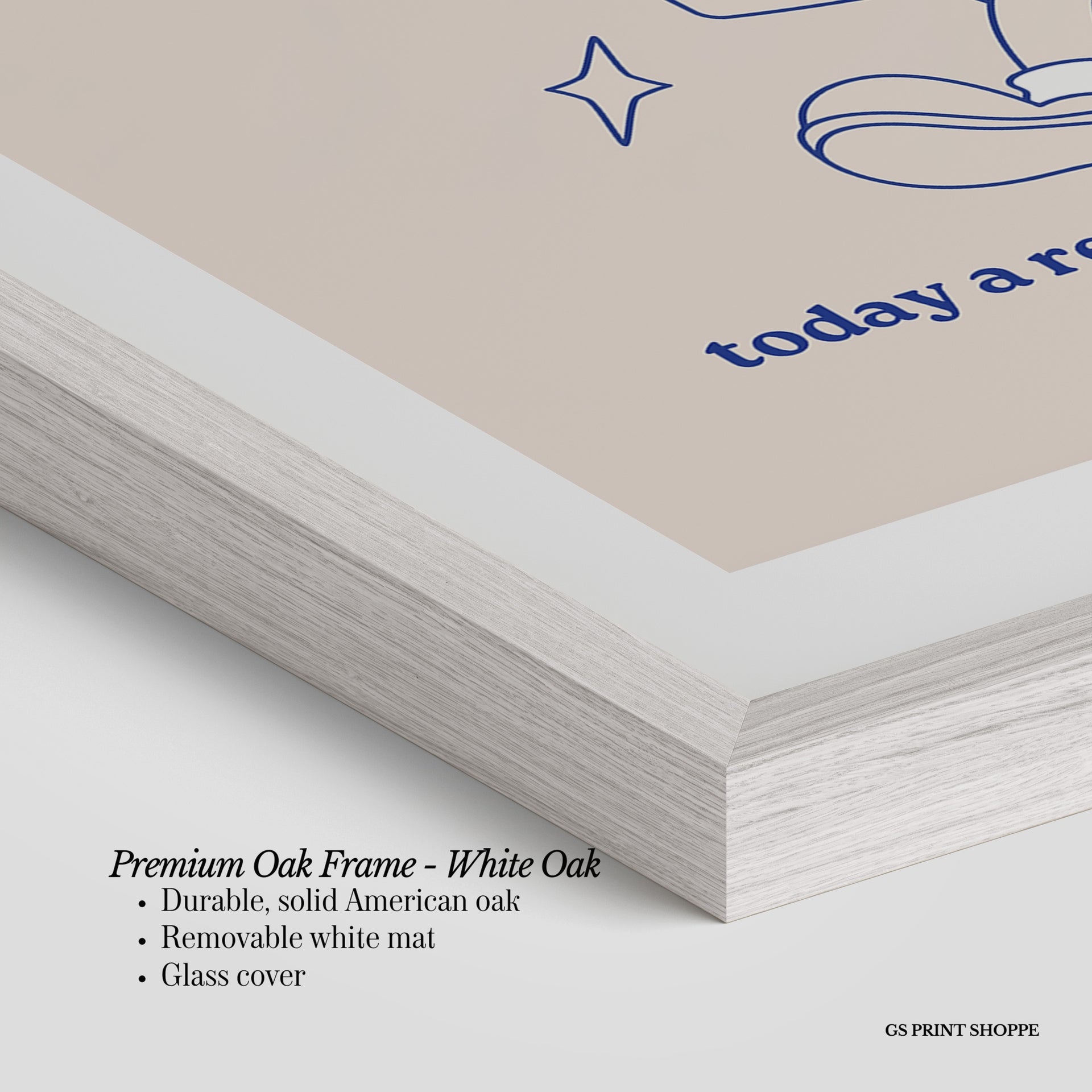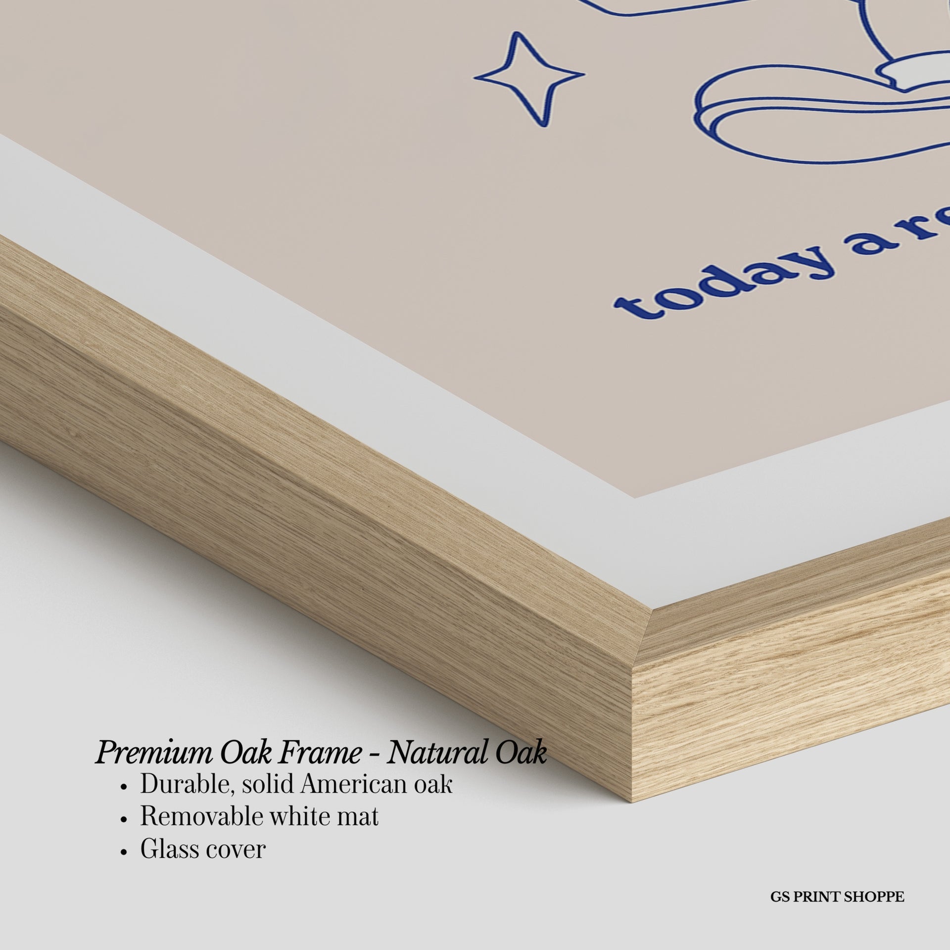 Premium Oak Frame: Our premium oak frame is crafted from solid American oak, offering a warm, natural feel with a high-end finish. We complete this elevated offering with a bright white removable mat and real glass for a versatile and polished look.