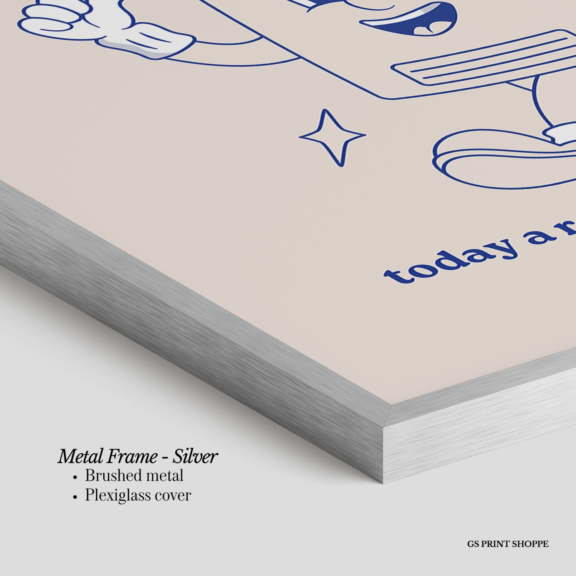 Metal Frame: Sleek and modern, our metal frame is crafted with brushed metal for a polished finish. It comes with durable plexiglass and sturdy metal hangers for horizontal or vertical display.