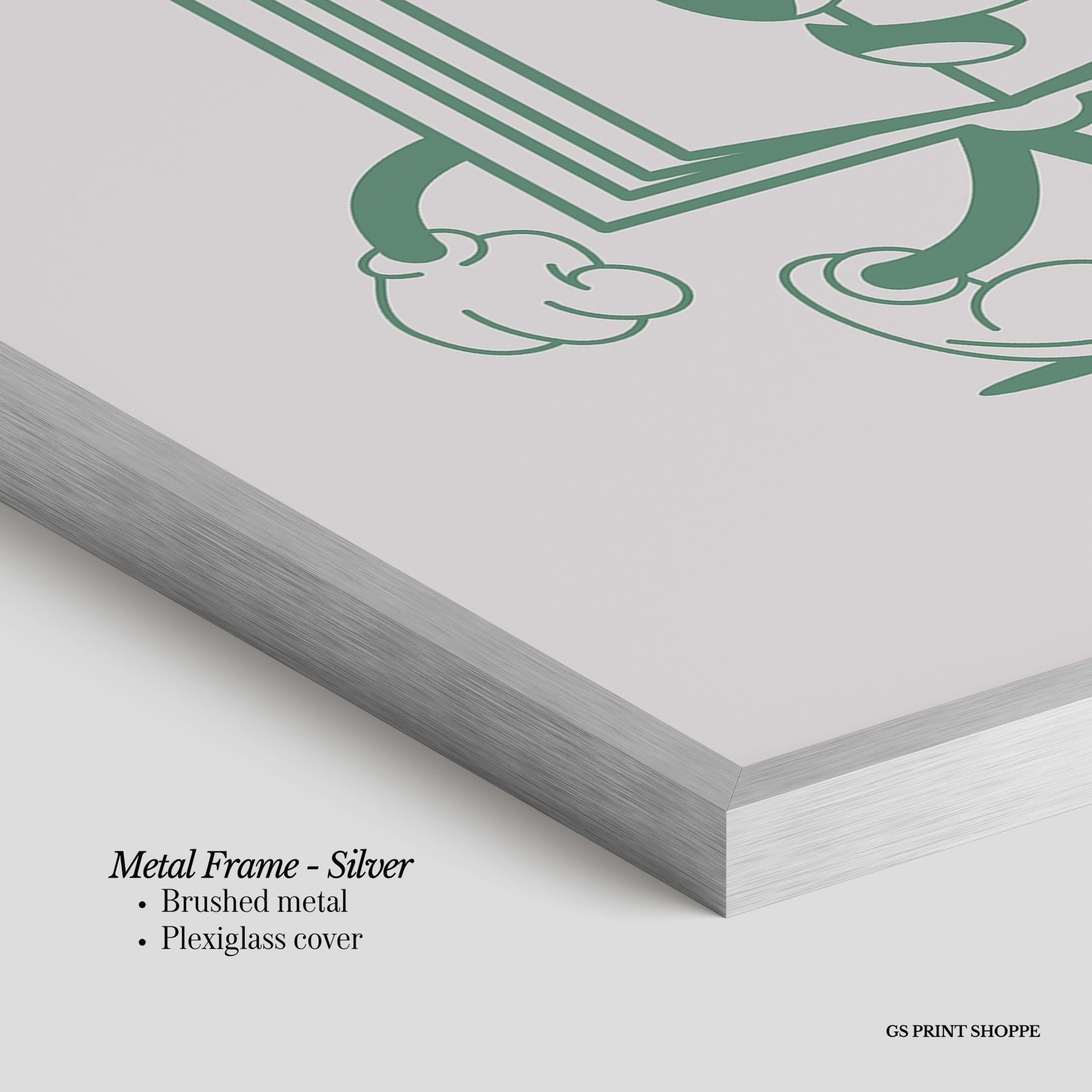 Metal Frame: Sleek and modern, our metal frame is crafted with brushed metal for a polished finish. It comes with durable plexiglass and sturdy metal hangers for horizontal or vertical display.