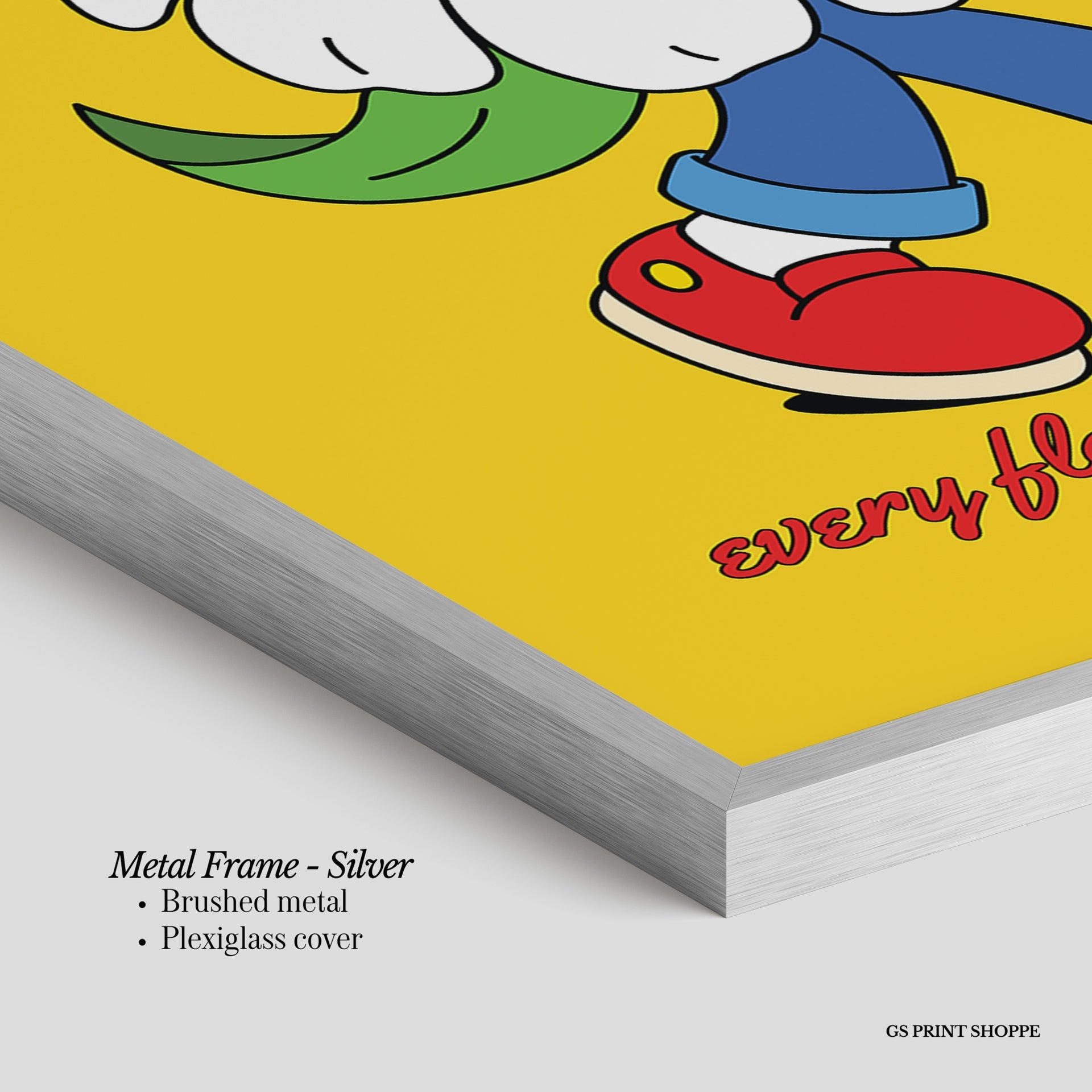 Metal Frame: Sleek and modern, our metal frame is crafted with brushed metal for a polished finish. It comes with durable plexiglass and sturdy metal hangers for horizontal or vertical display.
