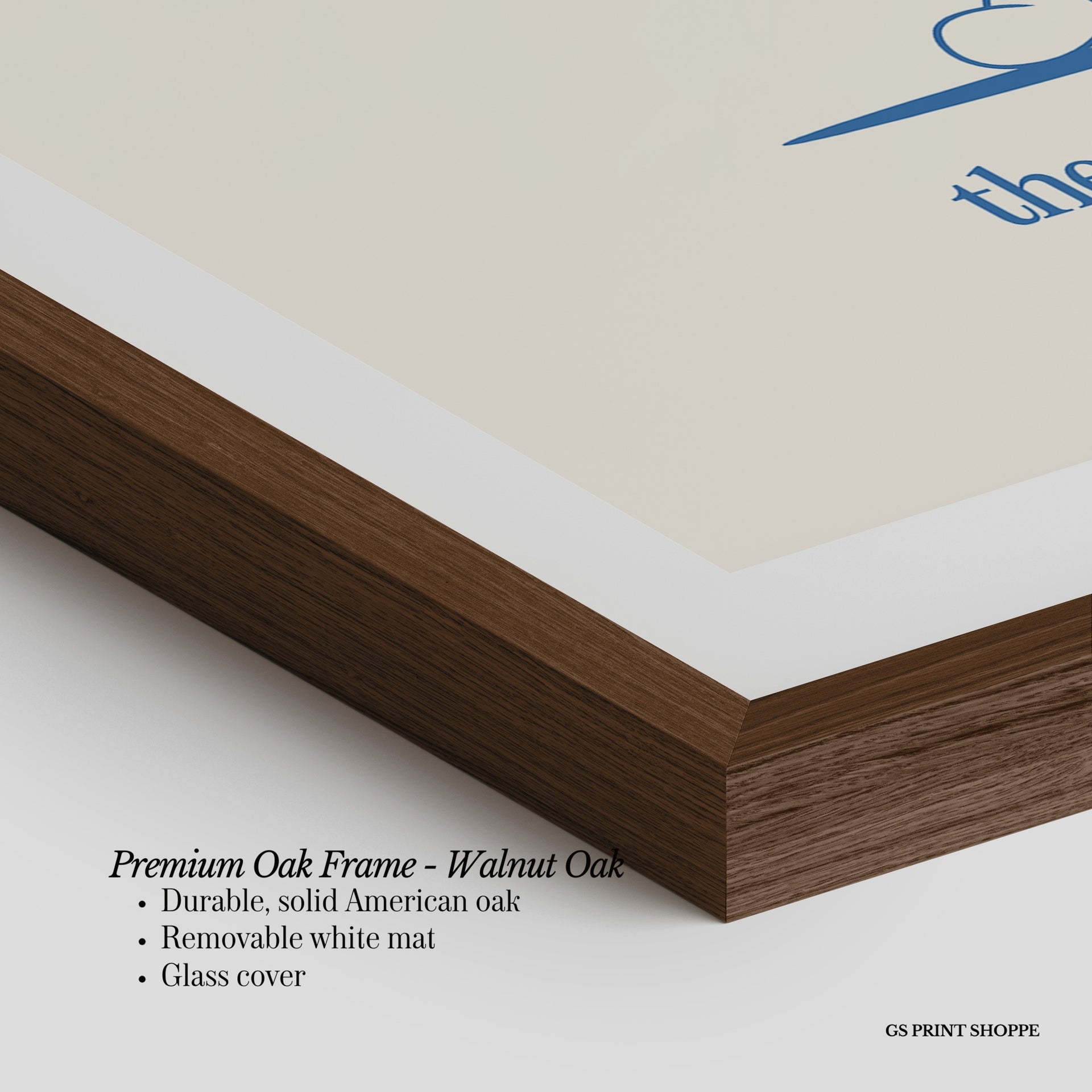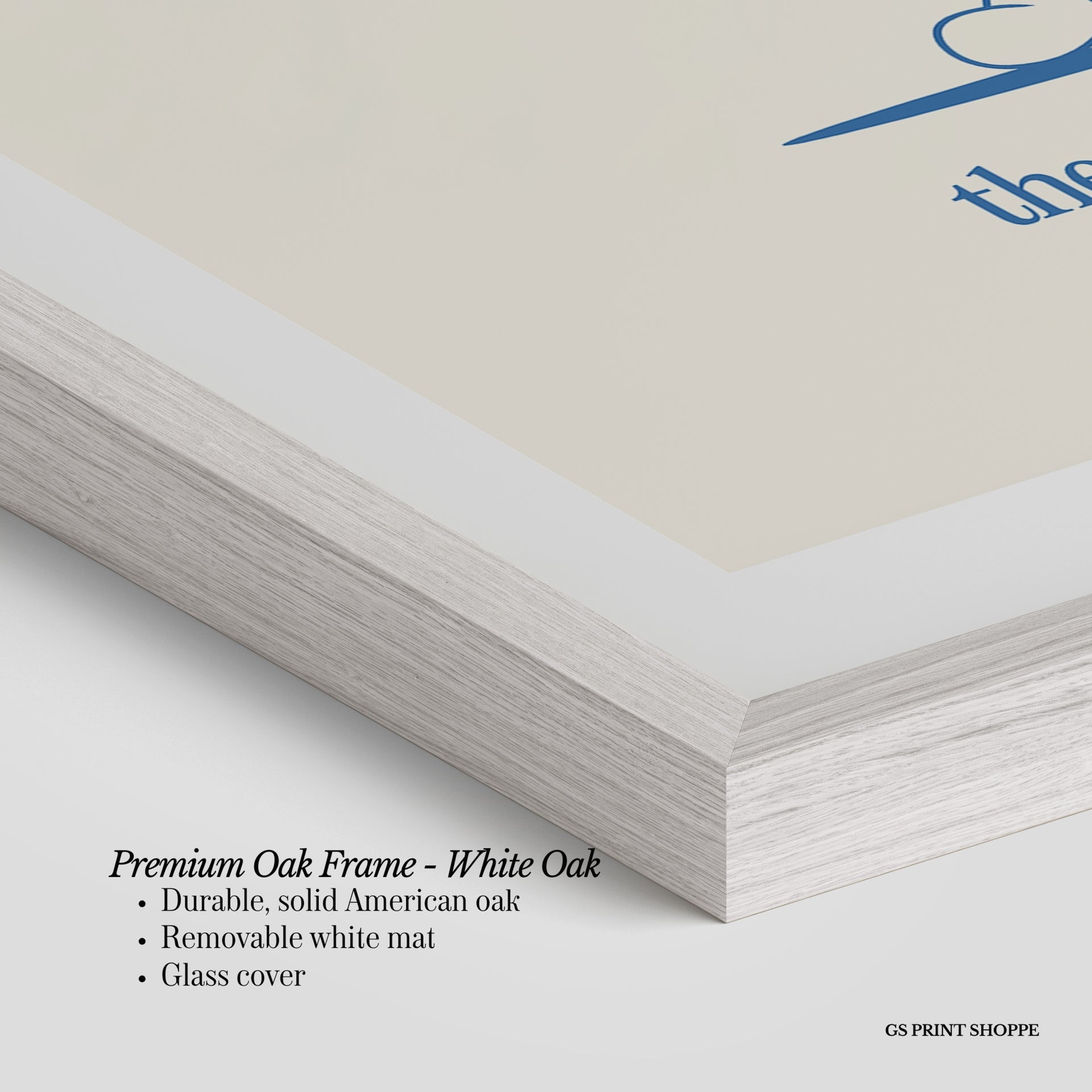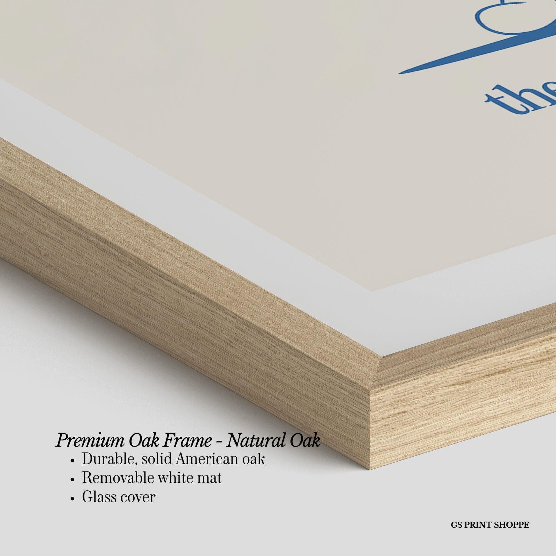 Premium Oak Frame: Our premium oak frame is crafted from solid American oak, offering a warm, natural feel with a high-end finish. We complete this elevated offering with a bright white removable mat and real glass for a versatile and polished look.