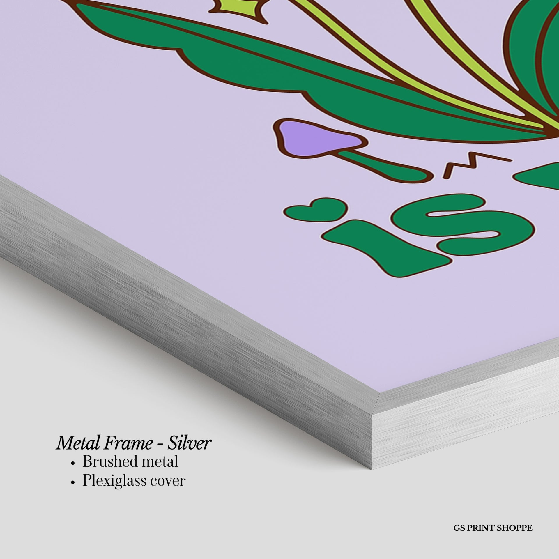 Metal Frame: Sleek and modern, our metal frame is crafted with brushed metal for a polished finish. It comes with durable plexiglass and sturdy metal hangers for horizontal or vertical display.