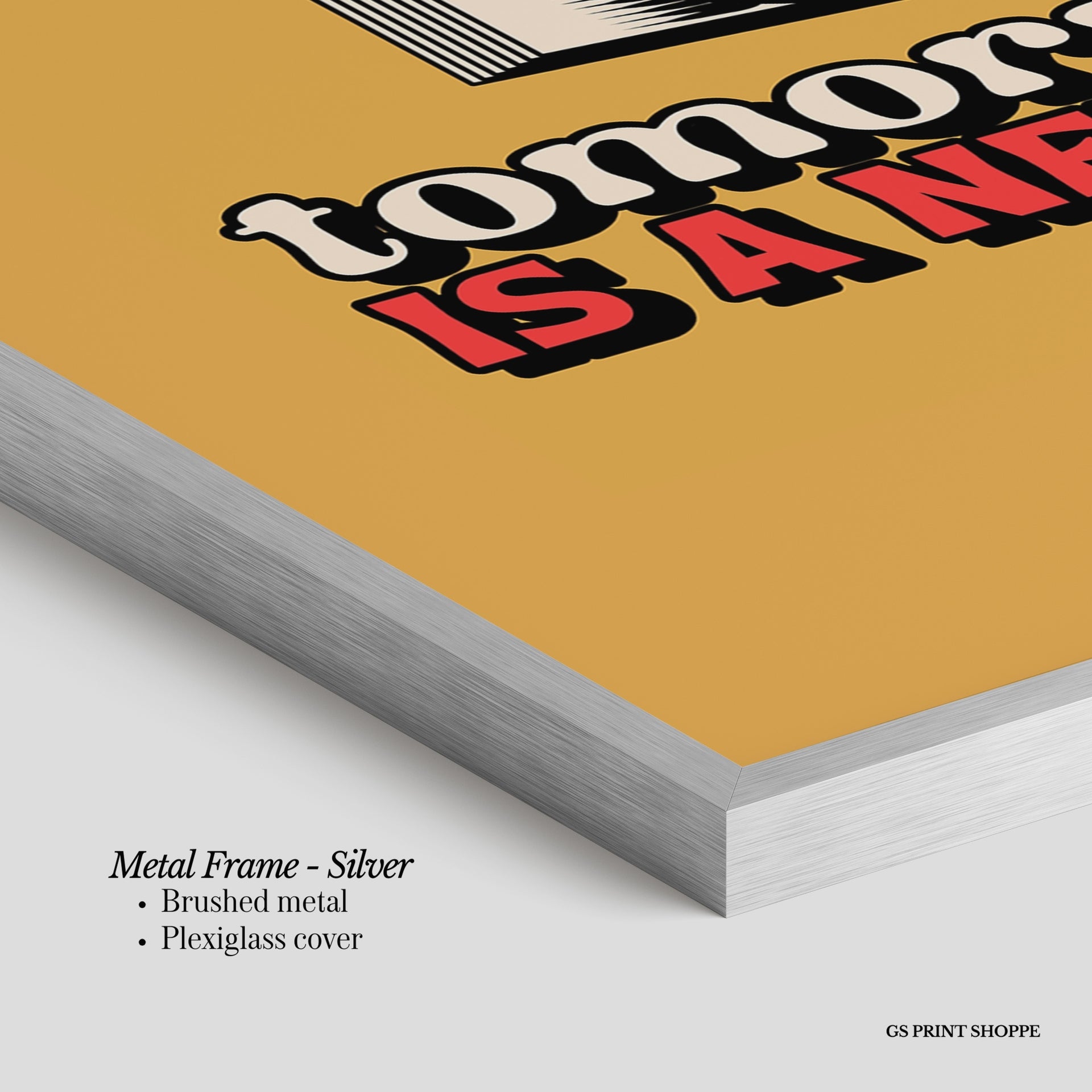 Metal Frame: Sleek and modern, our metal frame is crafted with brushed metal for a polished finish. It comes with durable plexiglass and sturdy metal hangers for horizontal or vertical display.