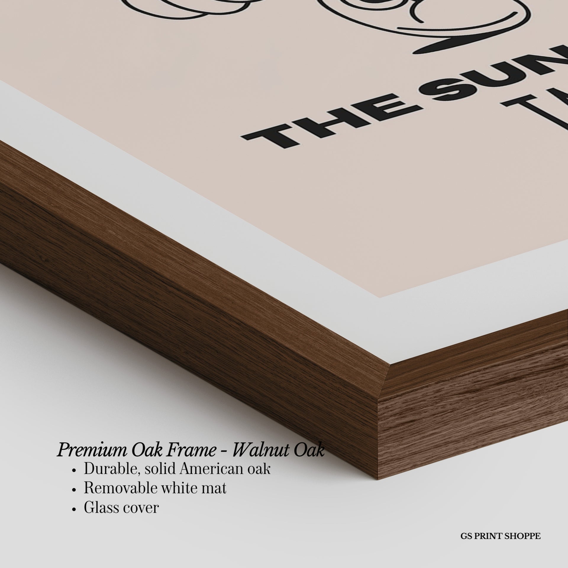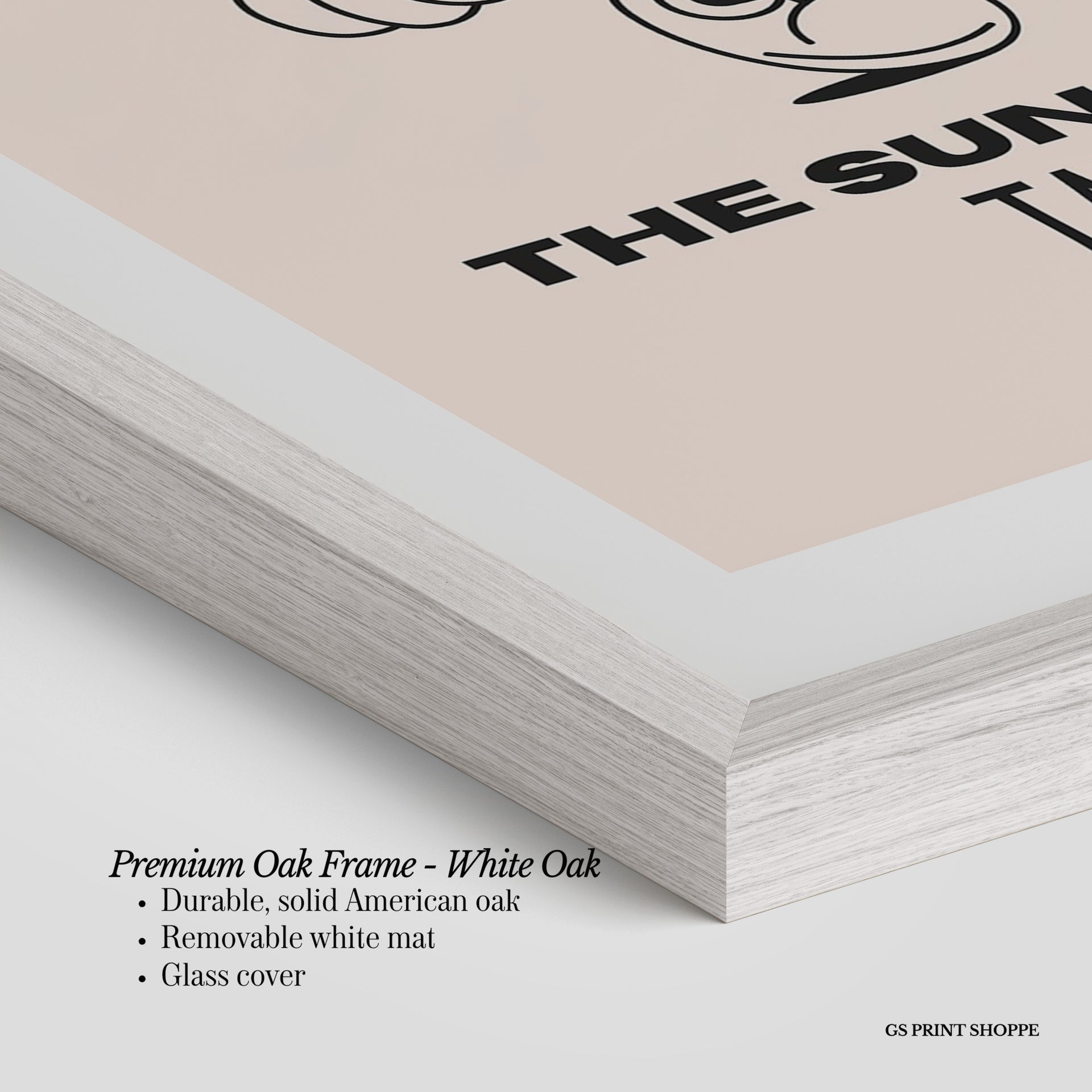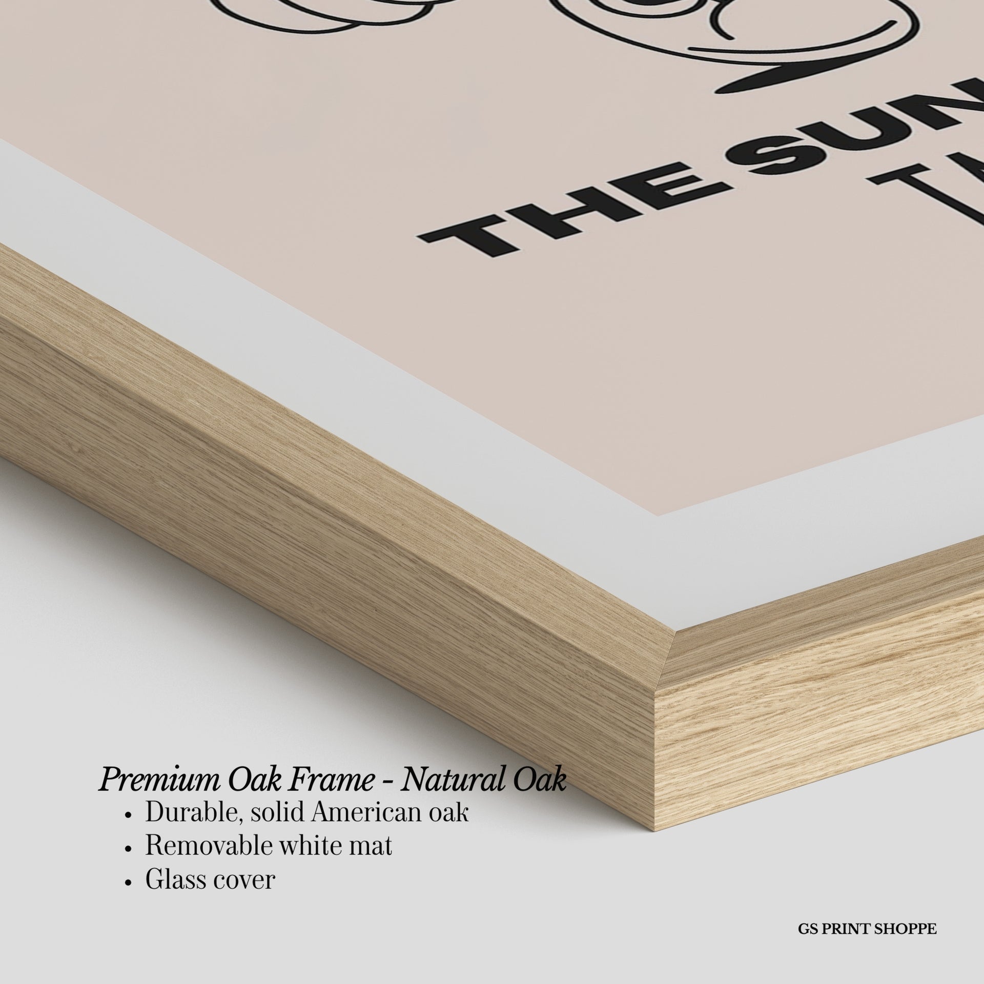 Premium Oak Frame: Our premium oak frame is crafted from solid American oak, offering a warm, natural feel with a high-end finish. We complete this elevated offering with a bright white removable mat and real glass for a versatile and polished look.