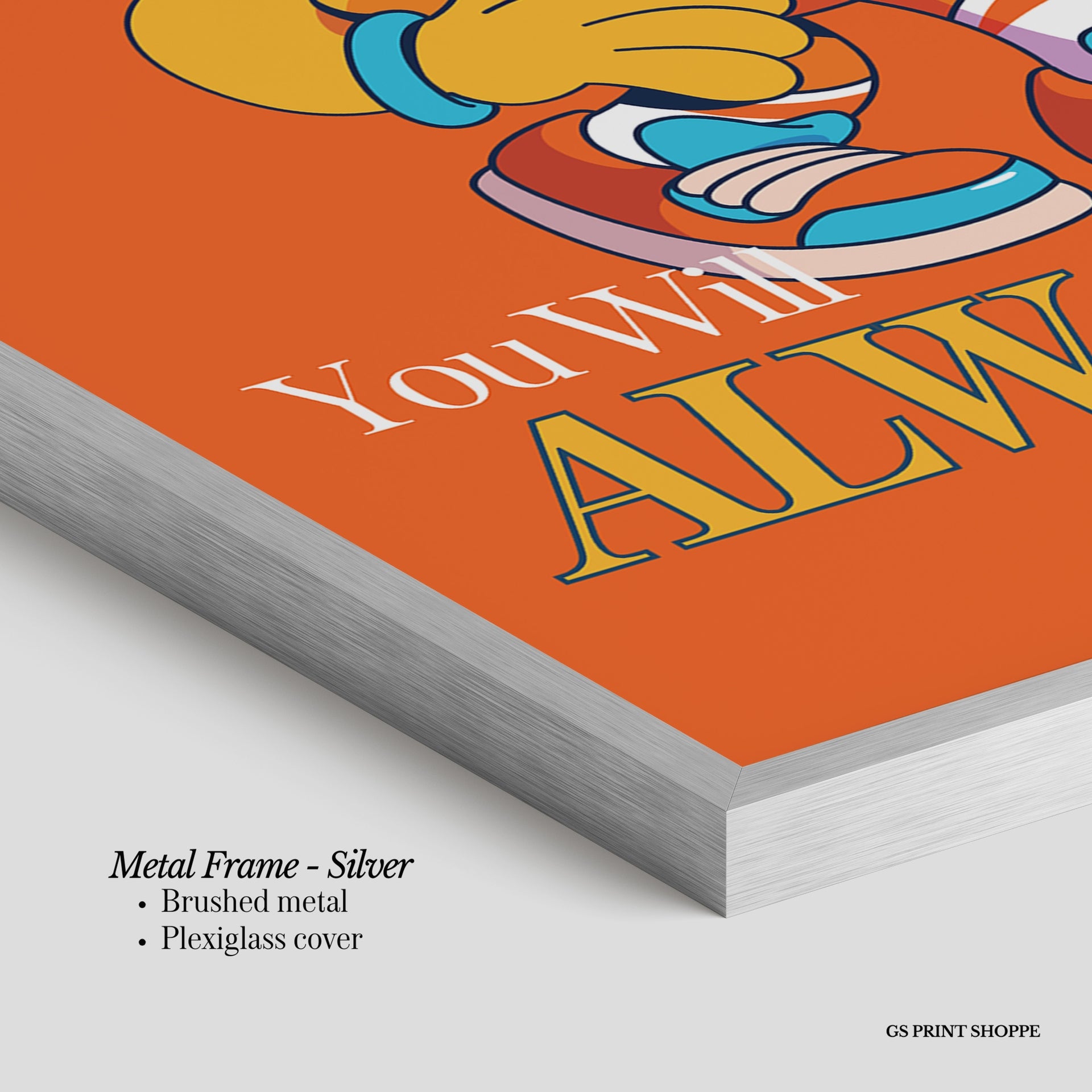 Metal Frame: Sleek and modern, our metal frame is crafted with brushed metal for a polished finish. It comes with durable plexiglass and sturdy metal hangers for horizontal or vertical display.
