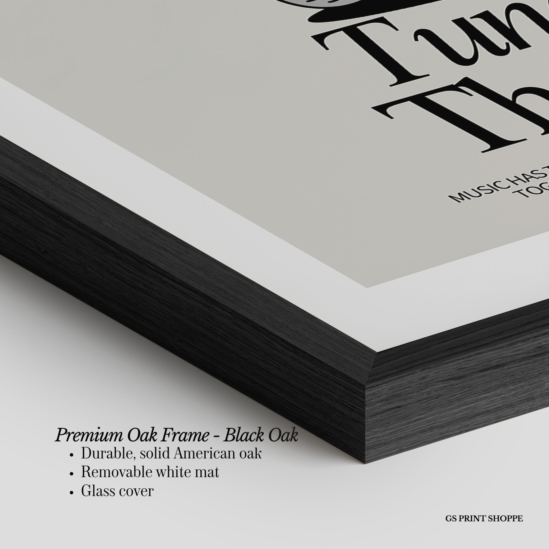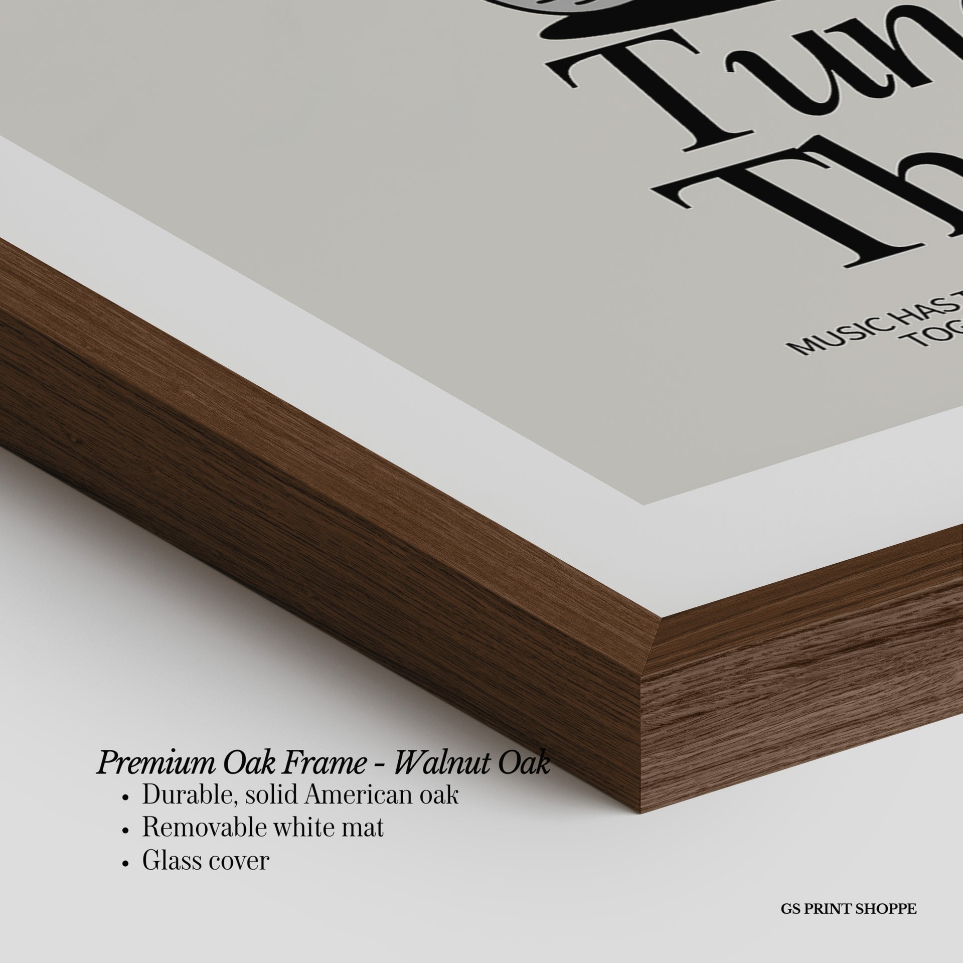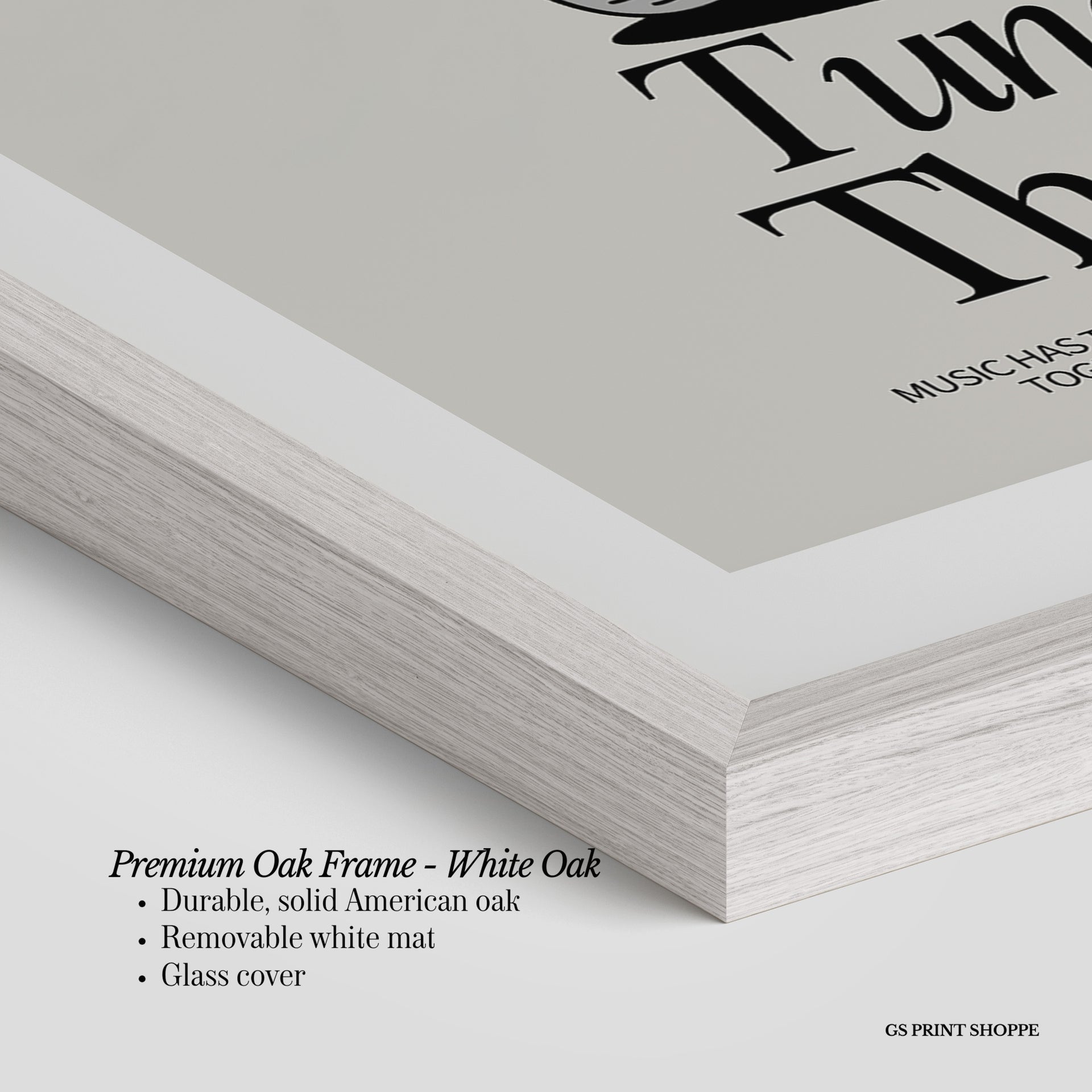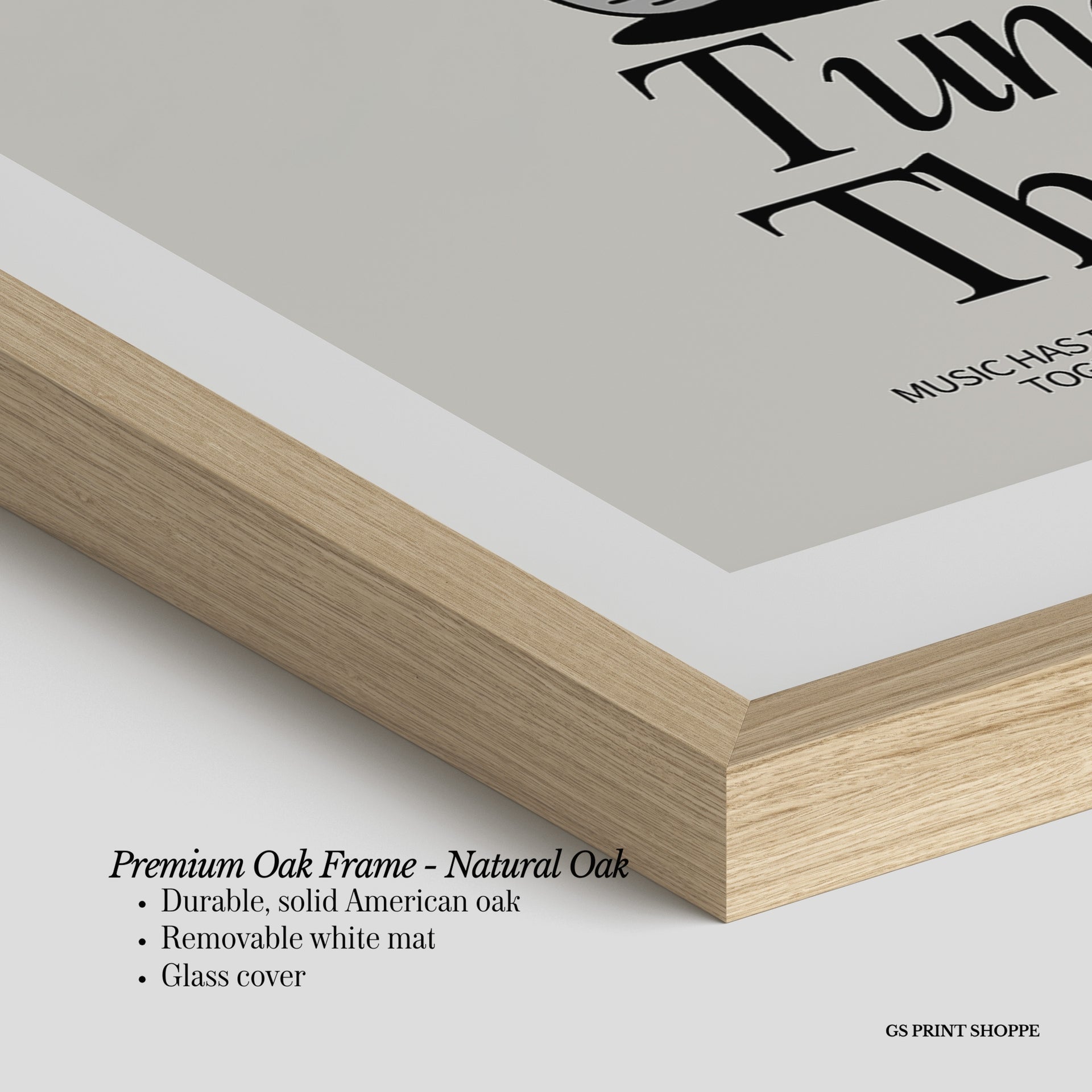 Premium Oak Frame: Our premium oak frame is crafted from solid American oak, offering a warm, natural feel with a high-end finish. We complete this elevated offering with a bright white removable mat and real glass for a versatile and polished look.