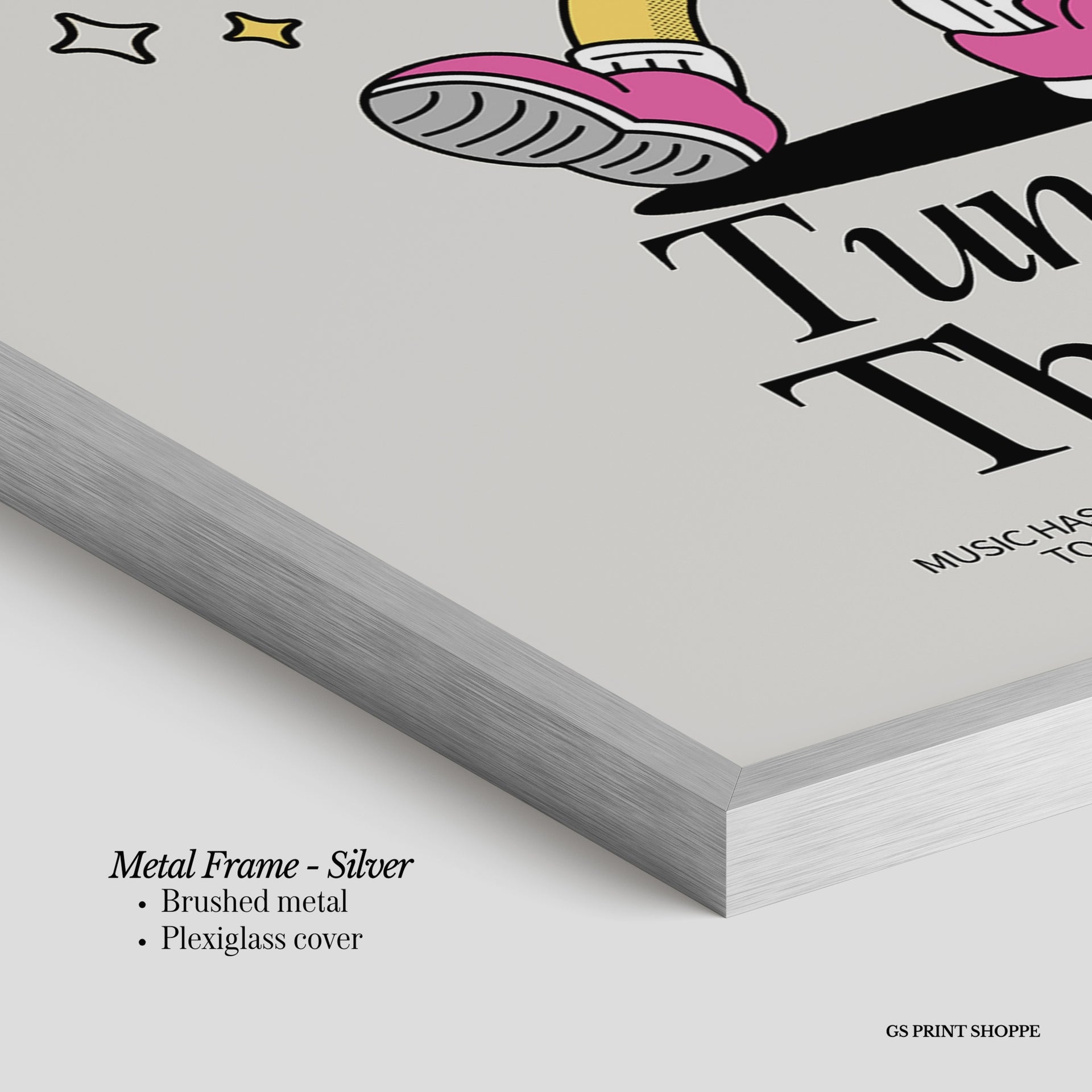 Metal Frame: Sleek and modern, our metal frame is crafted with brushed metal for a polished finish. It comes with durable plexiglass and sturdy metal hangers for horizontal or vertical display.