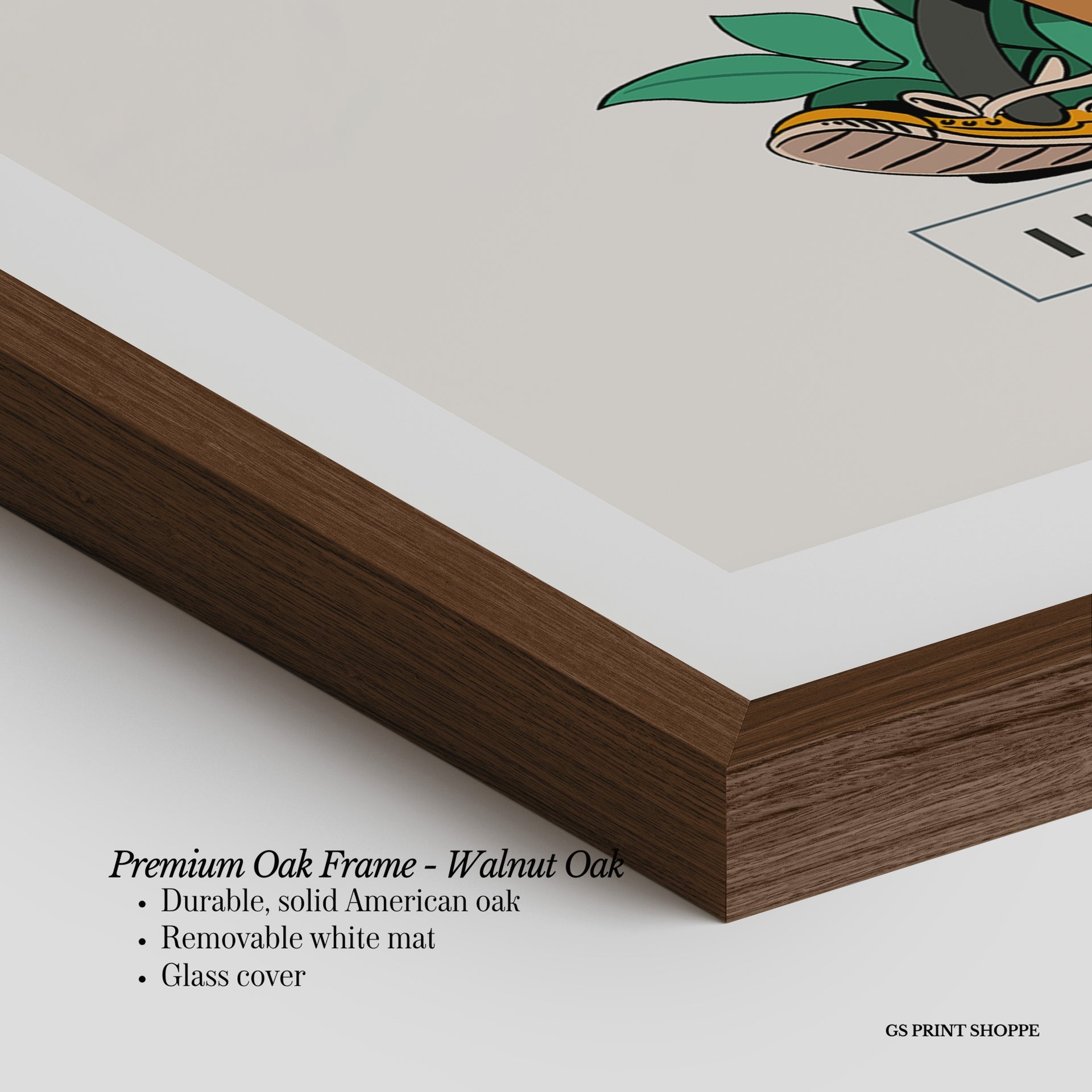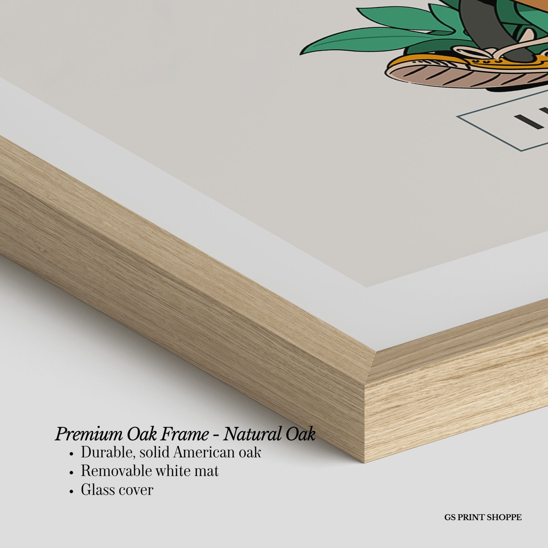 Premium Oak Frame: Our premium oak frame is crafted from solid American oak, offering a warm, natural feel with a high-end finish. We complete this elevated offering with a bright white removable mat and real glass for a versatile and polished look.