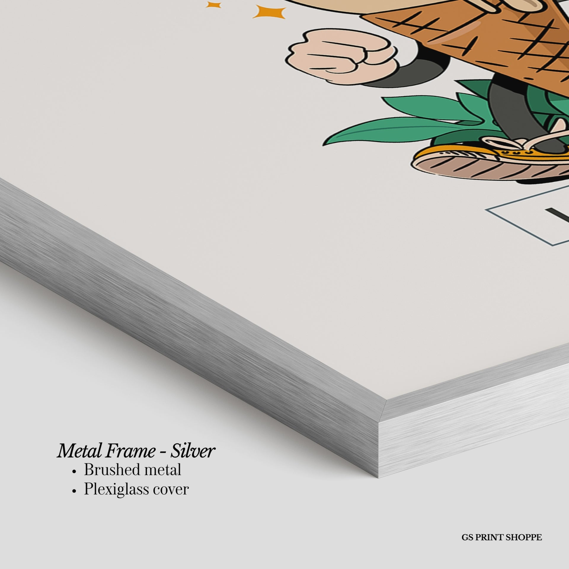 Metal Frame: Sleek and modern, our metal frame is crafted with brushed metal for a polished finish. It comes with durable plexiglass and sturdy metal hangers for horizontal or vertical display.