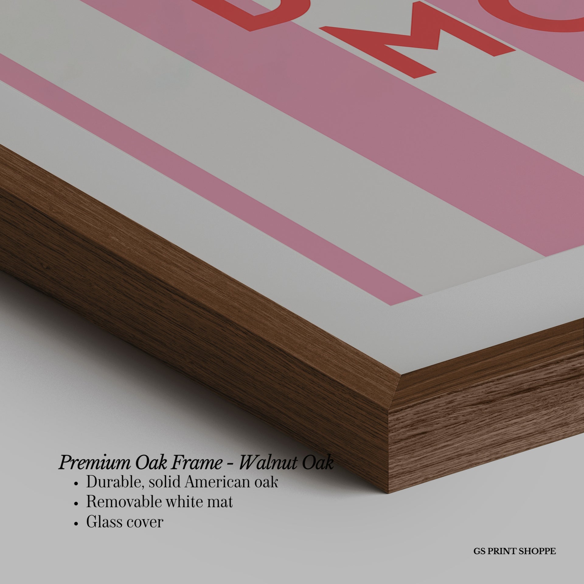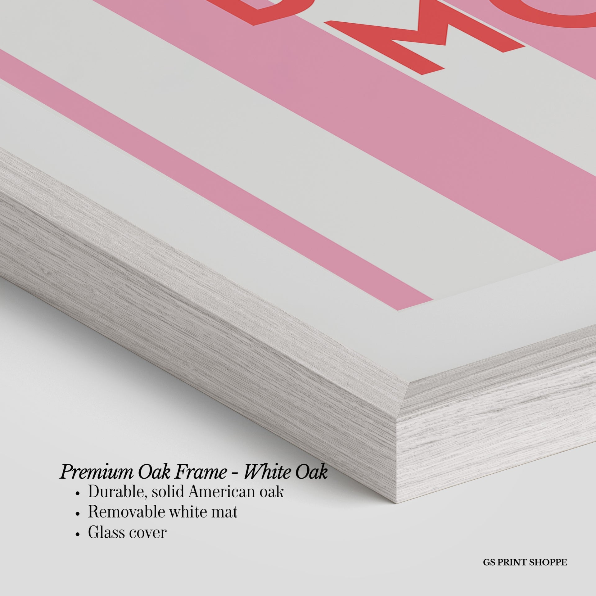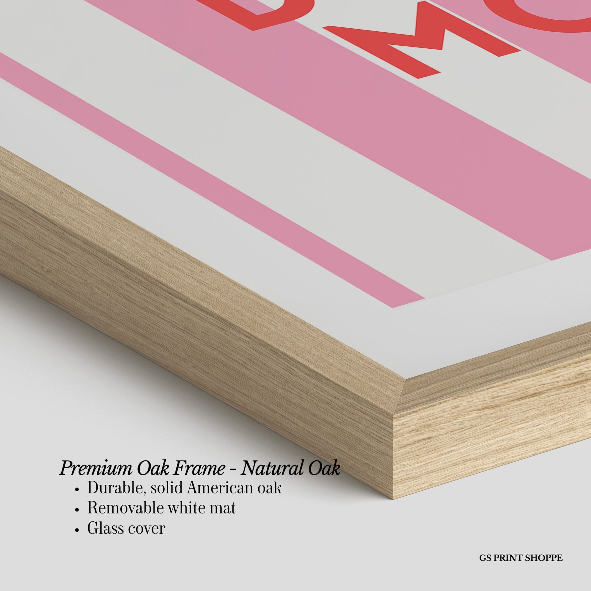 Premium Oak Frame: Our premium oak frame is crafted from solid American oak, offering a warm, natural feel with a high-end finish. We complete this elevated offering with a bright white removable mat and real glass for a versatile and polished look.