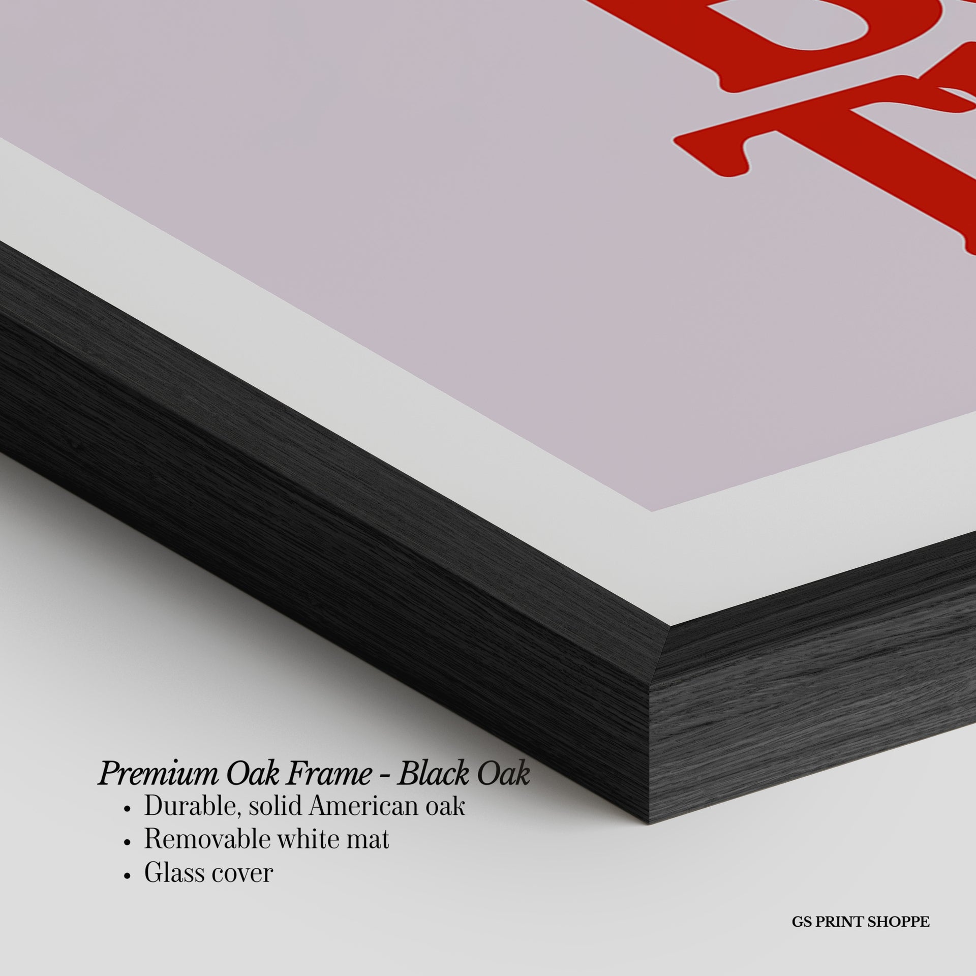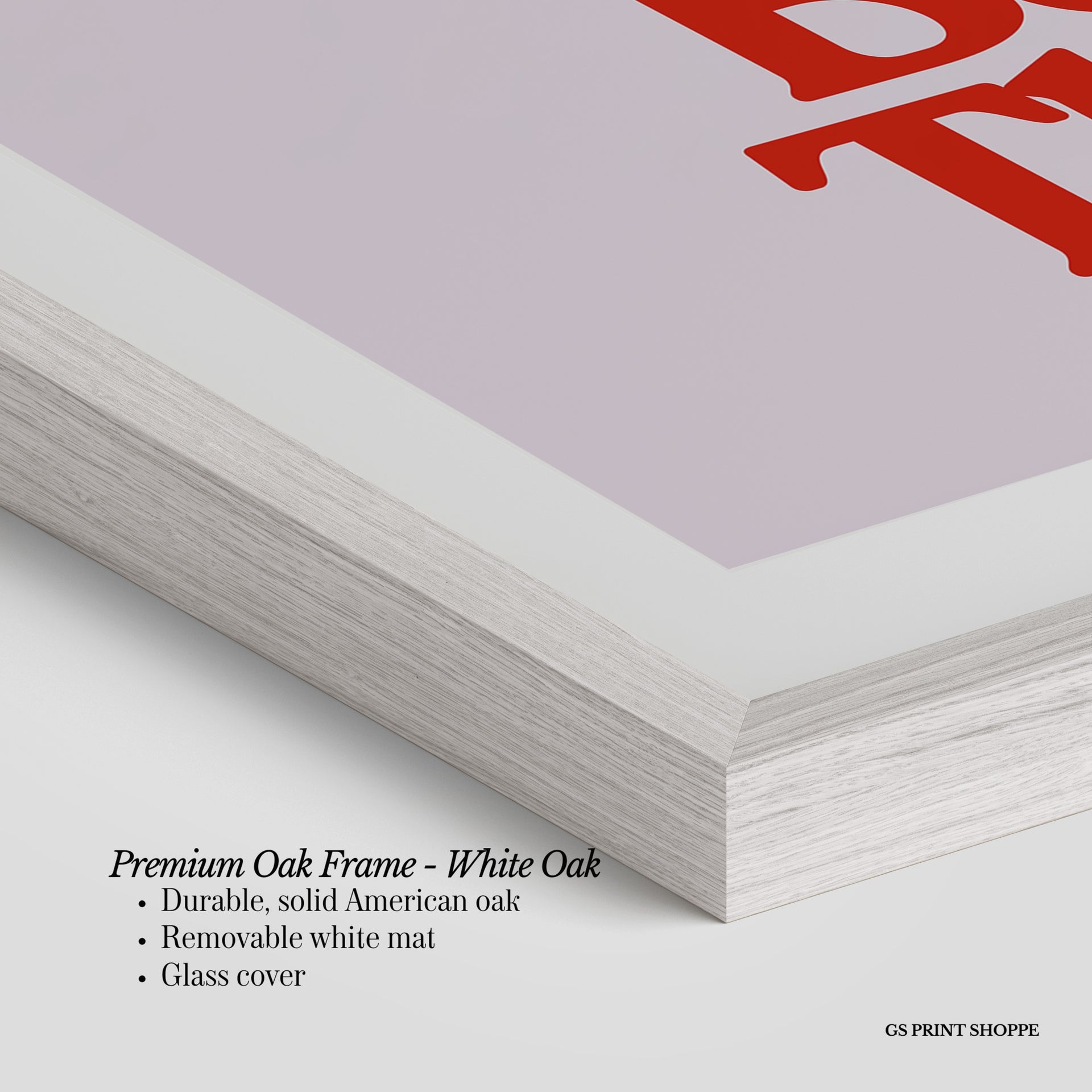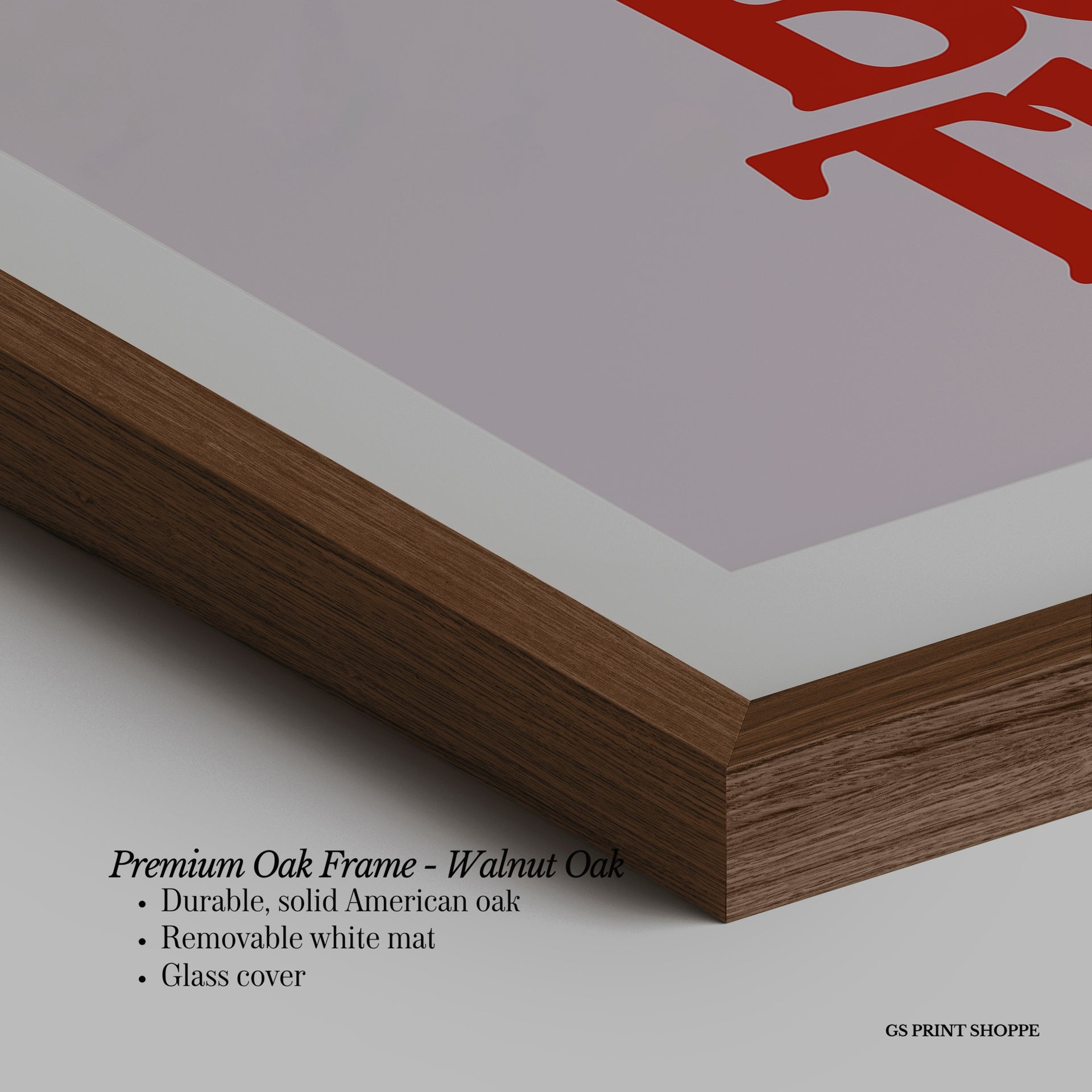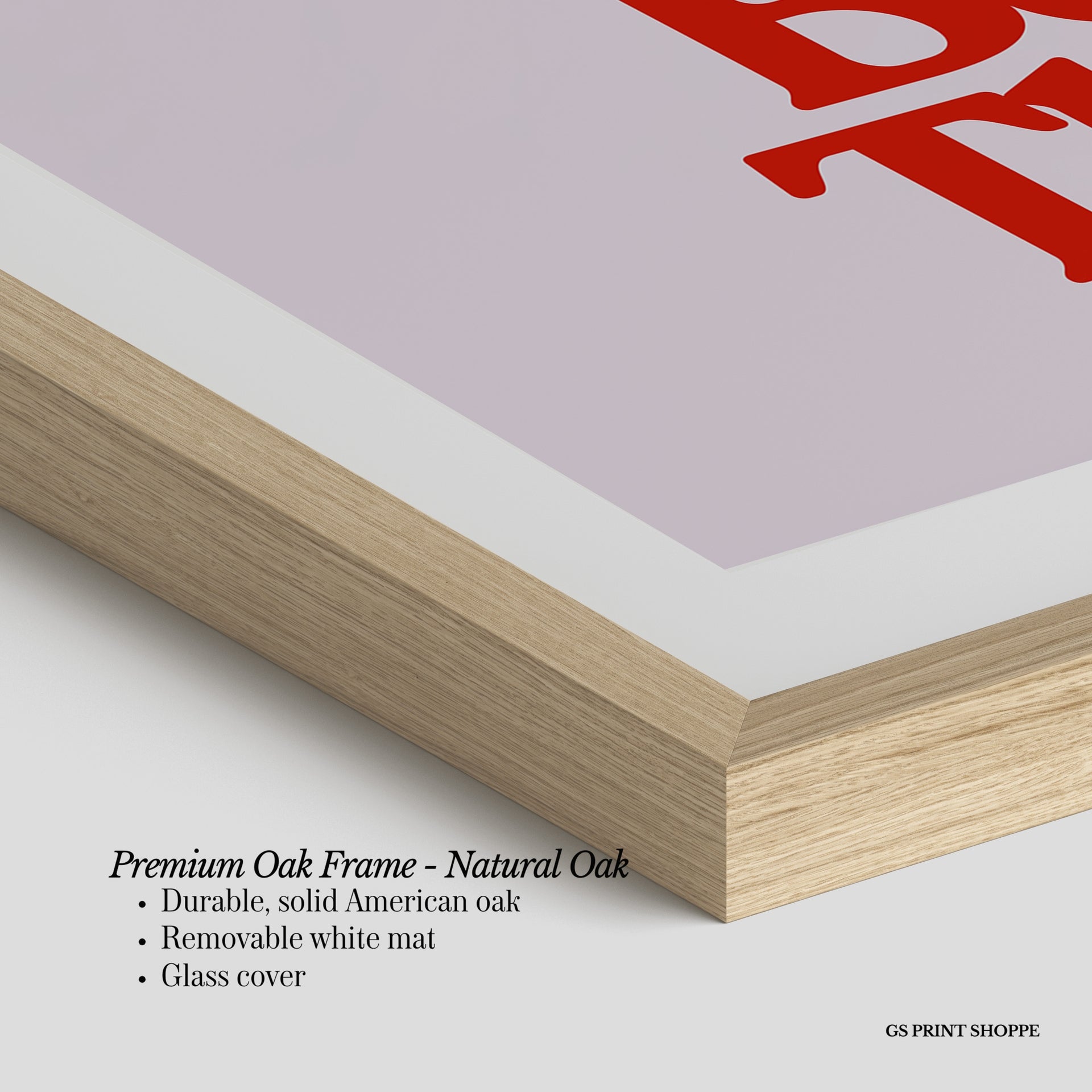 Premium Oak Frame: Our premium oak frame is crafted from solid American oak, offering a warm, natural feel with a high-end finish. We complete this elevated offering with a bright white removable mat and real glass for a versatile and polished look.