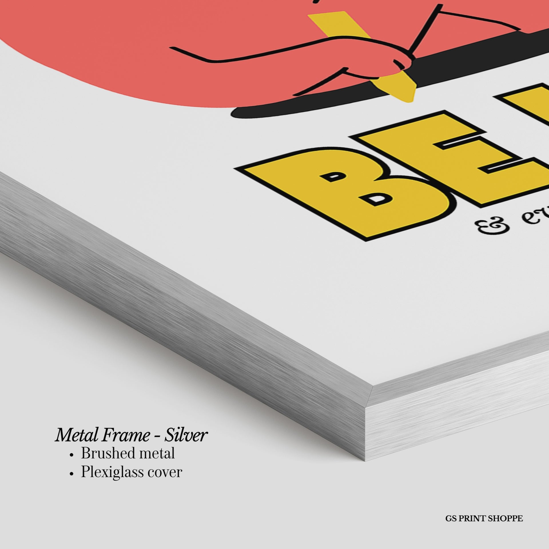 Metal Frame: Sleek and modern, our metal frame is crafted with brushed metal for a polished finish. It comes with durable plexiglass and sturdy metal hangers for horizontal or vertical display.