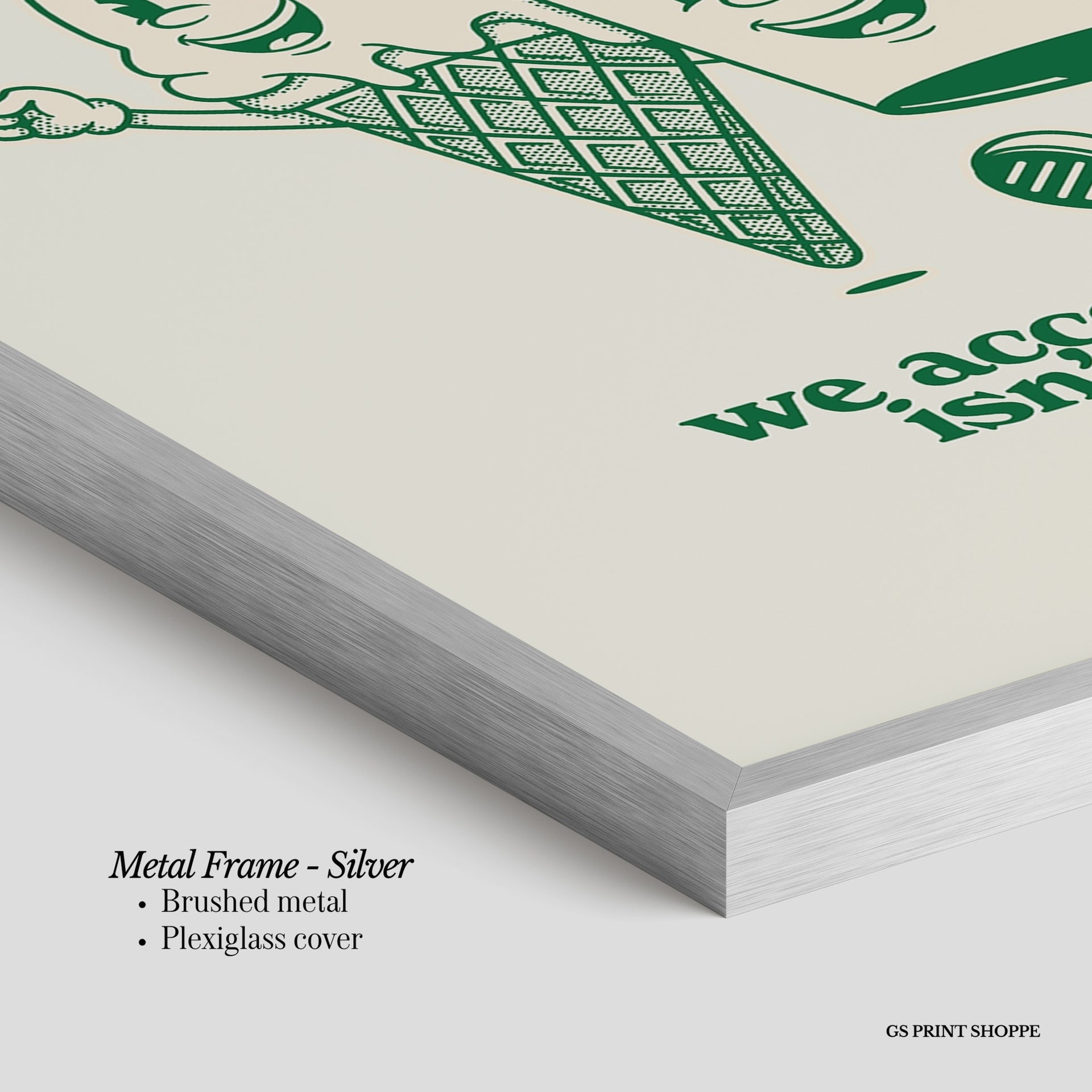 Metal Frame: Sleek and modern, our metal frame is crafted with brushed metal for a polished finish. It comes with durable plexiglass and sturdy metal hangers for horizontal or vertical display.