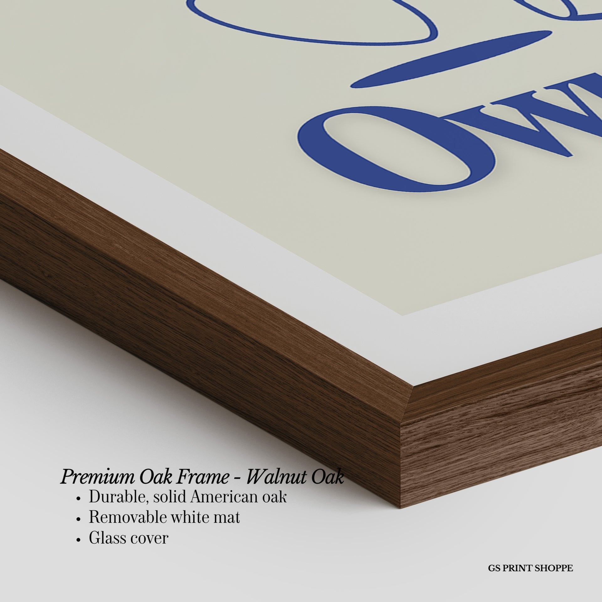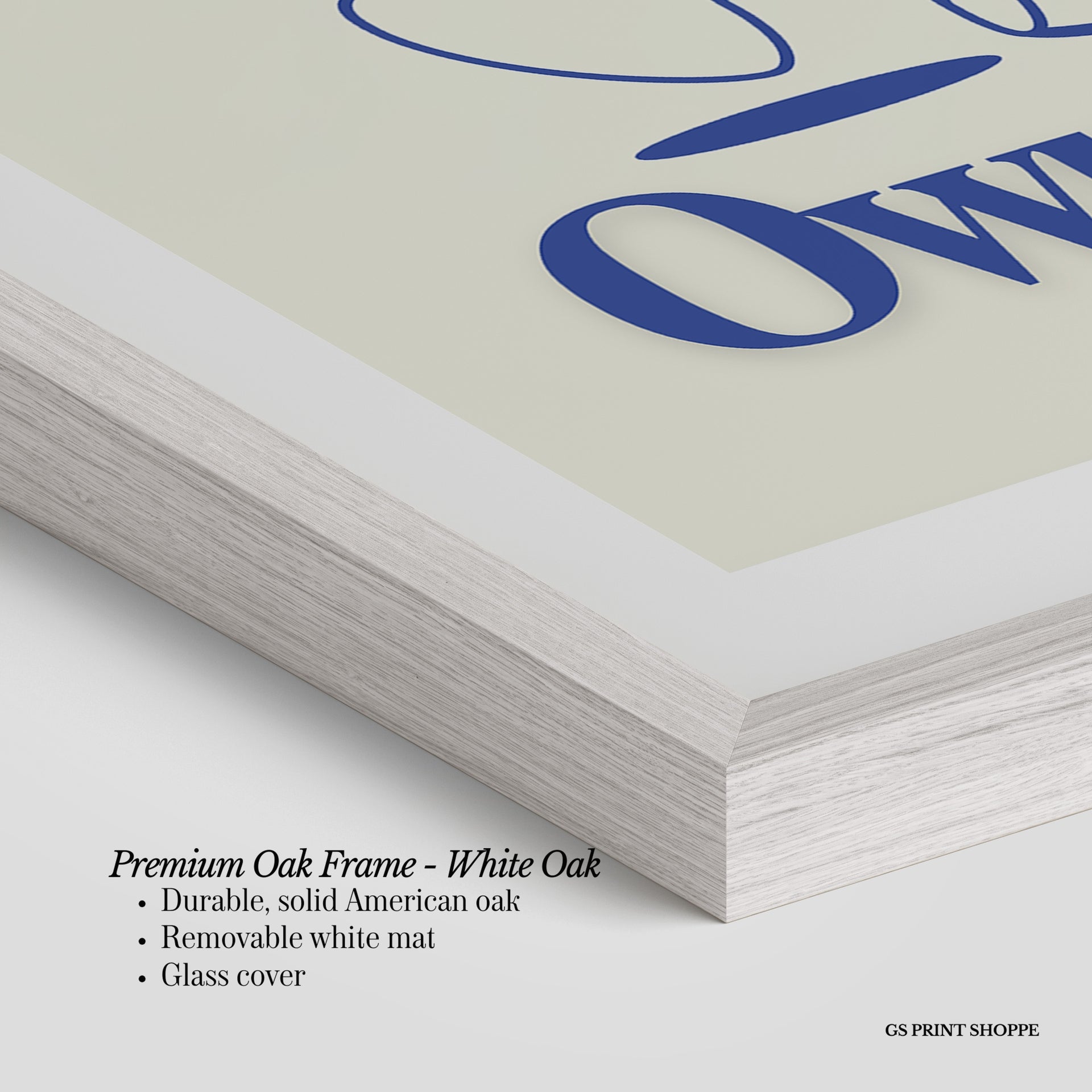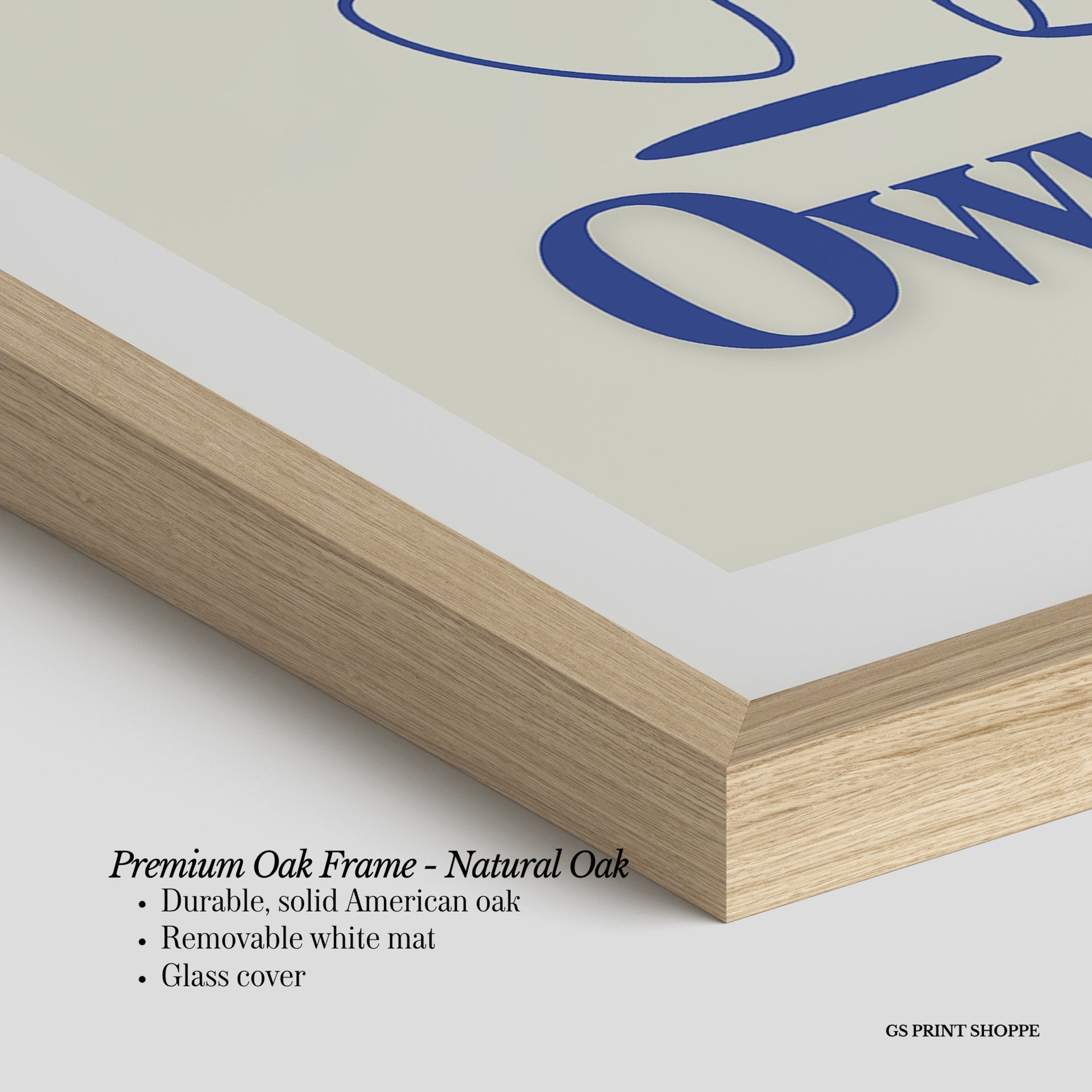 Premium Oak Frame: Our premium oak frame is crafted from solid American oak, offering a warm, natural feel with a high-end finish. We complete this elevated offering with a bright white removable mat and real glass for a versatile and polished look.