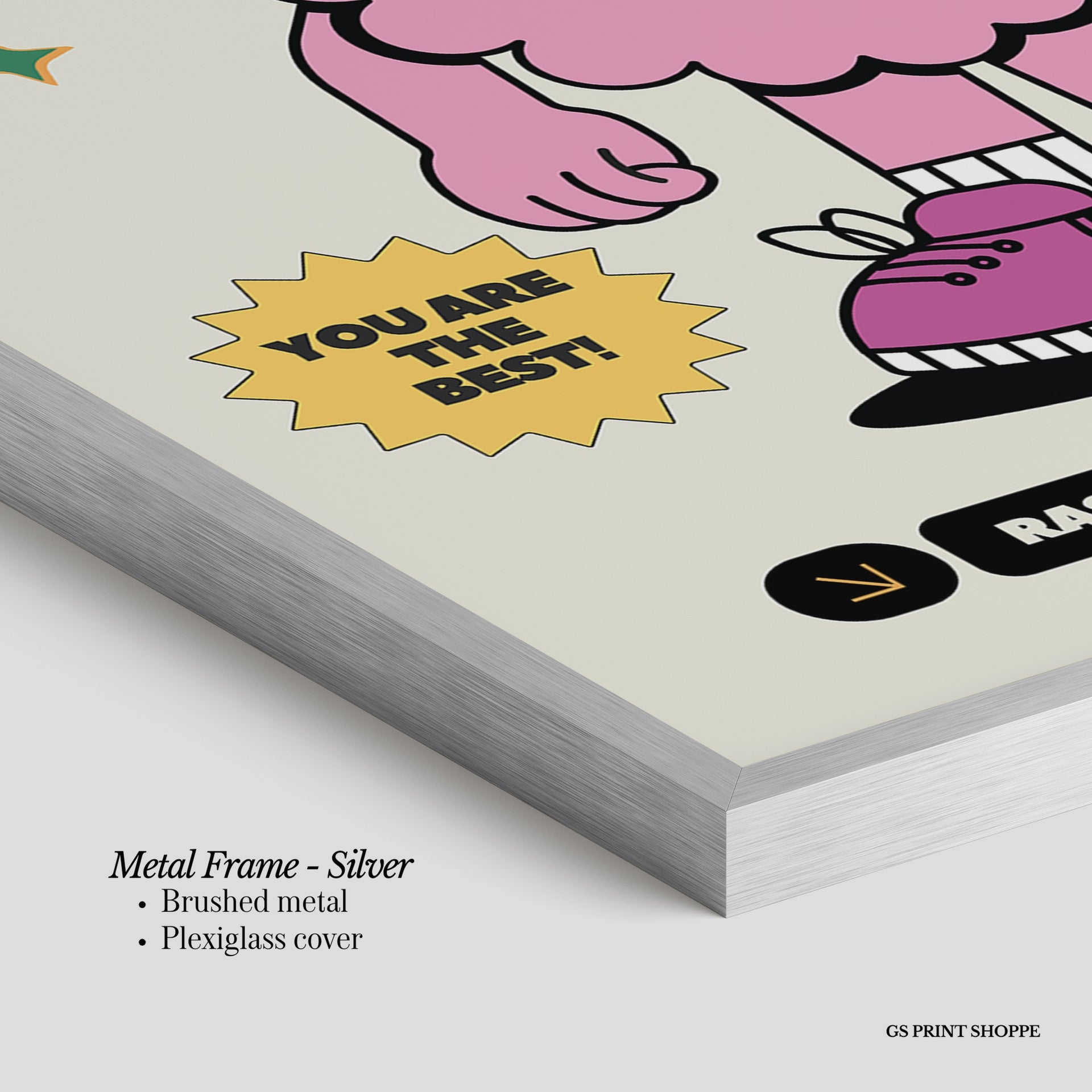 Metal Frame: Sleek and modern, our metal frame is crafted with brushed metal for a polished finish. It comes with durable plexiglass and sturdy metal hangers for horizontal or vertical display.