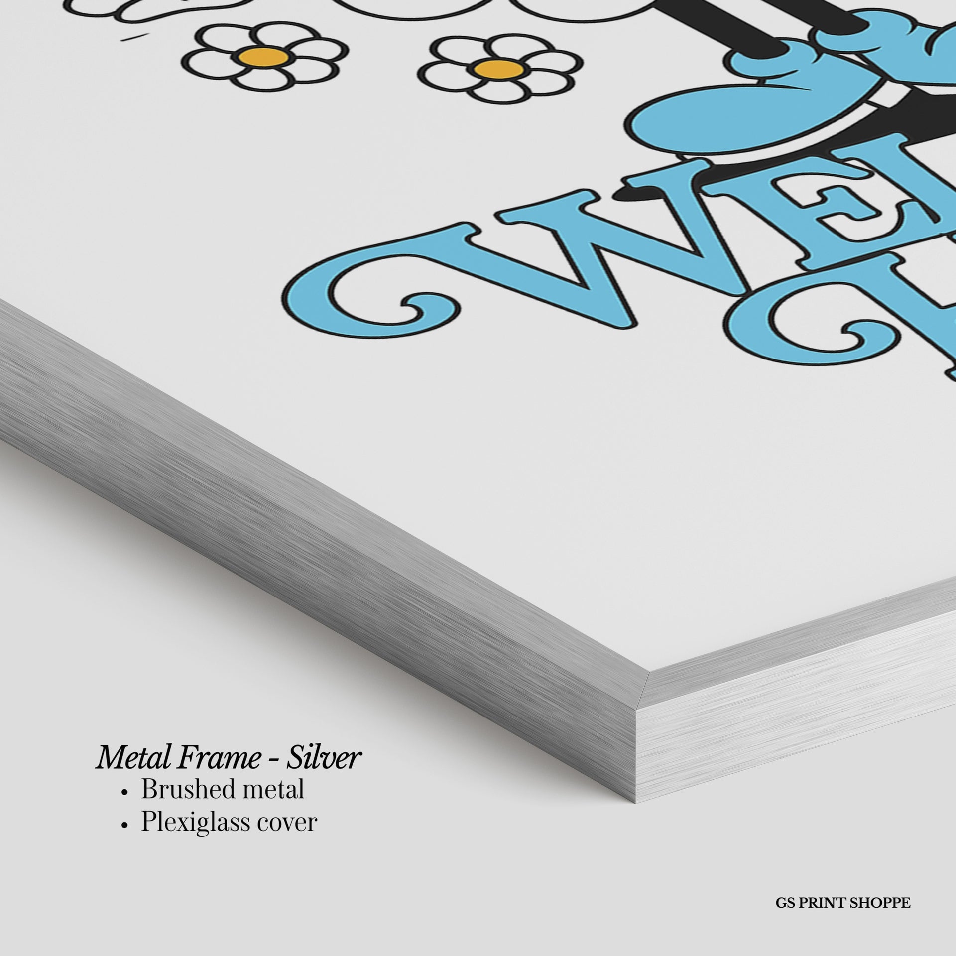 Metal Frame: Sleek and modern, our metal frame is crafted with brushed metal for a polished finish. It comes with durable plexiglass and sturdy metal hangers for horizontal or vertical display.