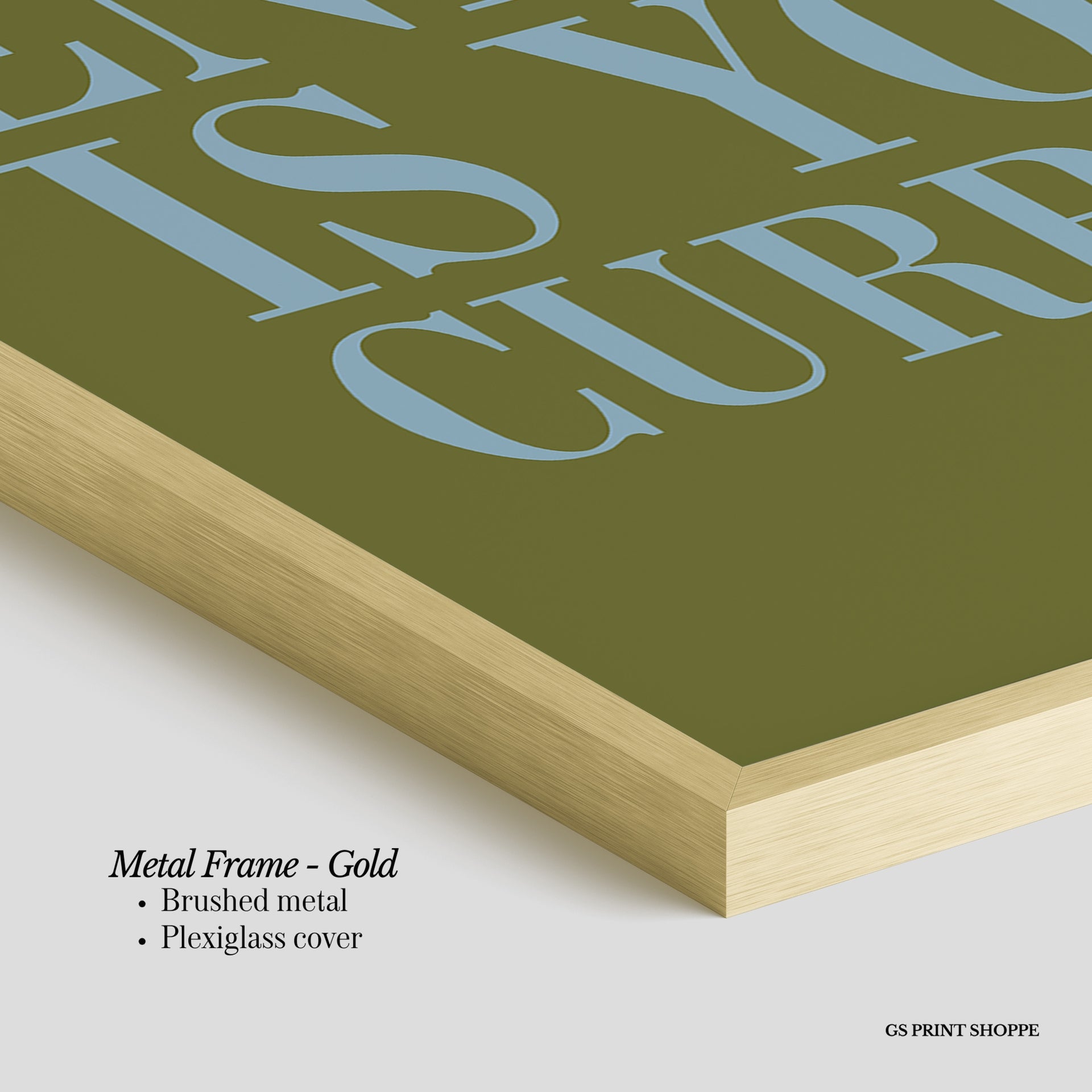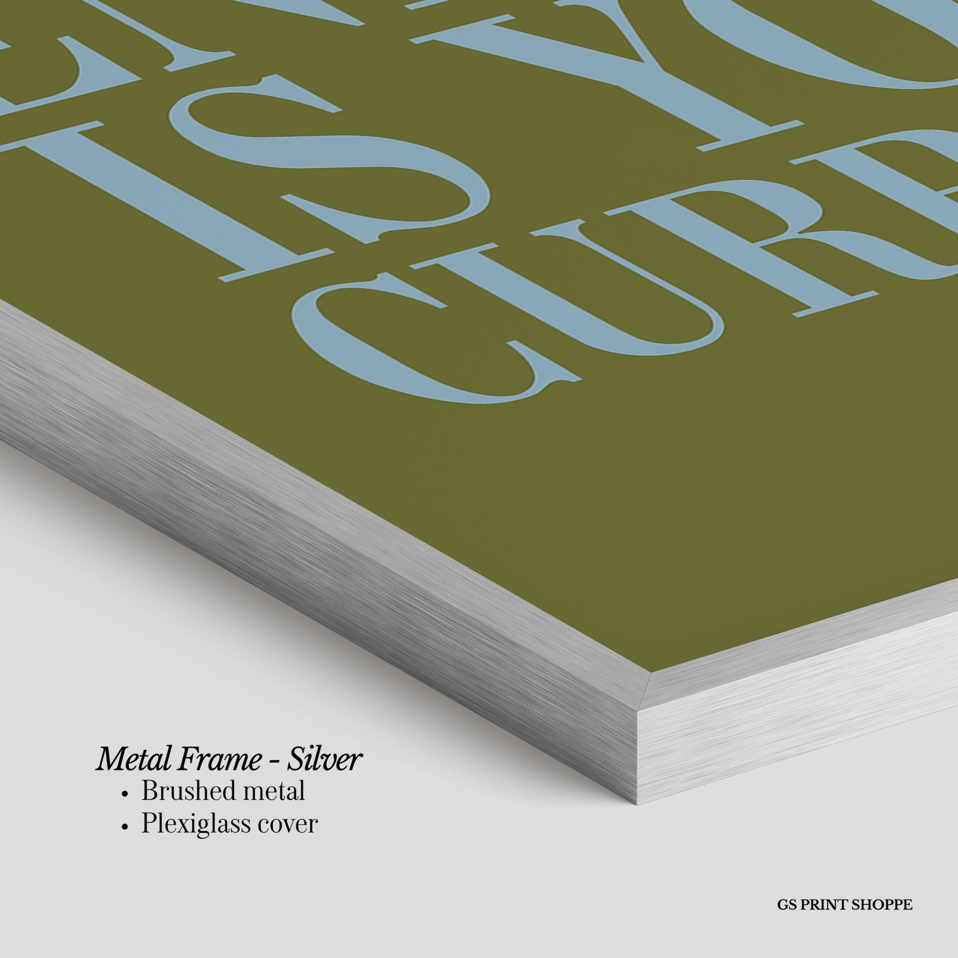 Metal Frame: Sleek and modern, our metal frame is crafted with brushed metal for a polished finish. It comes with durable plexiglass and sturdy metal hangers for horizontal or vertical display.