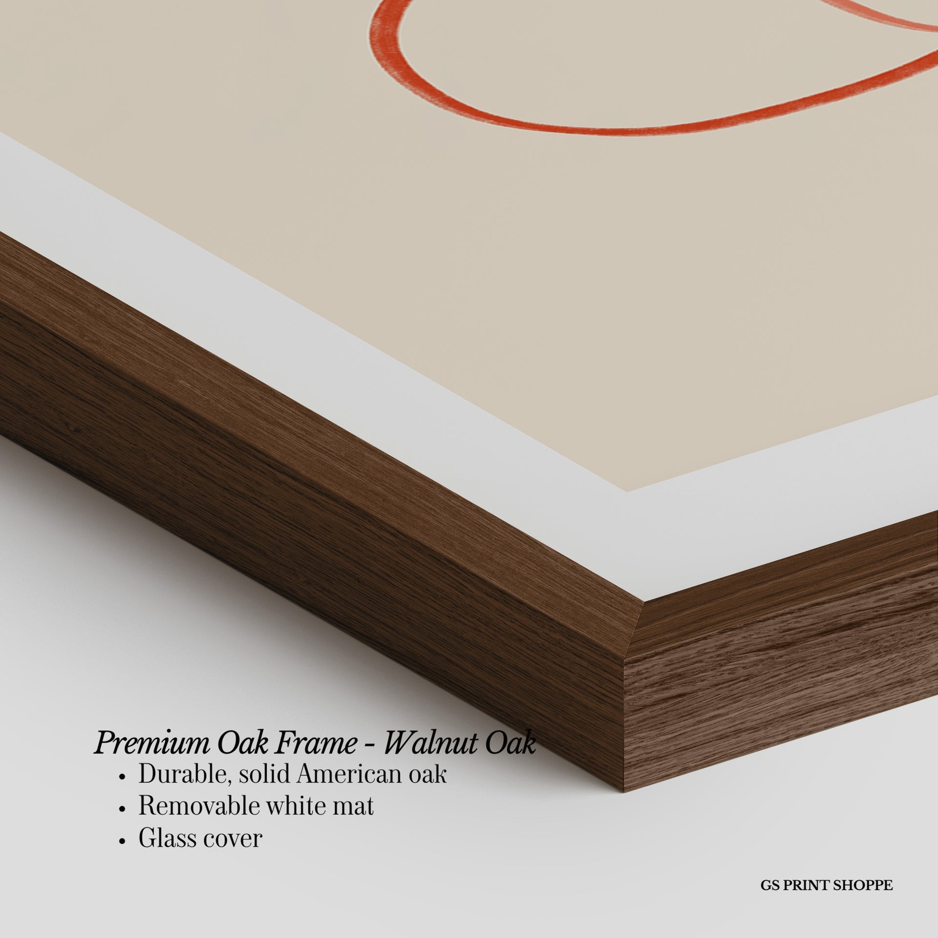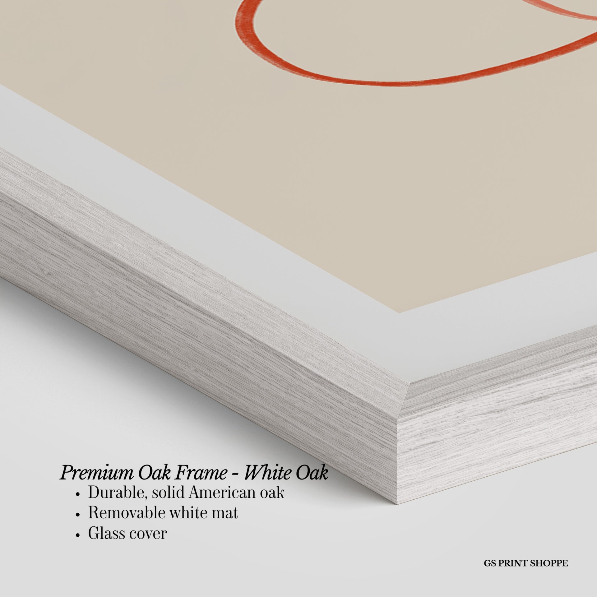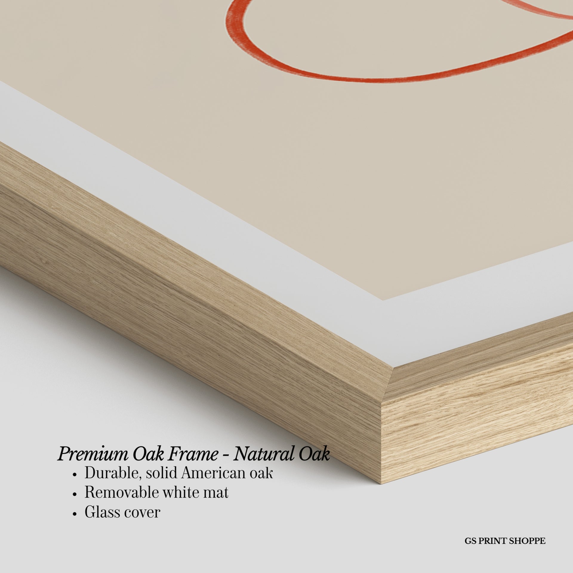 Premium Oak Frame: Our premium oak frame is crafted from solid American oak, offering a warm, natural feel with a high-end finish. We complete this elevated offering with a bright white removable mat and real glass for a versatile and polished look.