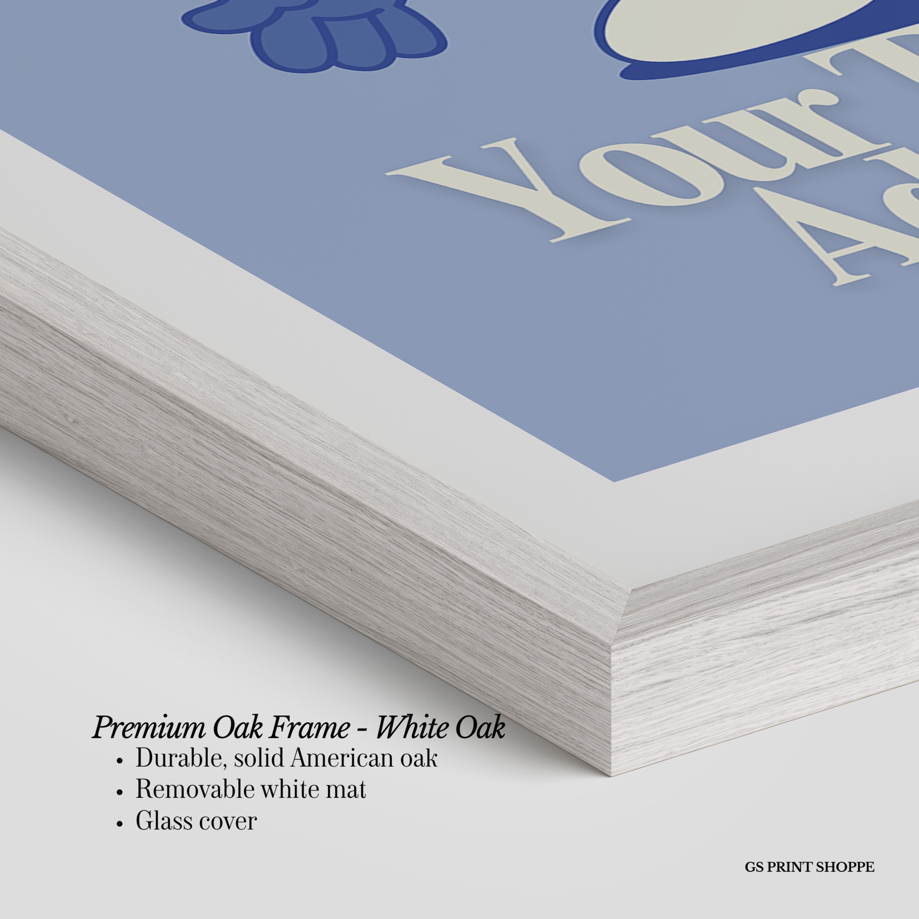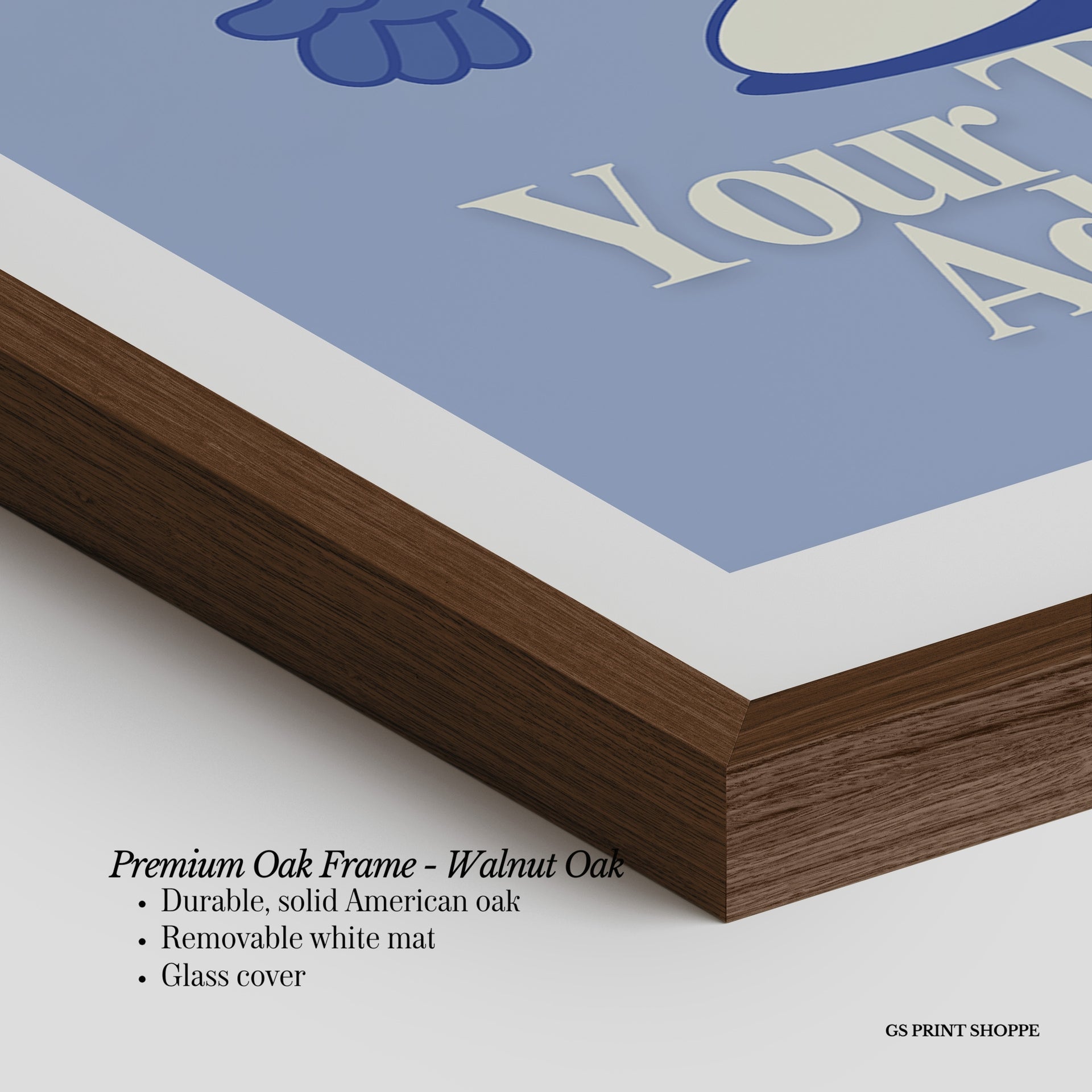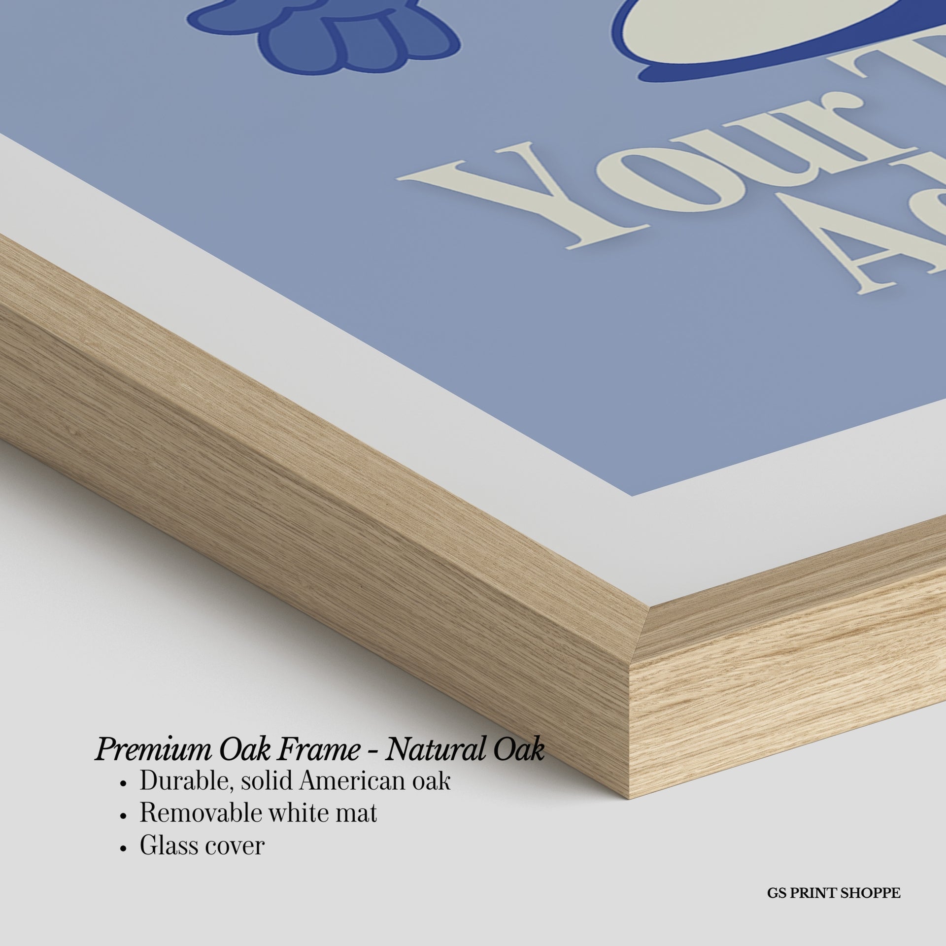 Premium Oak Frame: Our premium oak frame is crafted from solid American oak, offering a warm, natural feel with a high-end finish. We complete this elevated offering with a bright white removable mat and real glass for a versatile and polished look.