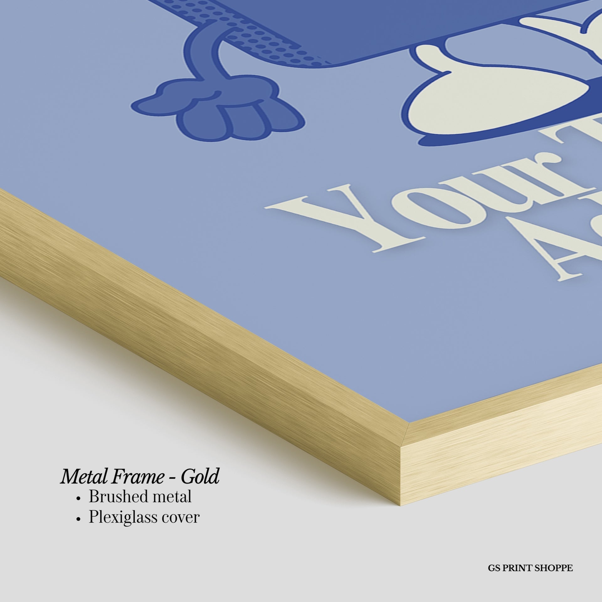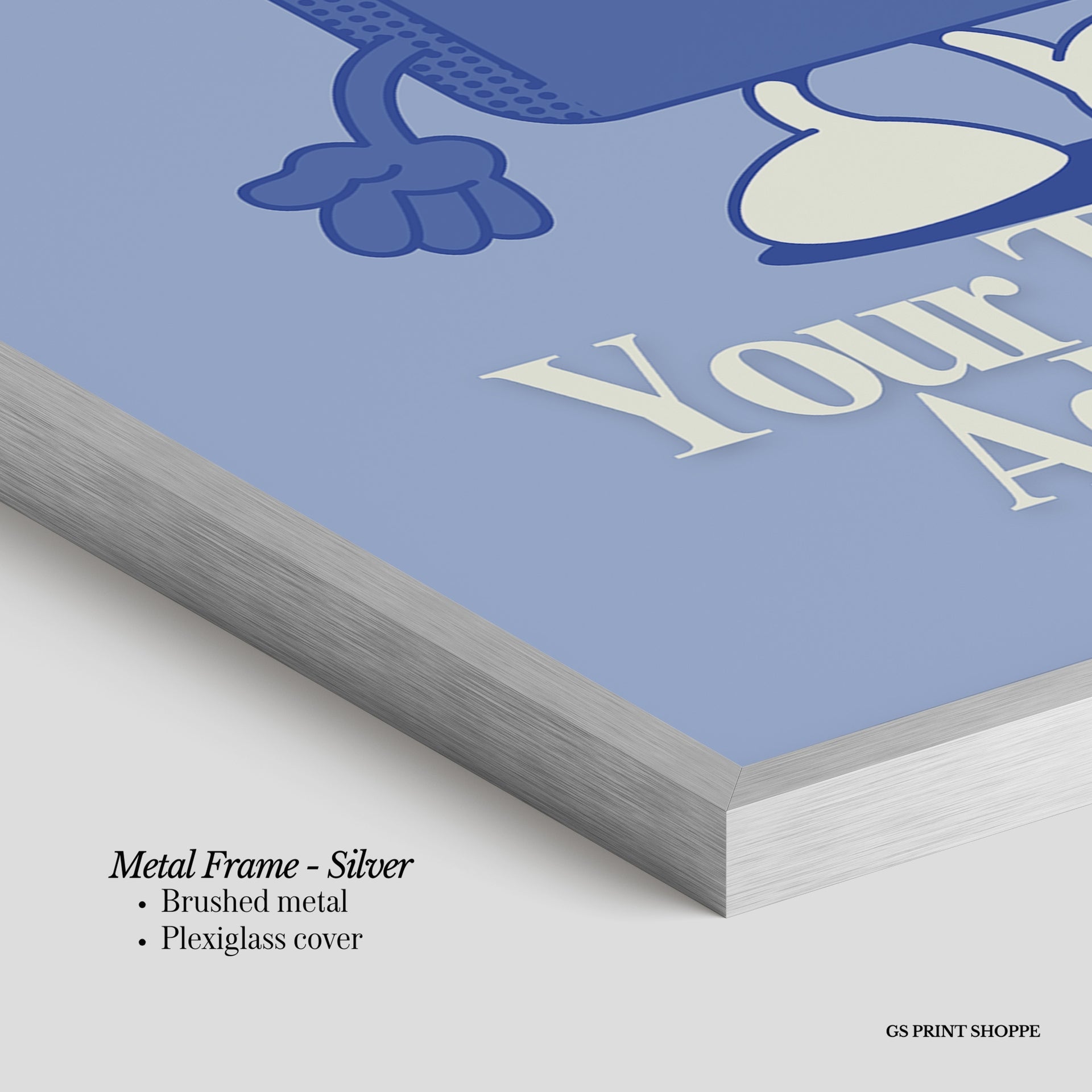 Metal Frame: Sleek and modern, our metal frame is crafted with brushed metal for a polished finish. It comes with durable plexiglass and sturdy metal hangers for horizontal or vertical display.