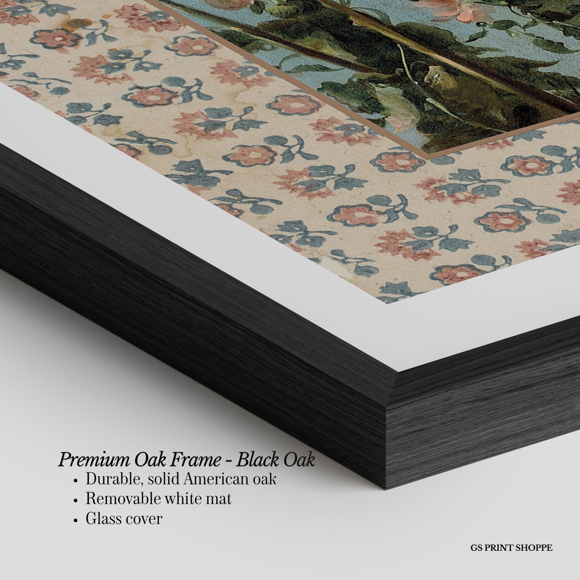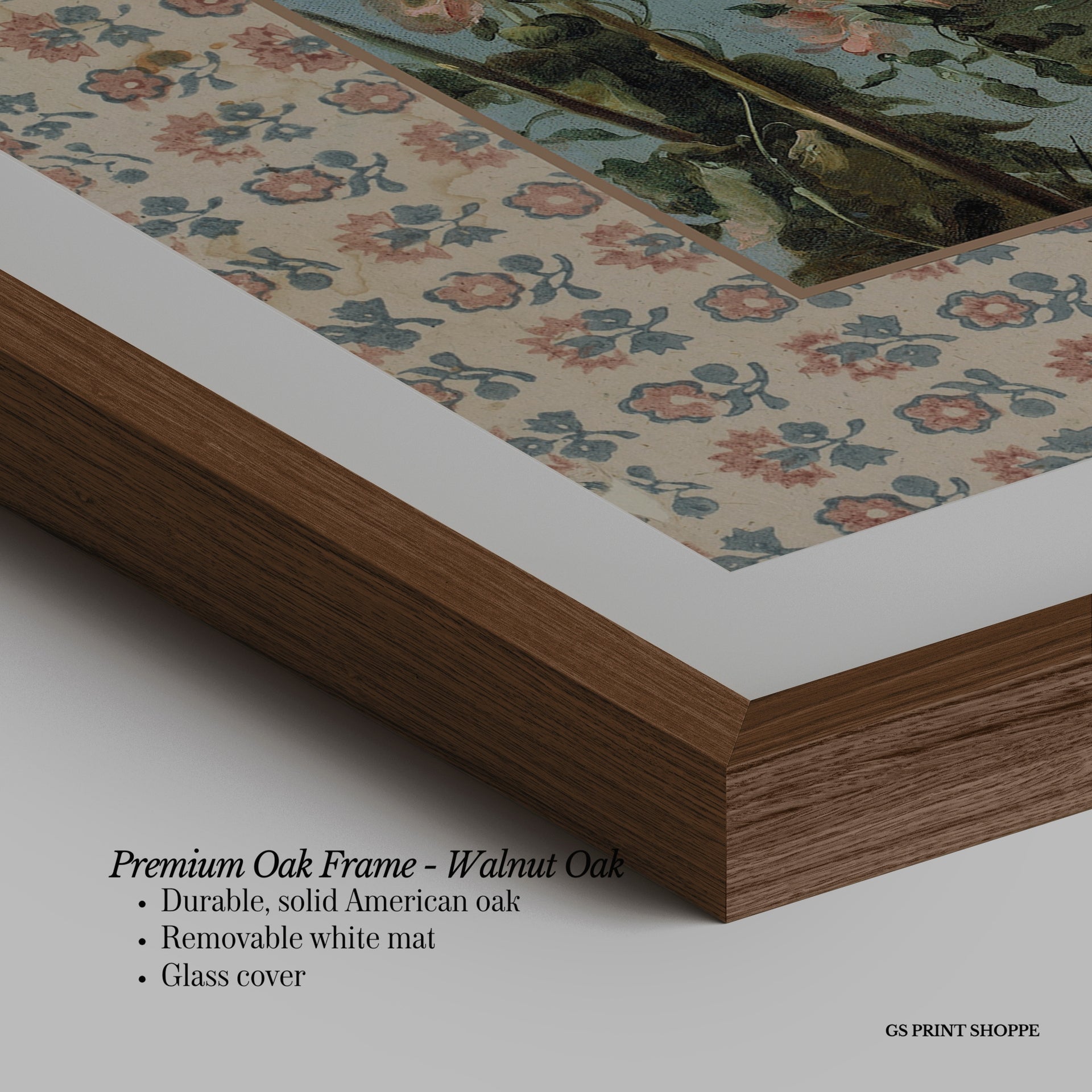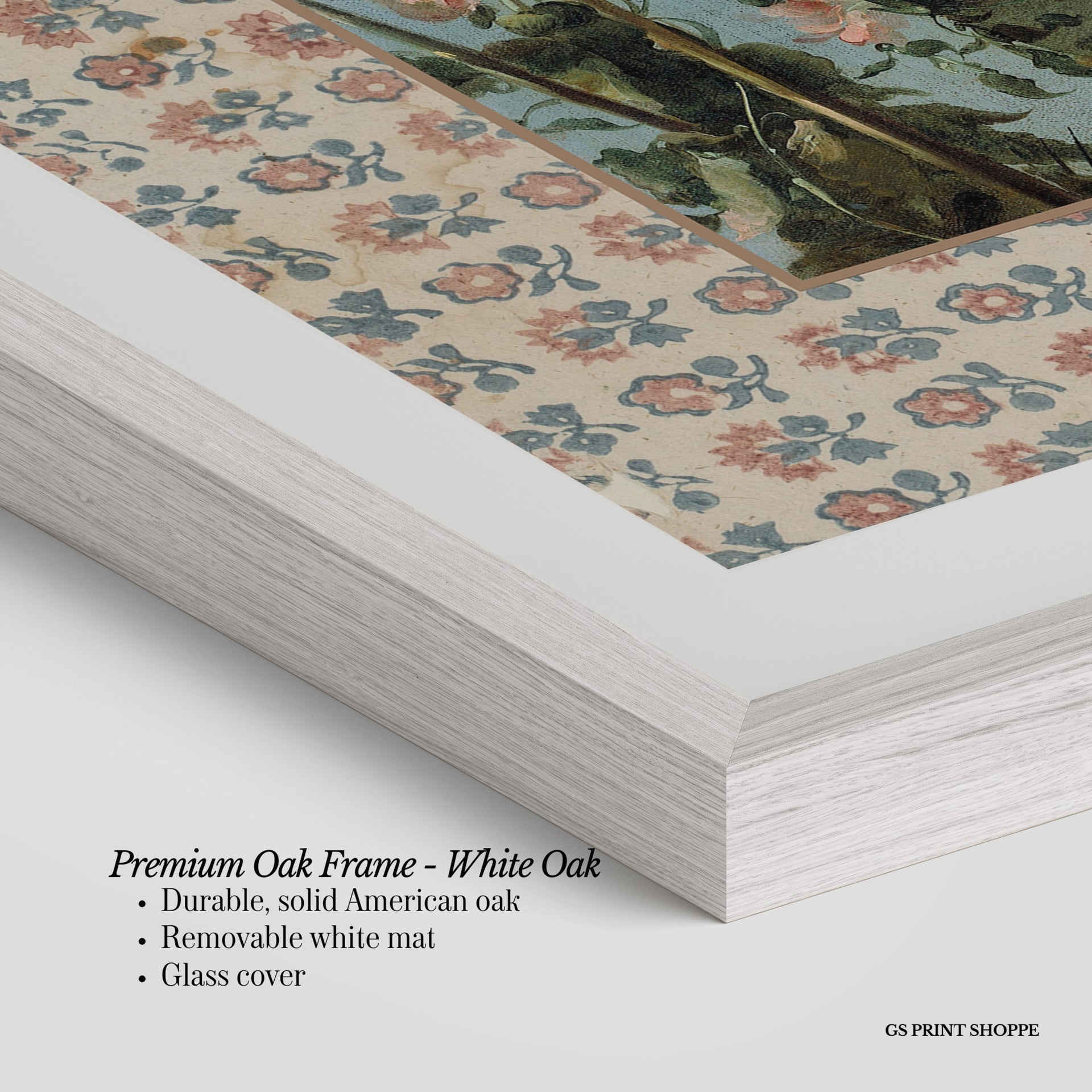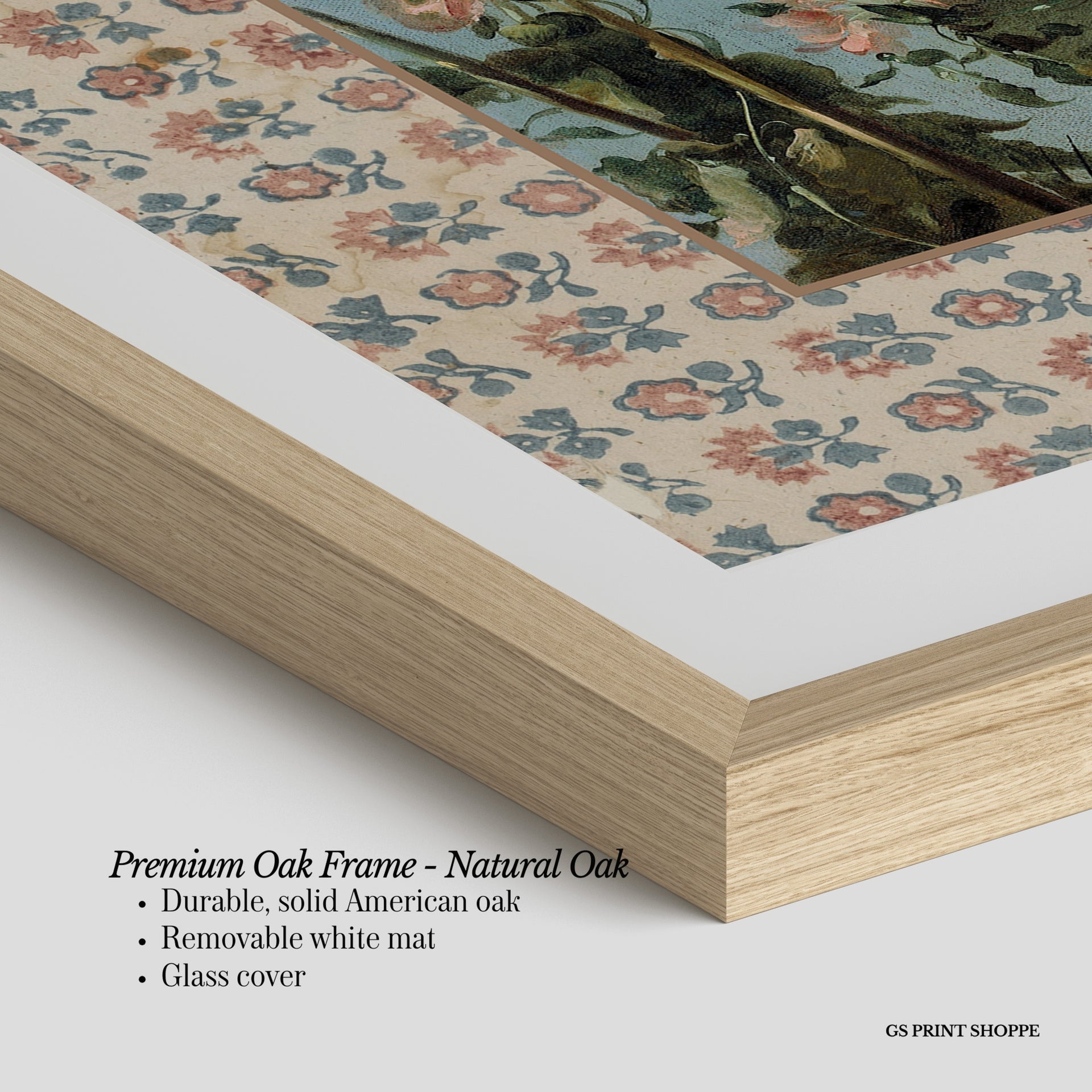 Premium Oak Frame: Our premium oak frame is crafted from solid American oak, offering a warm, natural feel with a high-end finish. We complete this elevated offering with a bright white removable mat and real glass for a versatile and polished look.