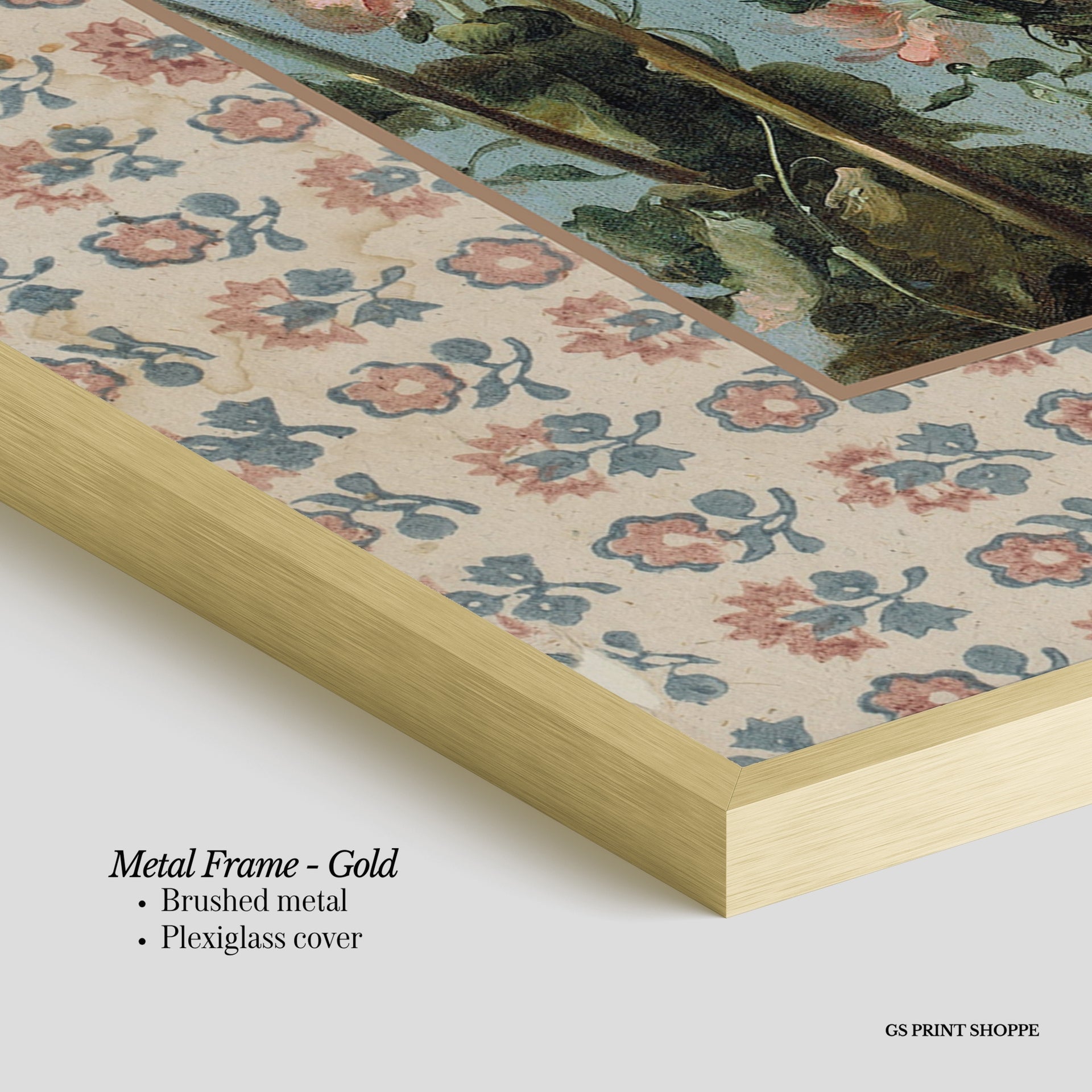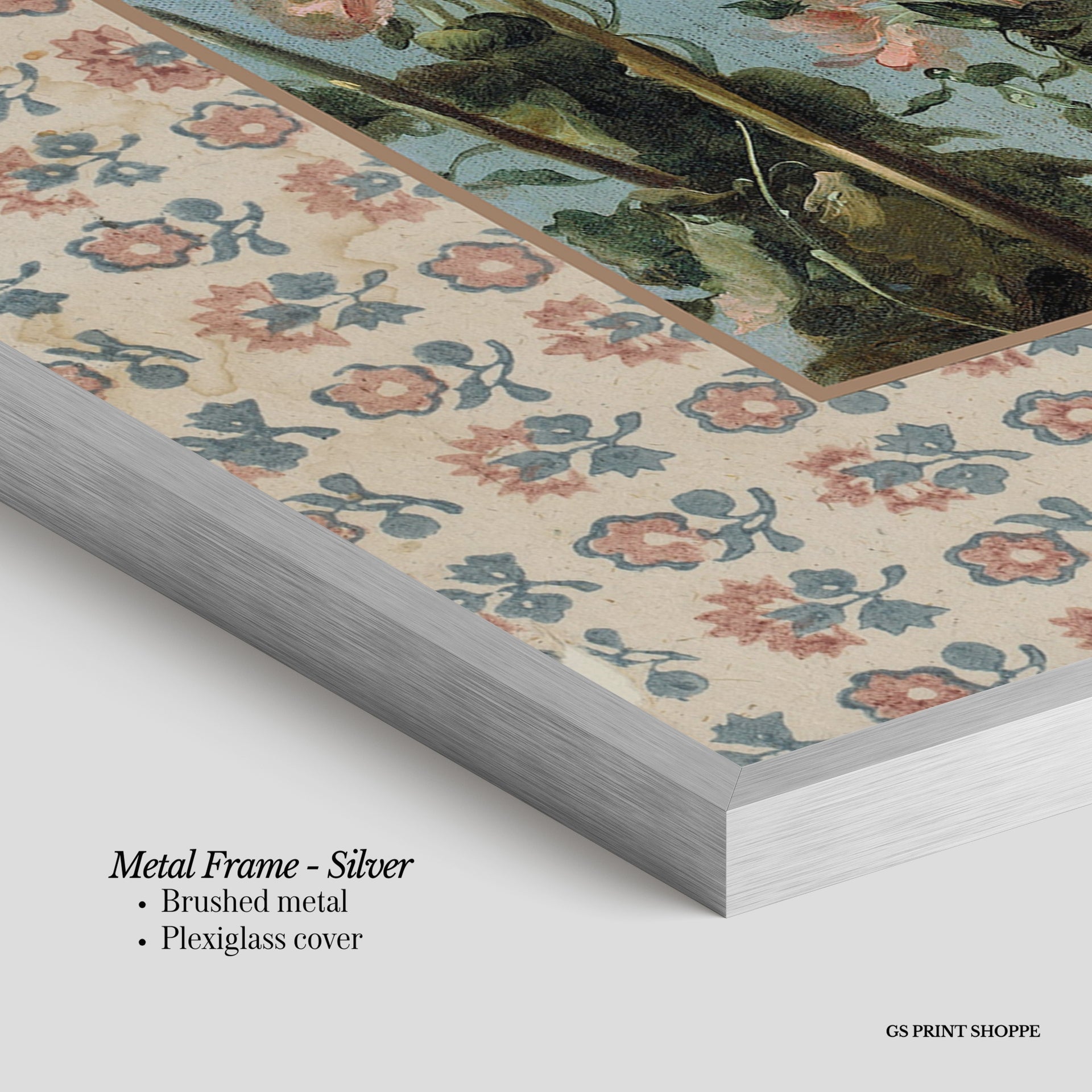Metal Frame: Sleek and modern, our metal frame is crafted with brushed metal for a polished finish. It comes with durable plexiglass and sturdy metal hangers for horizontal or vertical display.