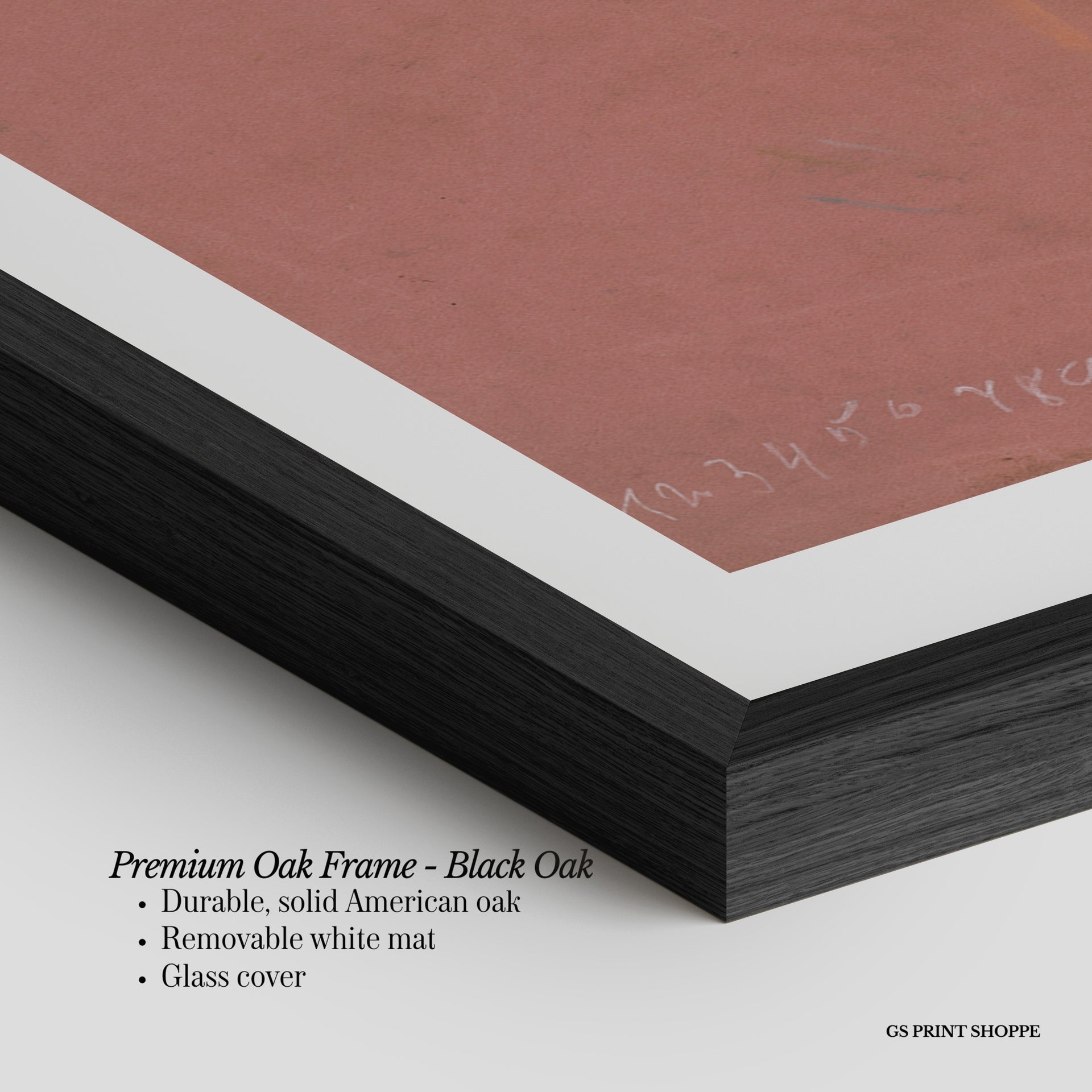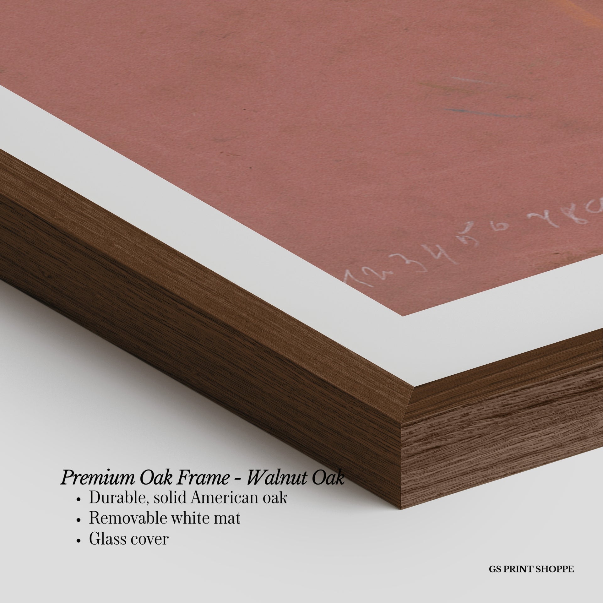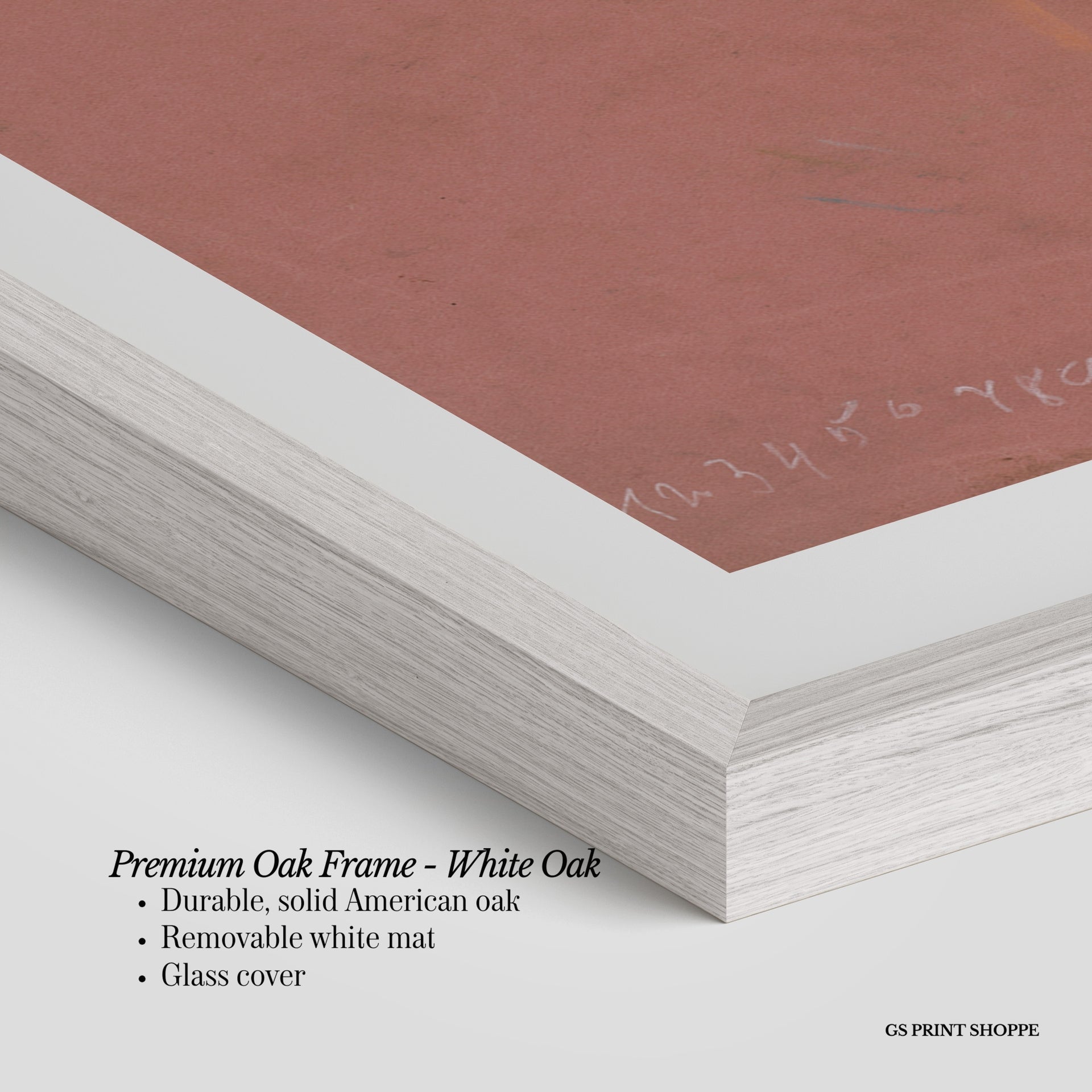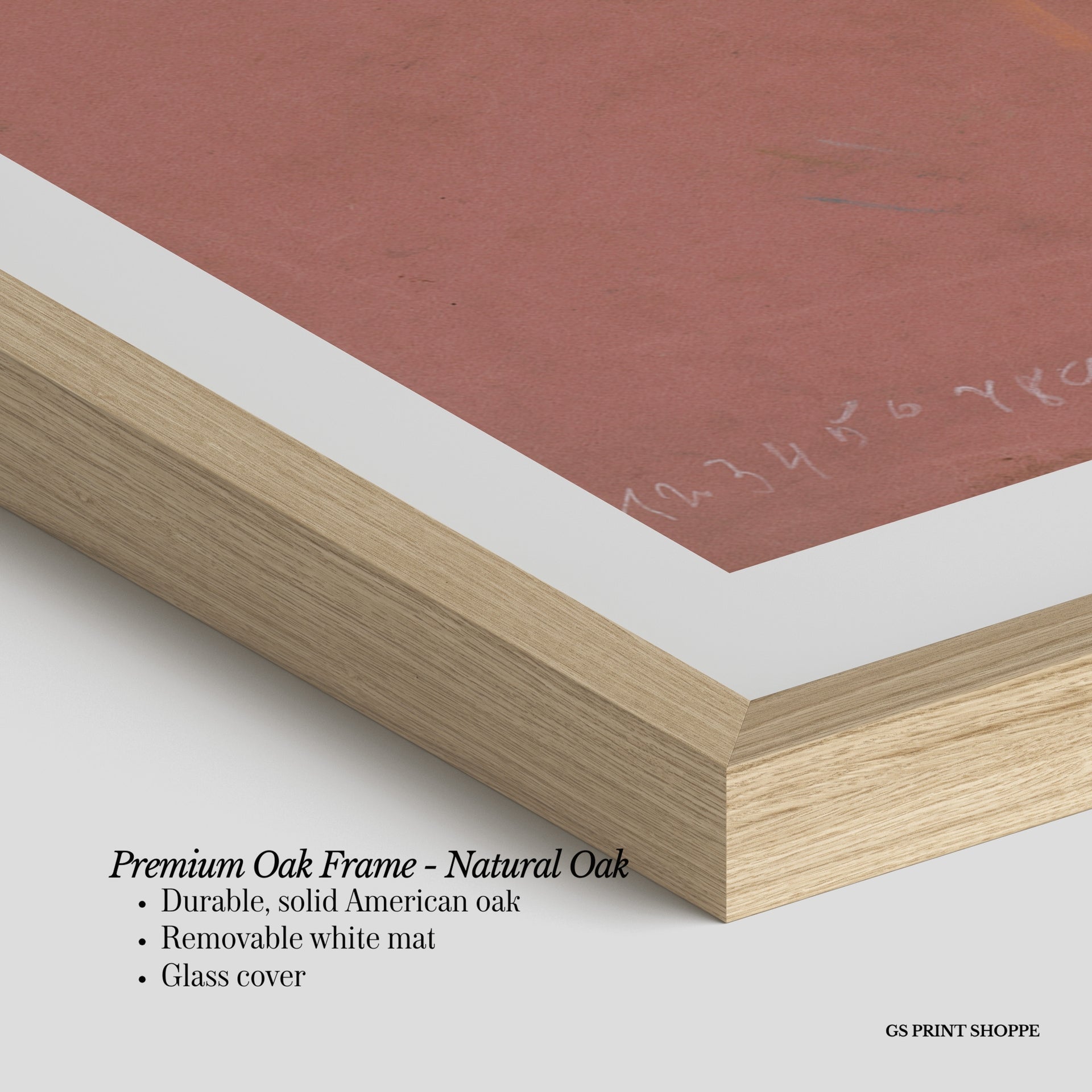 Premium Oak Frame: Our premium oak frame is crafted from solid American oak, offering a warm, natural feel with a high-end finish. We complete this elevated offering with a bright white removable mat and real glass for a versatile and polished look.