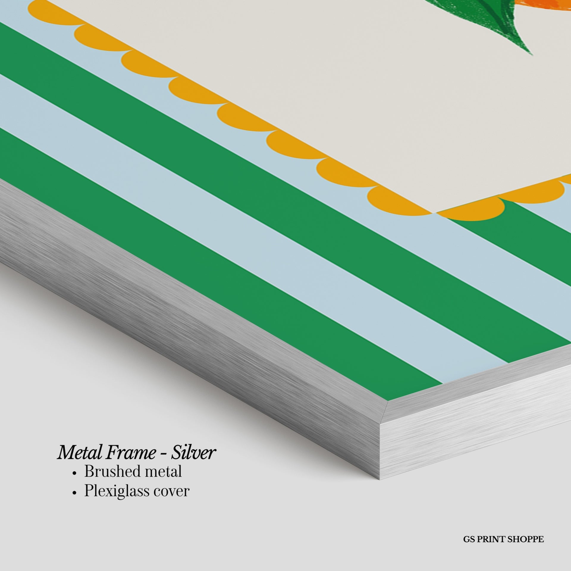 Metal Frame: Sleek and modern, our metal frame is crafted with brushed metal for a polished finish. It comes with durable plexiglass and sturdy metal hangers for horizontal or vertical display.