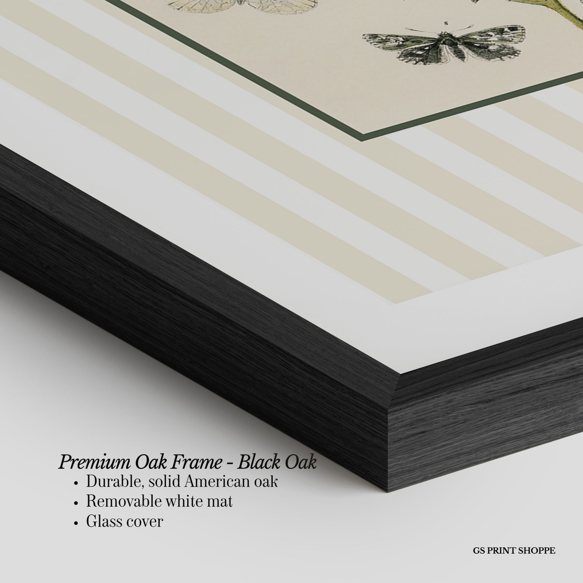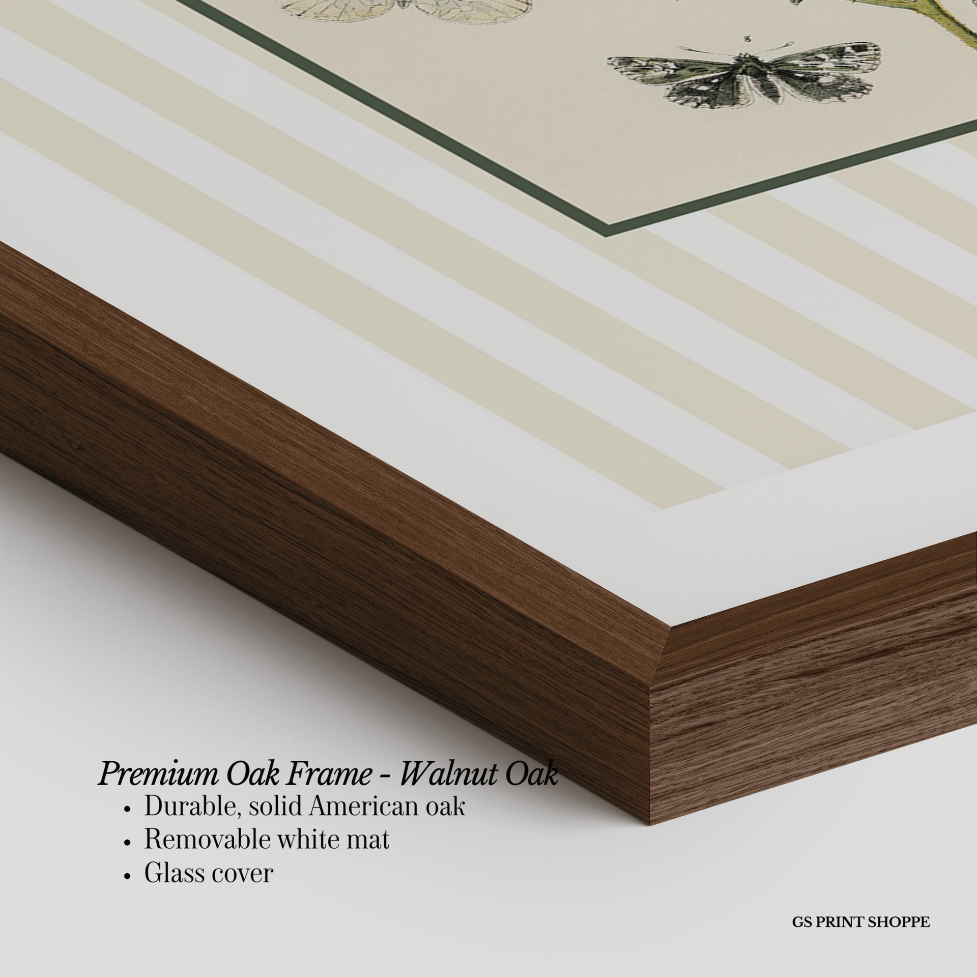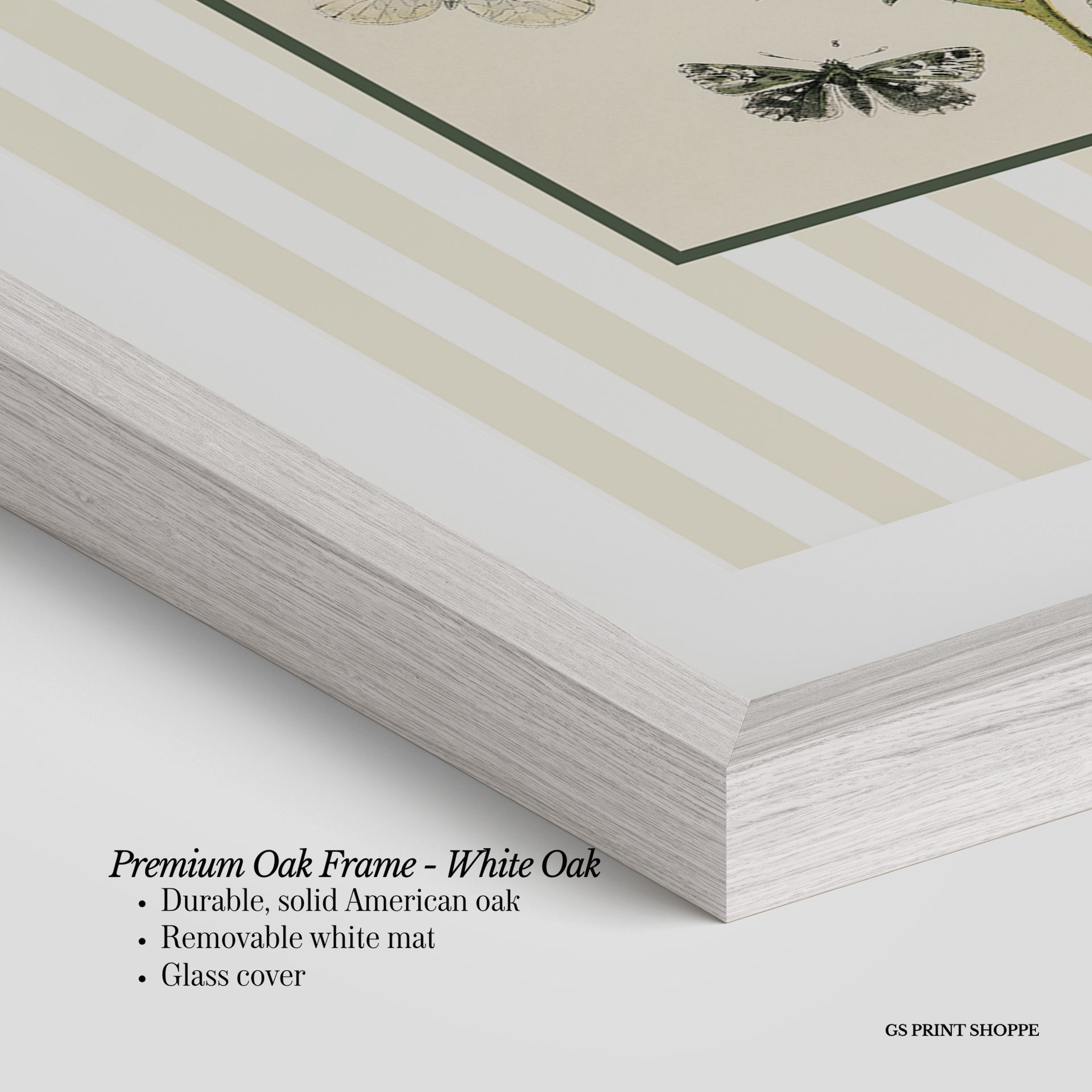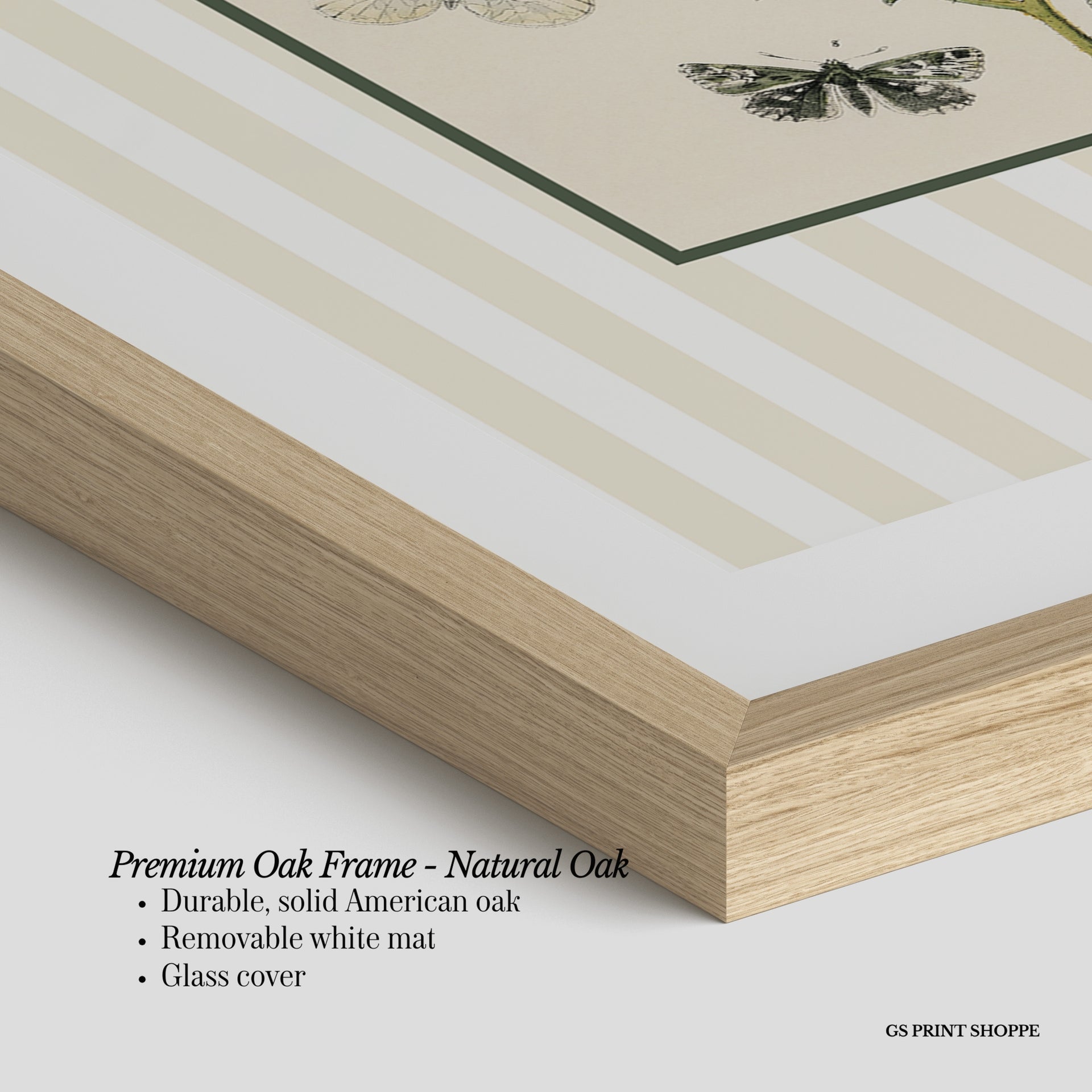 Premium Oak Frame: Our premium oak frame is crafted from solid American oak, offering a warm, natural feel with a high-end finish. We complete this elevated offering with a bright white removable mat and real glass for a versatile and polished look.