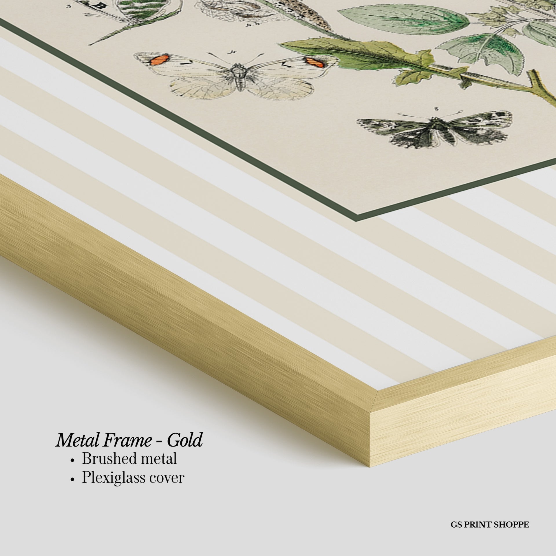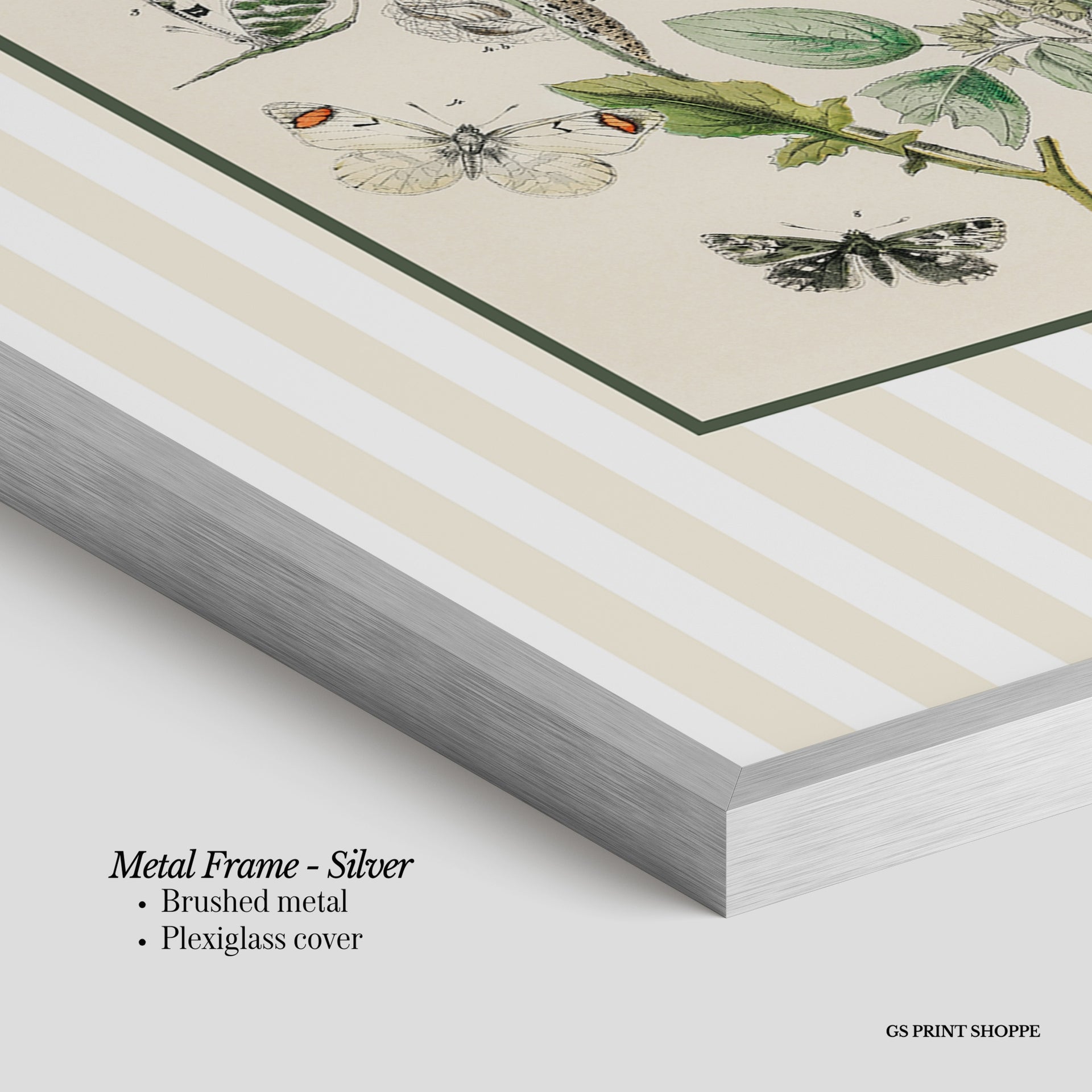 Metal Frame: Sleek and modern, our metal frame is crafted with brushed metal for a polished finish. It comes with durable plexiglass and sturdy metal hangers for horizontal or vertical display.
