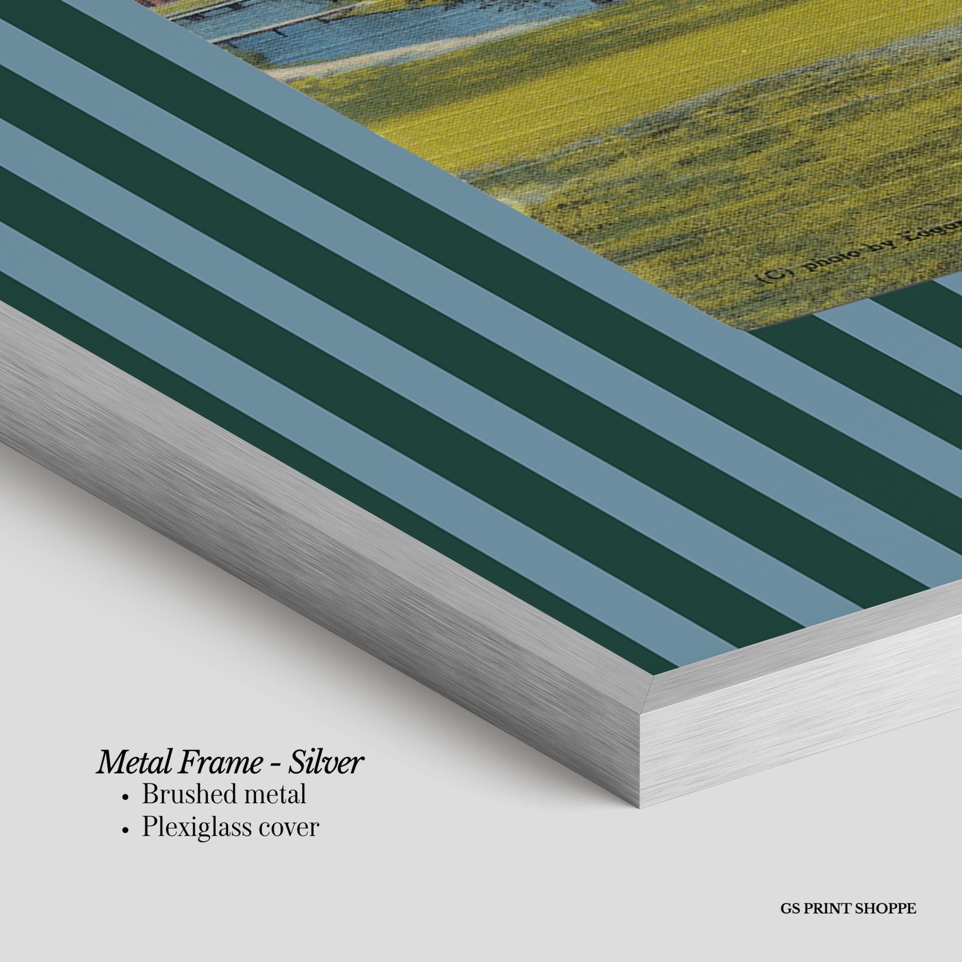 Metal Frame: Sleek and modern, our metal frame is crafted with brushed metal for a polished finish. It comes with durable plexiglass and sturdy metal hangers for horizontal or vertical display.
