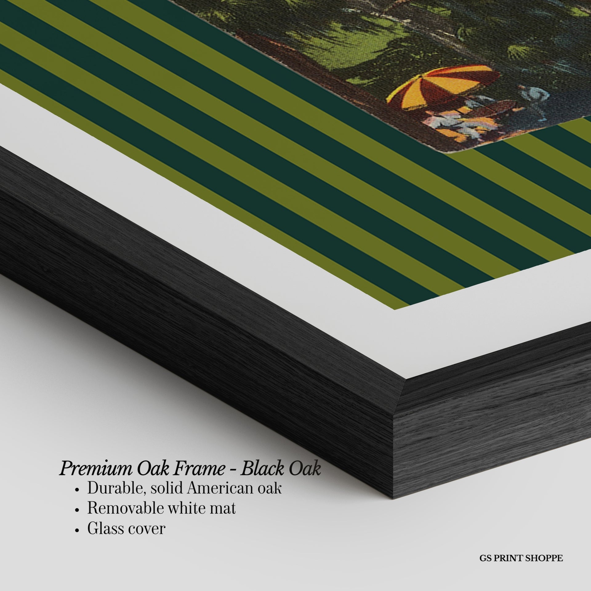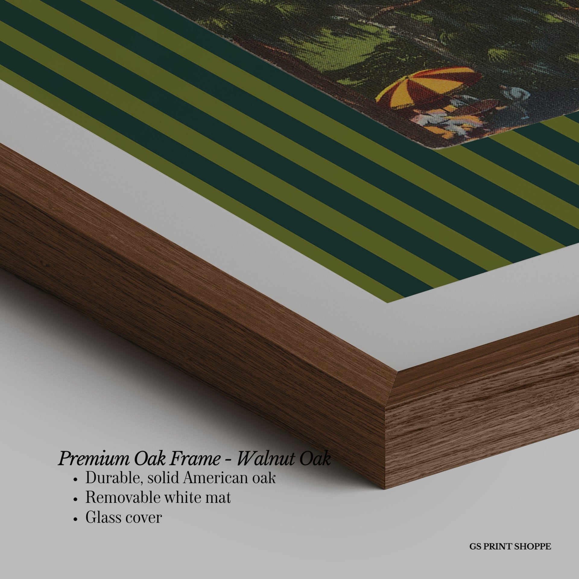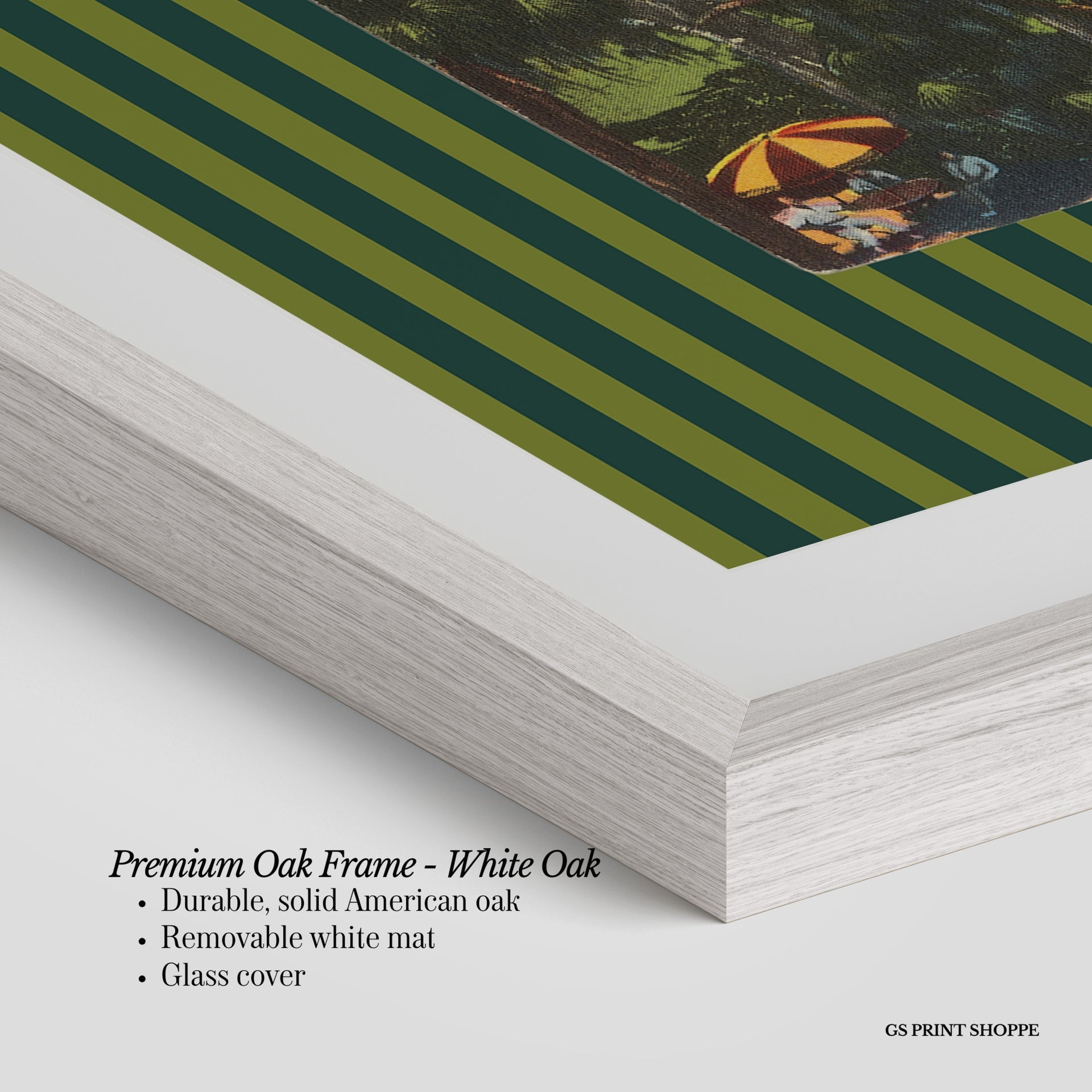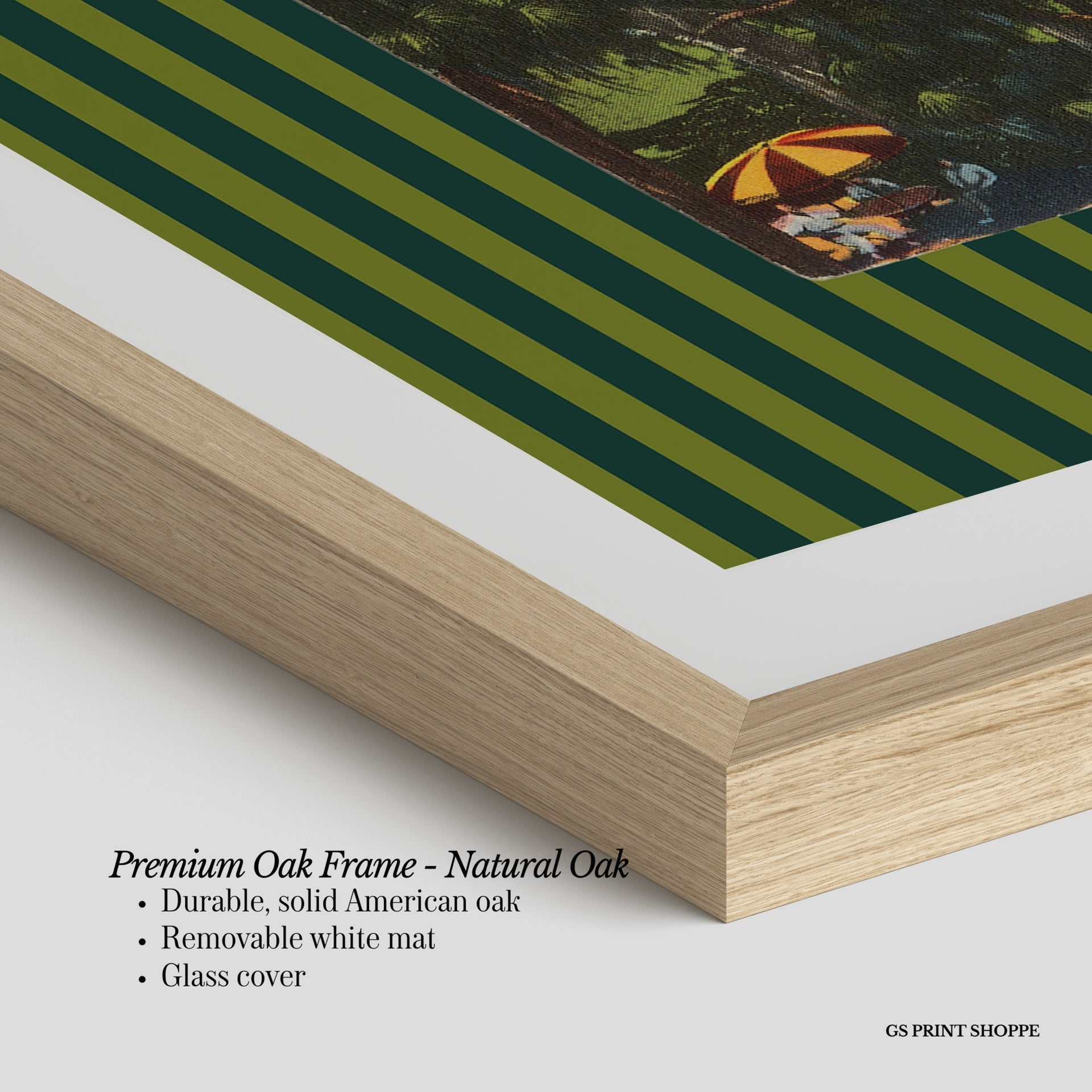 Premium Oak Frame: Our premium oak frame is crafted from solid American oak, offering a warm, natural feel with a high-end finish. We complete this elevated offering with a bright white removable mat and real glass for a versatile and polished look.