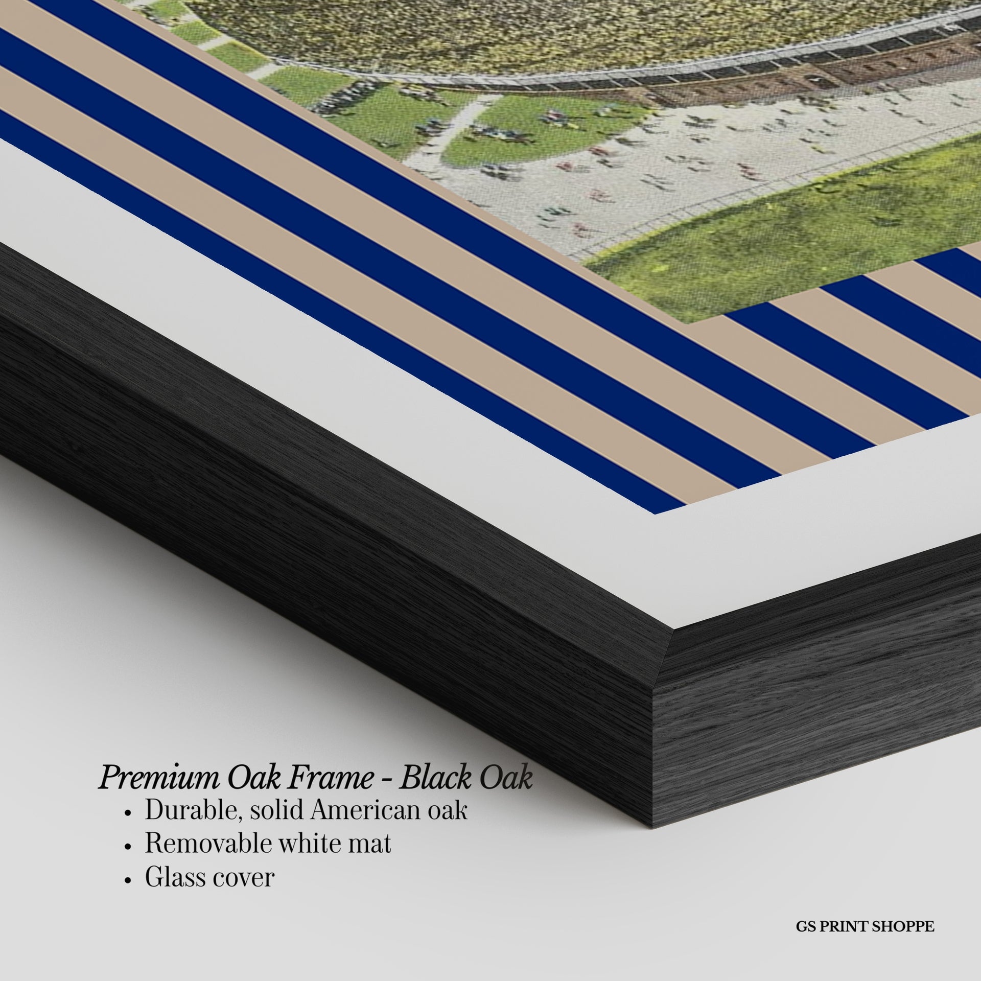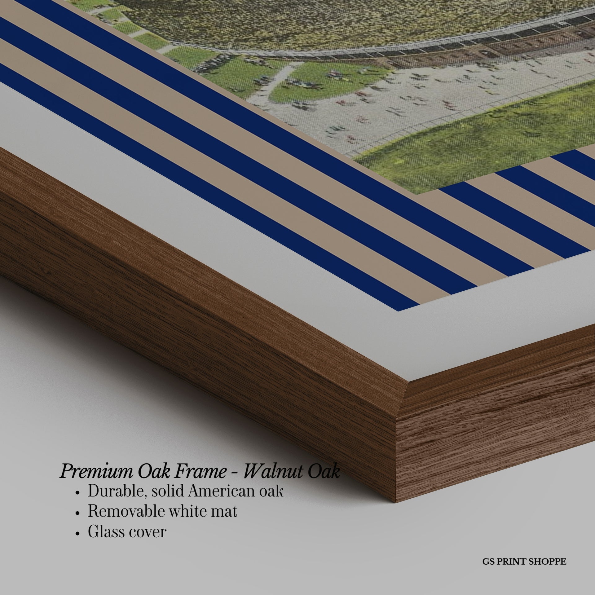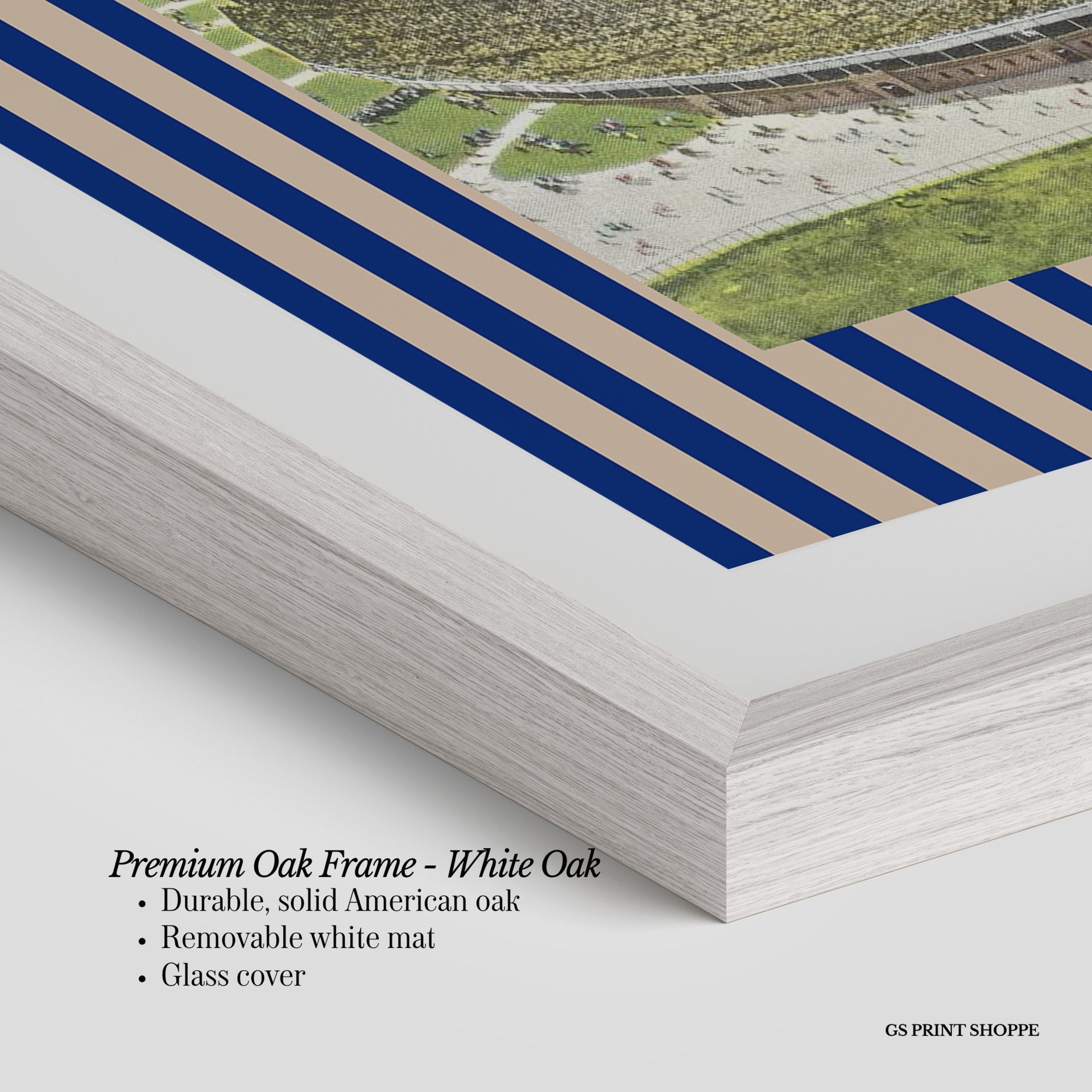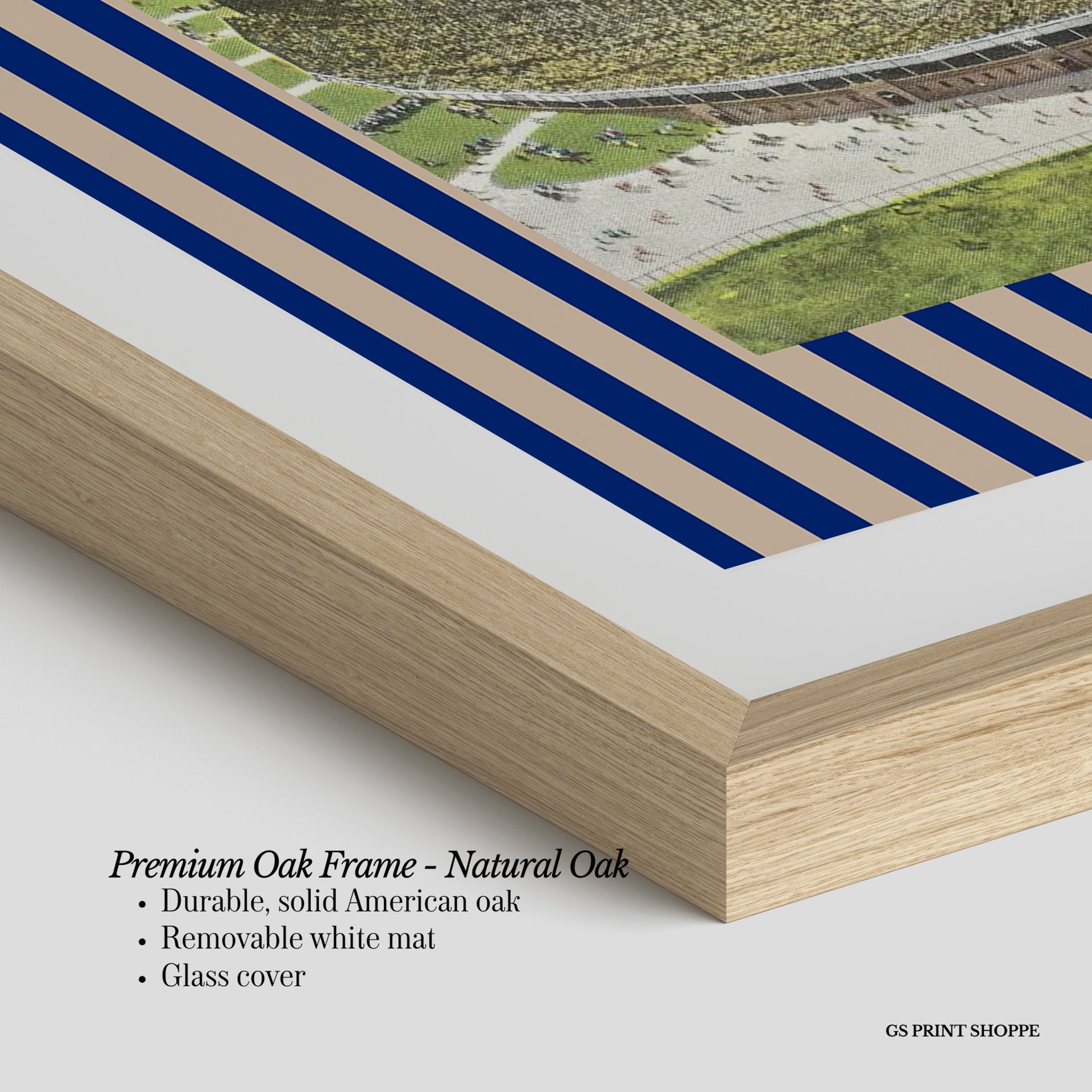 Premium Oak Frame: Our premium oak frame is crafted from solid American oak, offering a warm, natural feel with a high-end finish. We complete this elevated offering with a bright white removable mat and real glass for a versatile and polished look.