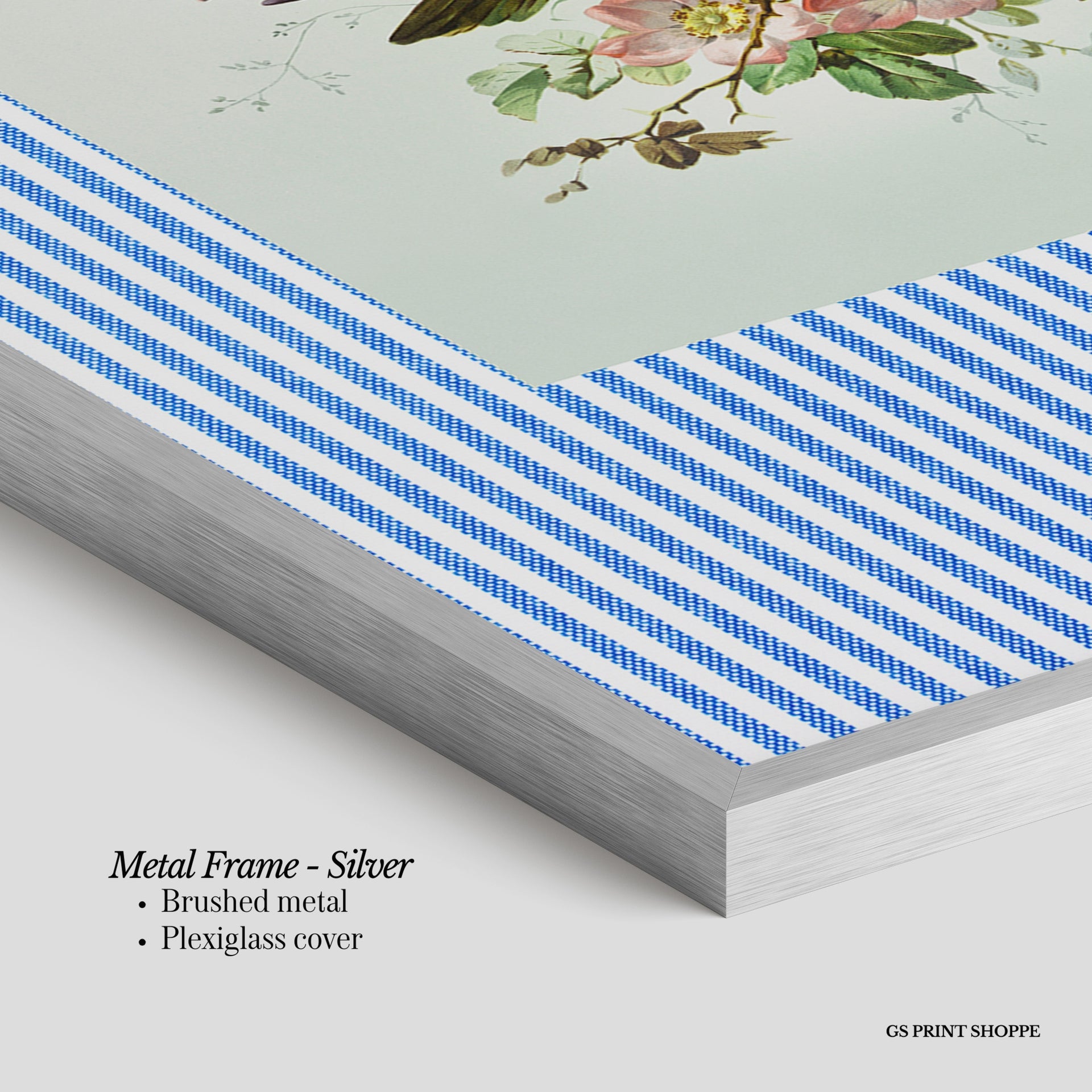 Metal Frame: Sleek and modern, our metal frame is crafted with brushed metal for a polished finish. It comes with durable plexiglass and sturdy metal hangers for horizontal or vertical display.