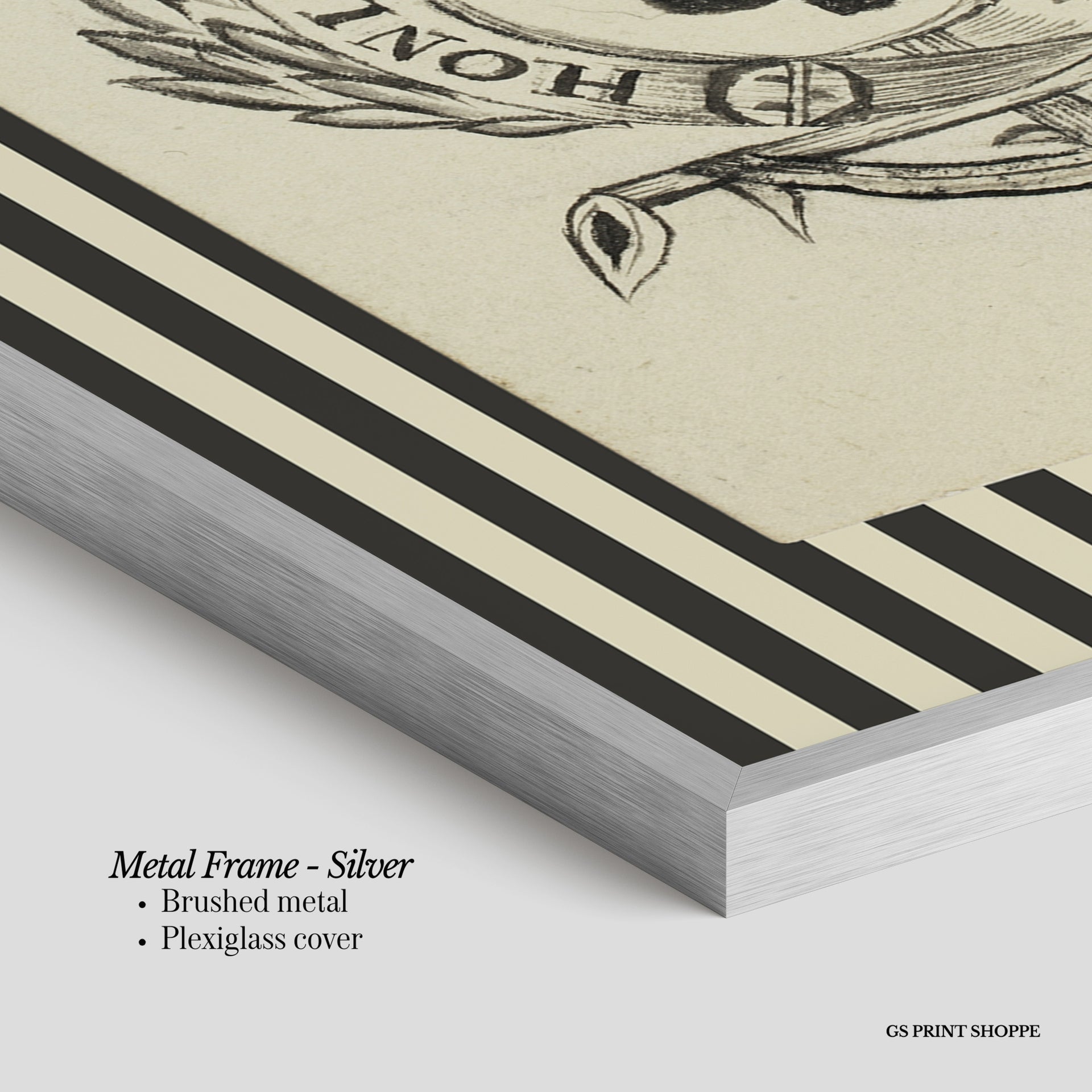Metal Frame: Sleek and modern, our metal frame is crafted with brushed metal for a polished finish. It comes with durable plexiglass and sturdy metal hangers for horizontal or vertical display.
