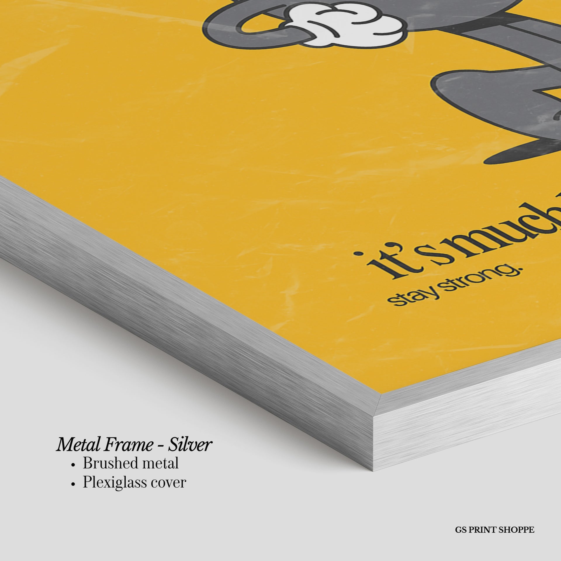 Metal Frame: Sleek and modern, our metal frame is crafted with brushed metal for a polished finish. It comes with durable plexiglass and sturdy metal hangers for horizontal or vertical display.