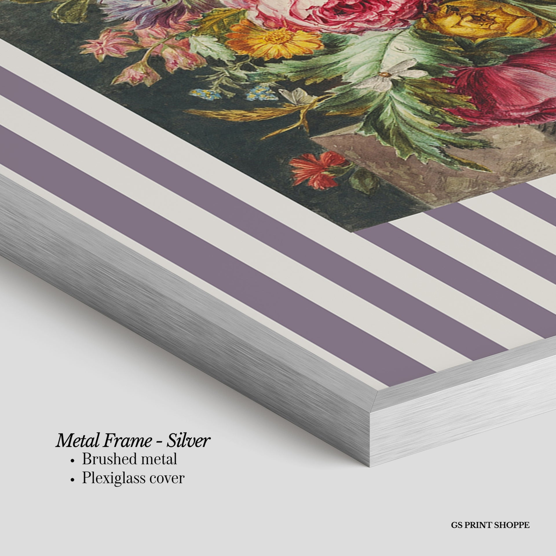 Metal Frame: Sleek and modern, our metal frame is crafted with brushed metal for a polished finish. It comes with durable plexiglass and sturdy metal hangers for horizontal or vertical display.