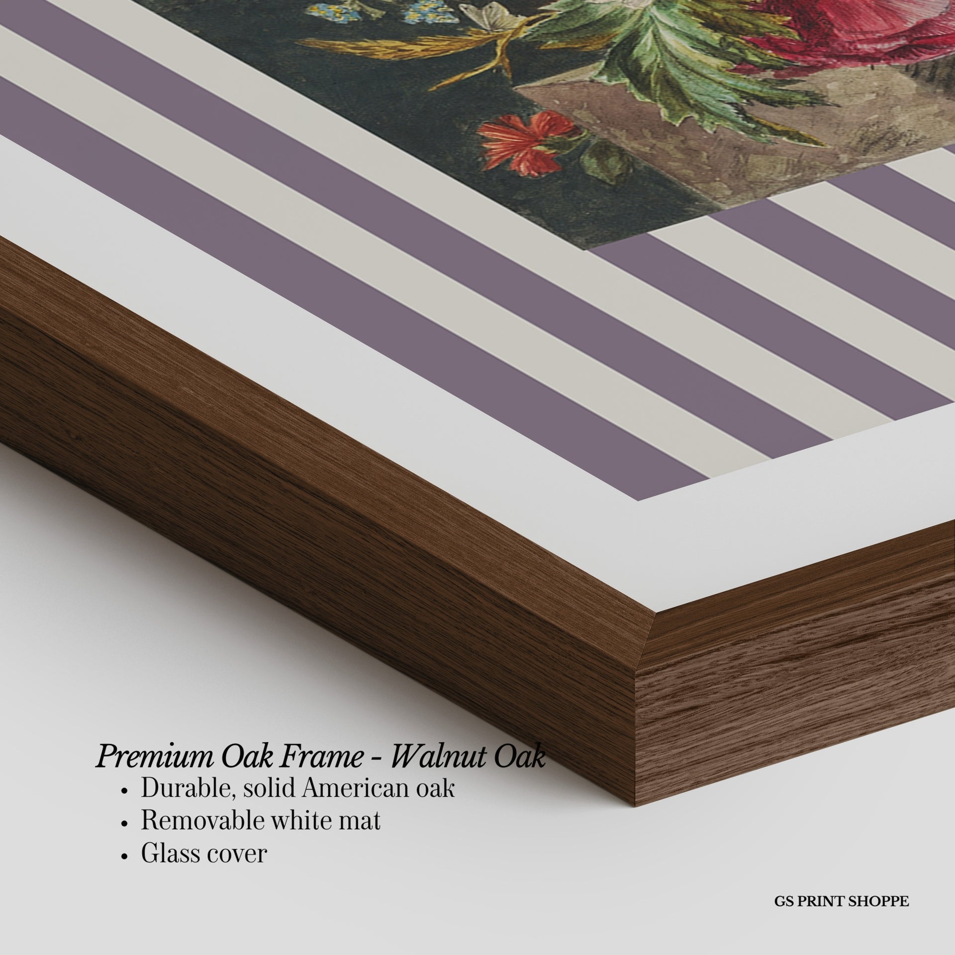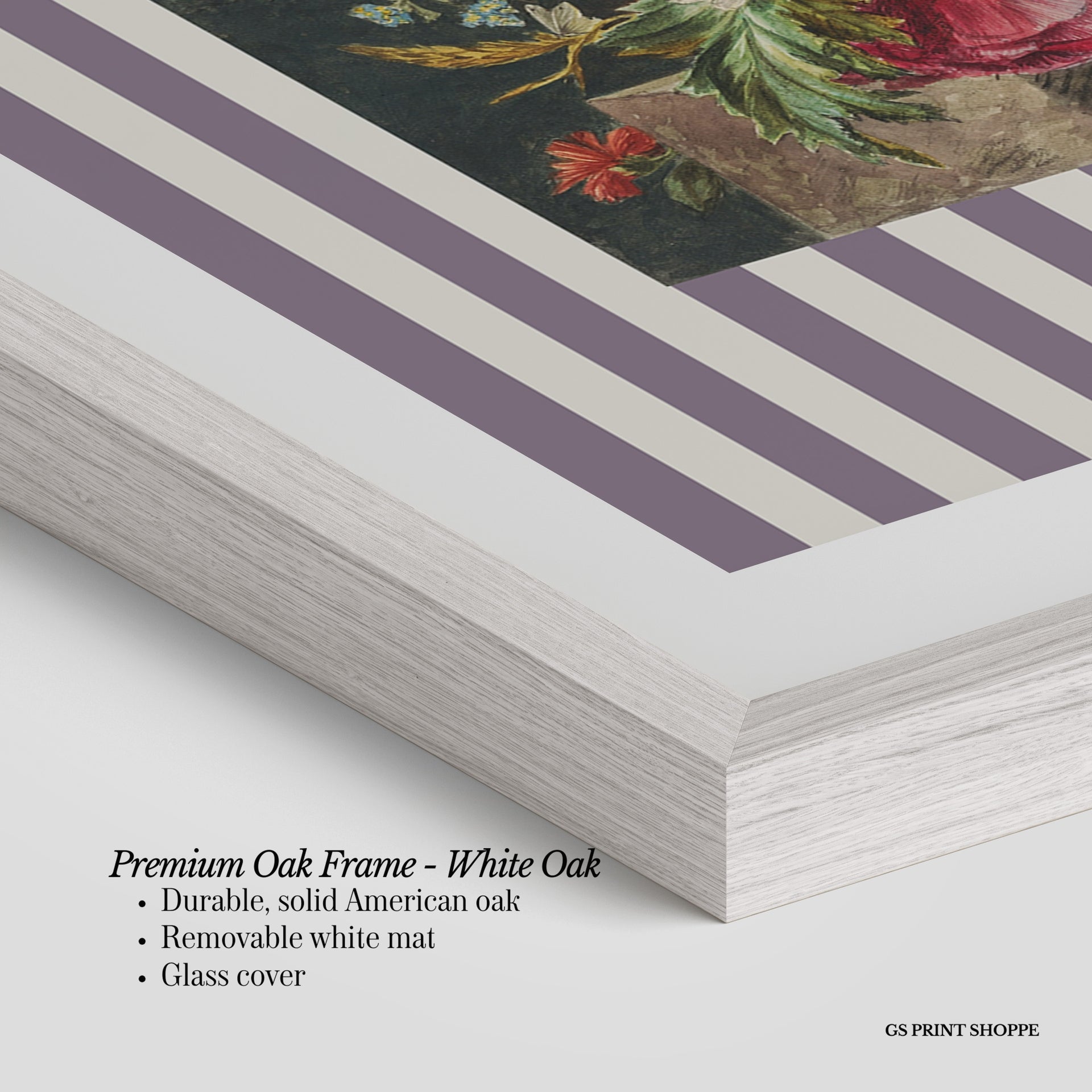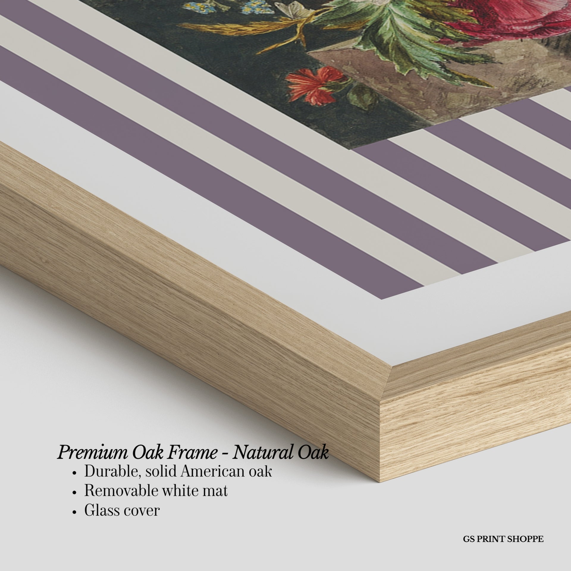 Premium Oak Frame: Our premium oak frame is crafted from solid American oak, offering a warm, natural feel with a high-end finish. We complete this elevated offering with a bright white removable mat and real glass for a versatile and polished look.