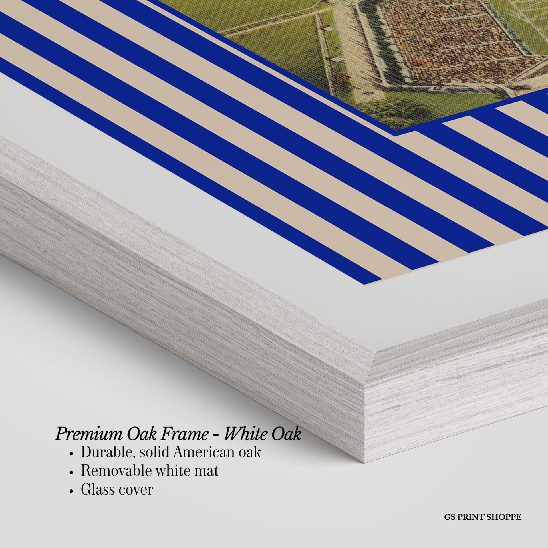 Premium Oak Frame: Our premium oak frame is crafted from solid American oak, offering a warm, natural feel with a high-end finish. We complete this elevated offering with a bright white removable mat and real glass for a versatile and polished look.