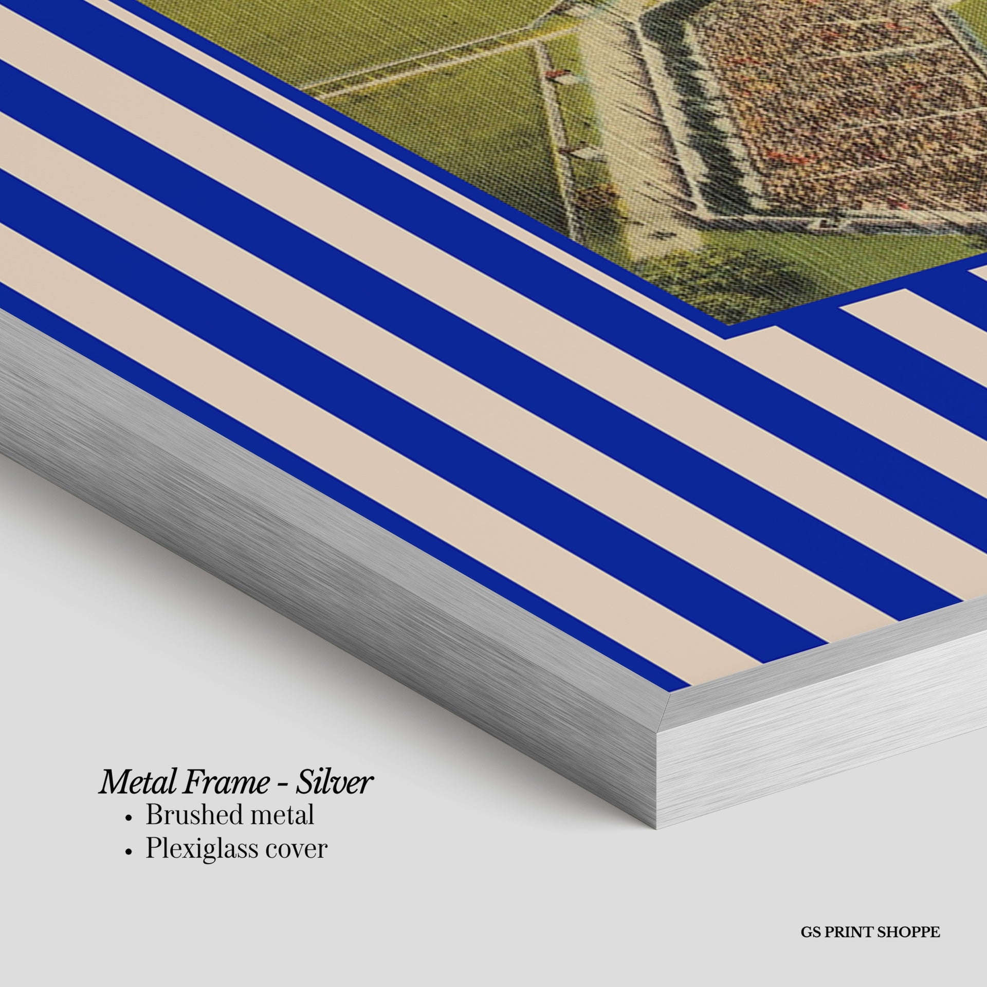 Metal Frame: Sleek and modern, our metal frame is crafted with brushed metal for a polished finish. It comes with durable plexiglass and sturdy metal hangers for horizontal or vertical display.