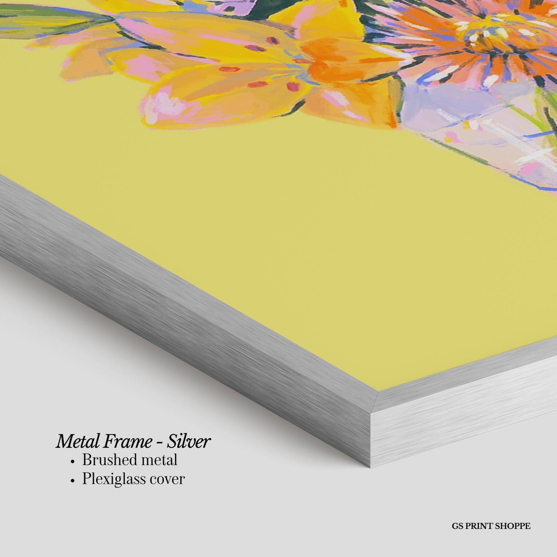 Metal Frame: Sleek and modern, our metal frame is crafted with brushed metal for a polished finish. It comes with durable plexiglass and sturdy metal hangers for horizontal or vertical display.