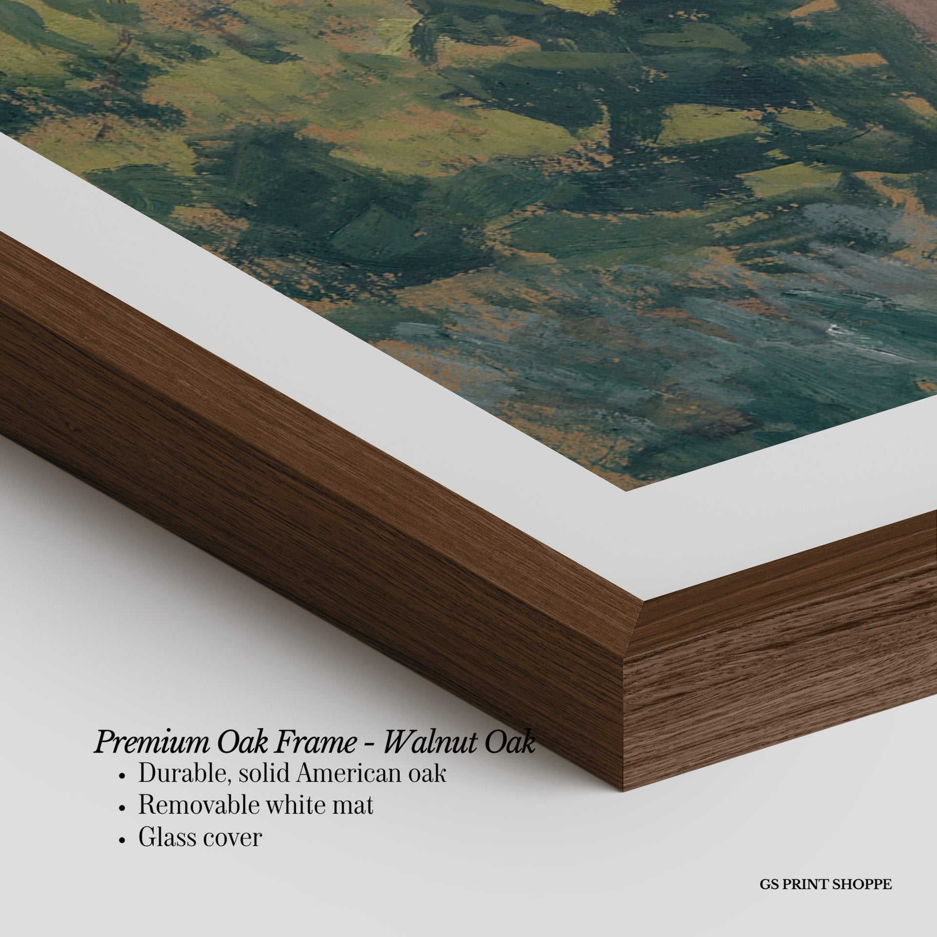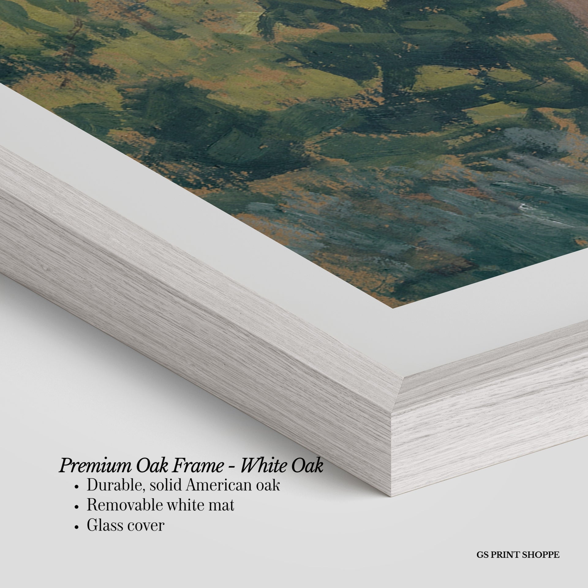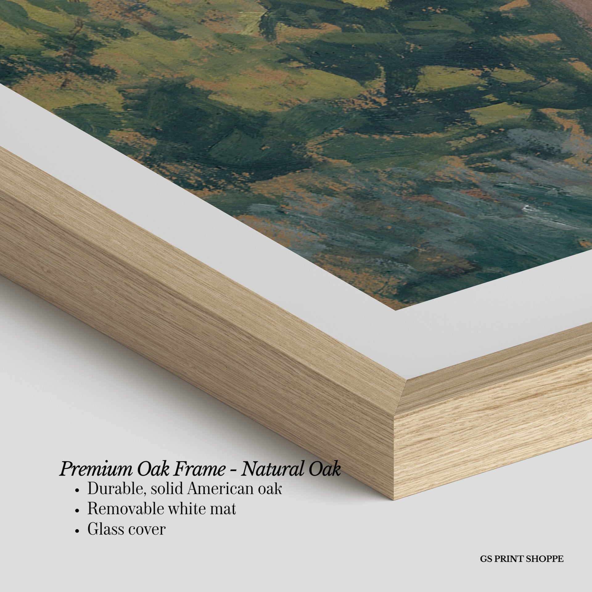Premium Oak Frame: Our premium oak frame is crafted from solid American oak, offering a warm, natural feel with a high-end finish. We complete this elevated offering with a bright white removable mat and real glass for a versatile and polished look.
